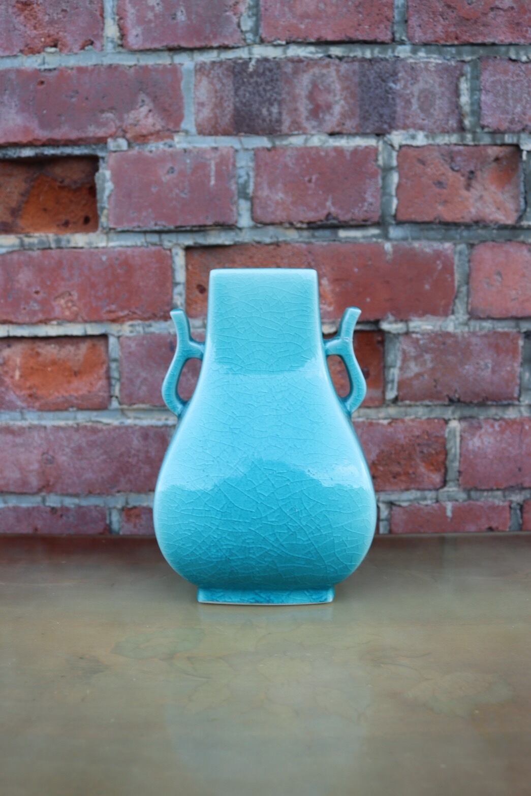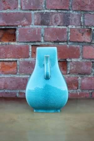 透明感のあるターコイズブルーの釉薬と、美しい貫入(Craquelure)が特徴的な双耳型花瓶。
