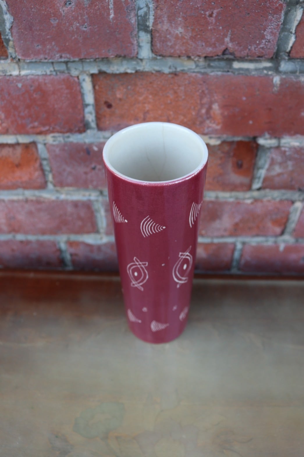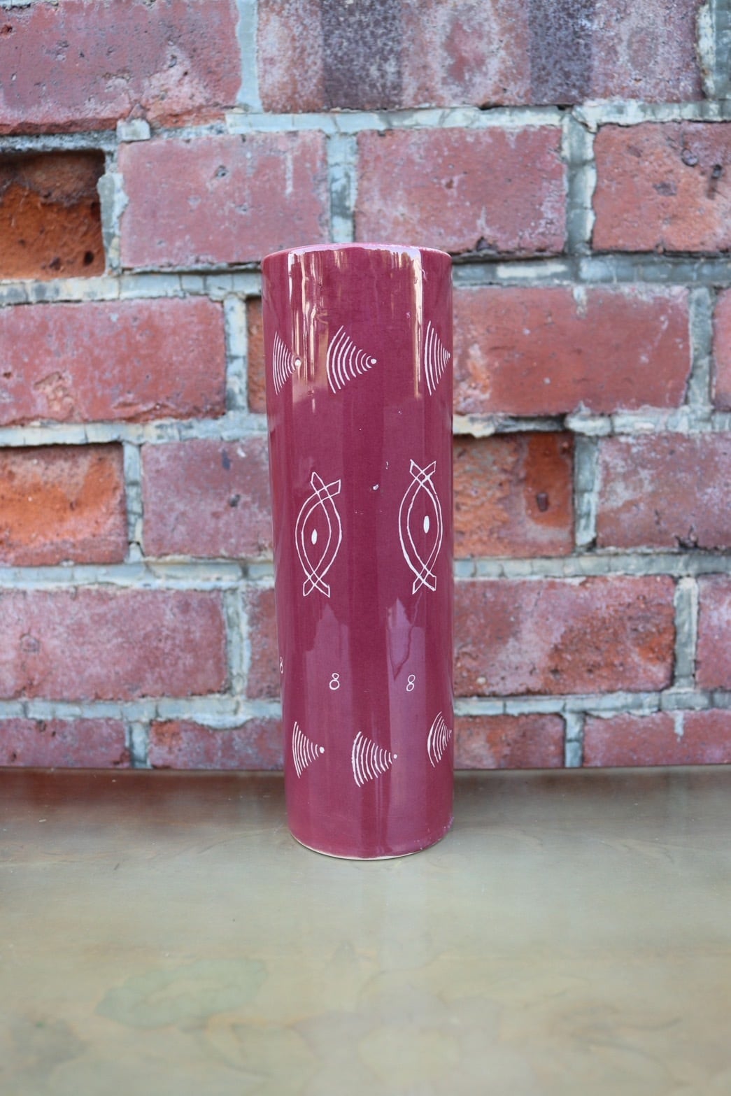 光沢のあるプラムレッドの釉薬に、抽象的な幾何学模様(魚や波を思わせる線画)が描かれています。