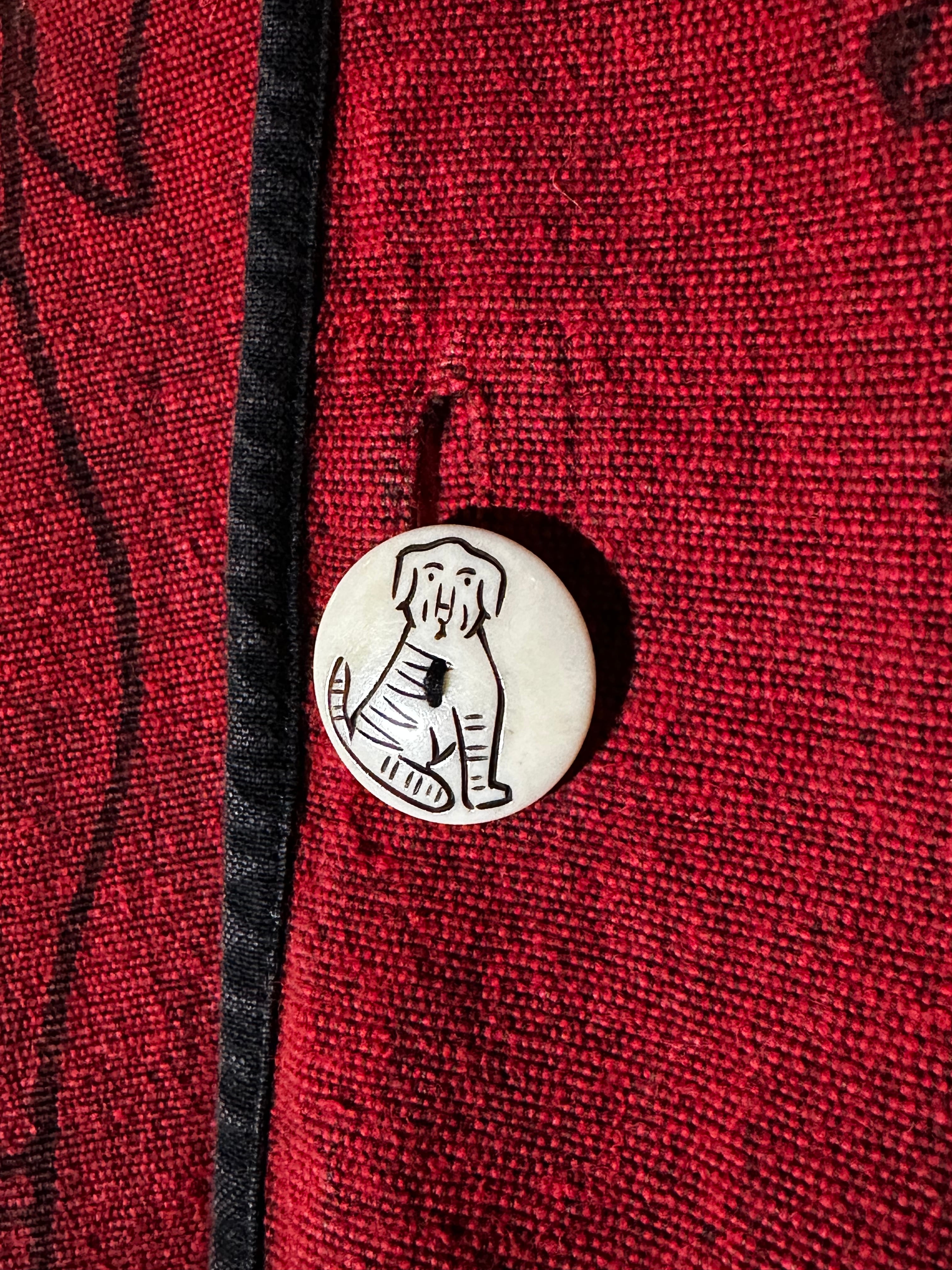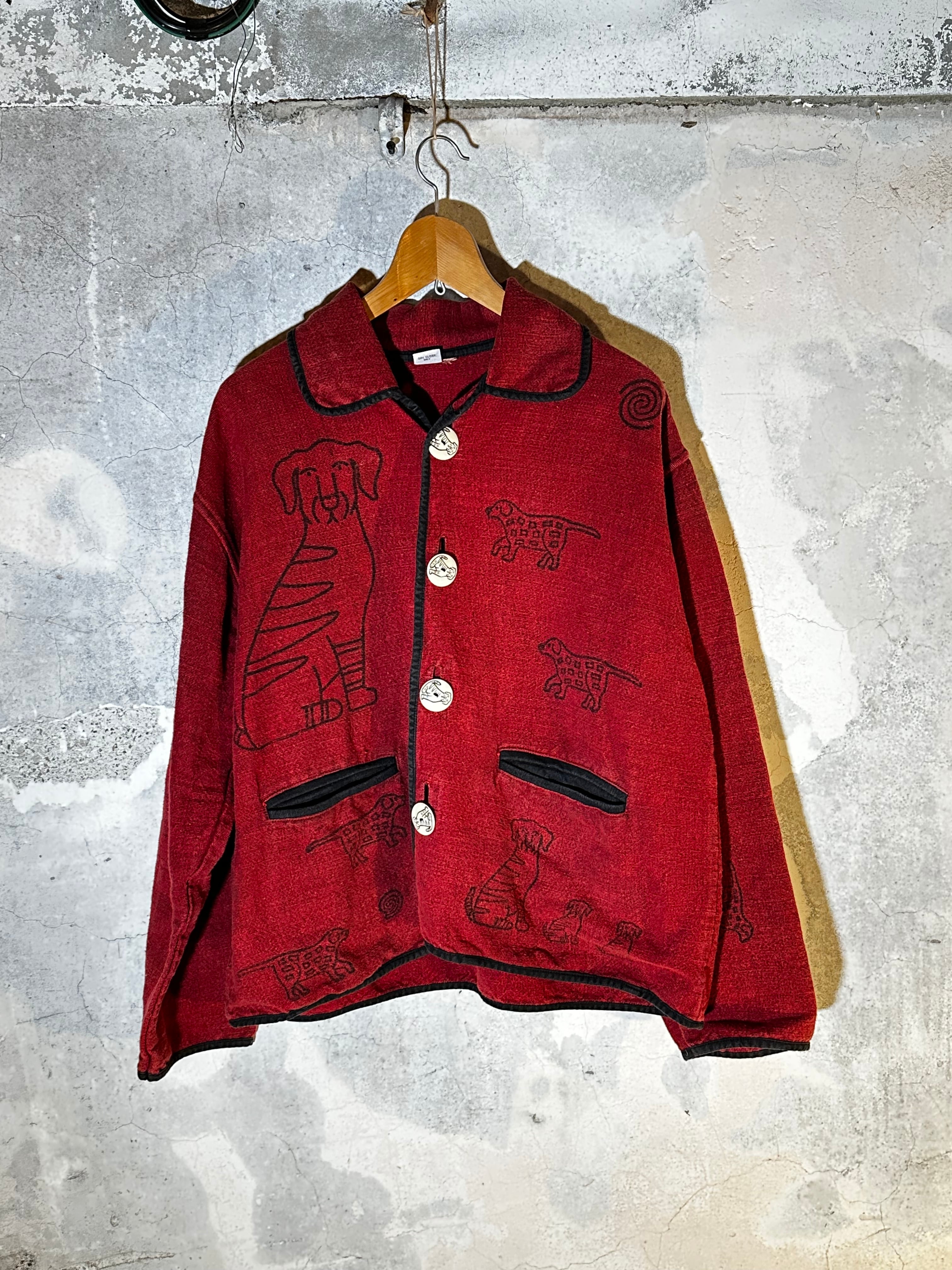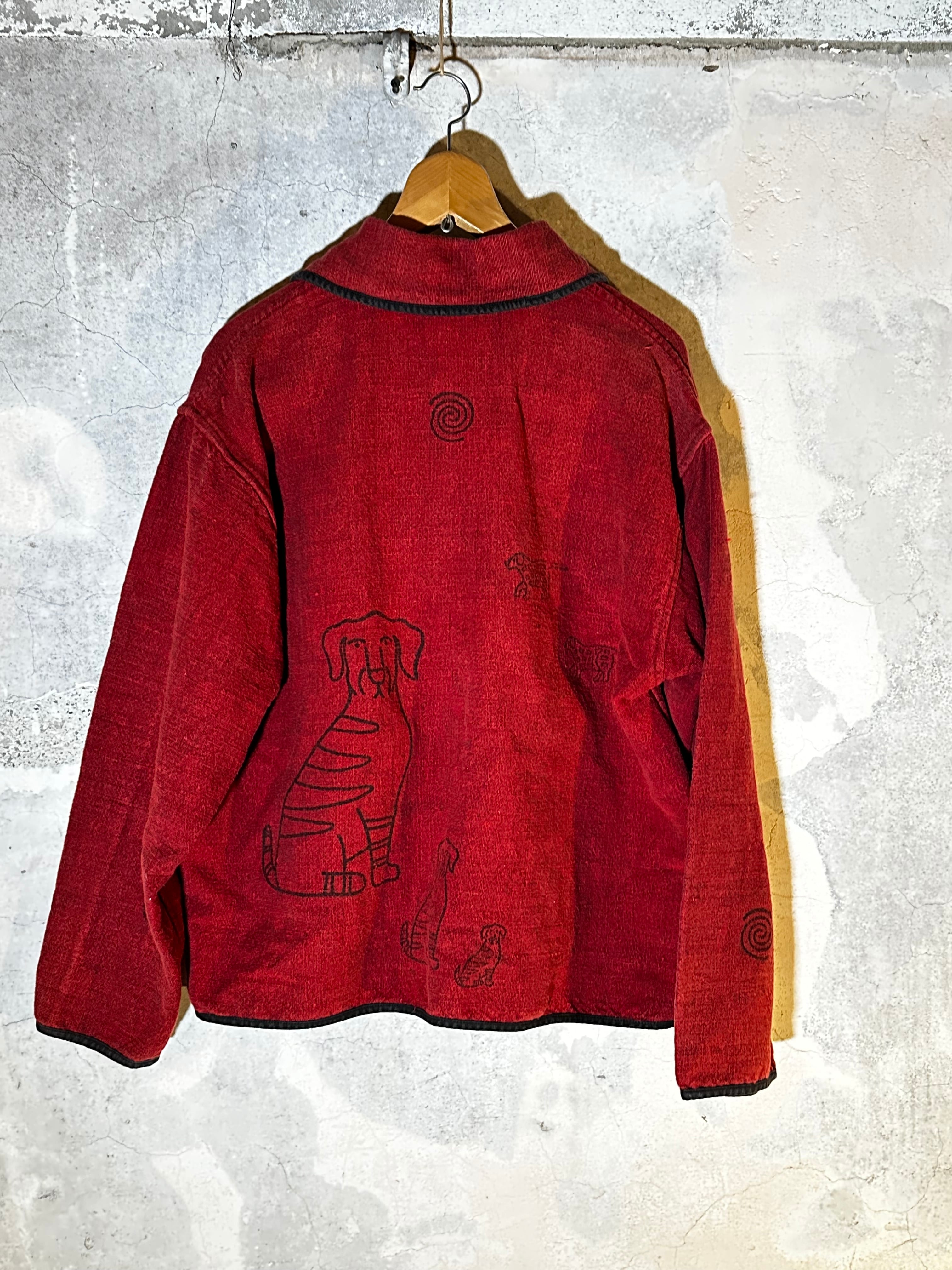 赤地の厚手コットンに、犬の線画が刺繍のように施されたアートな一着。