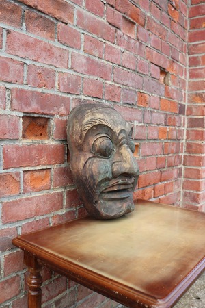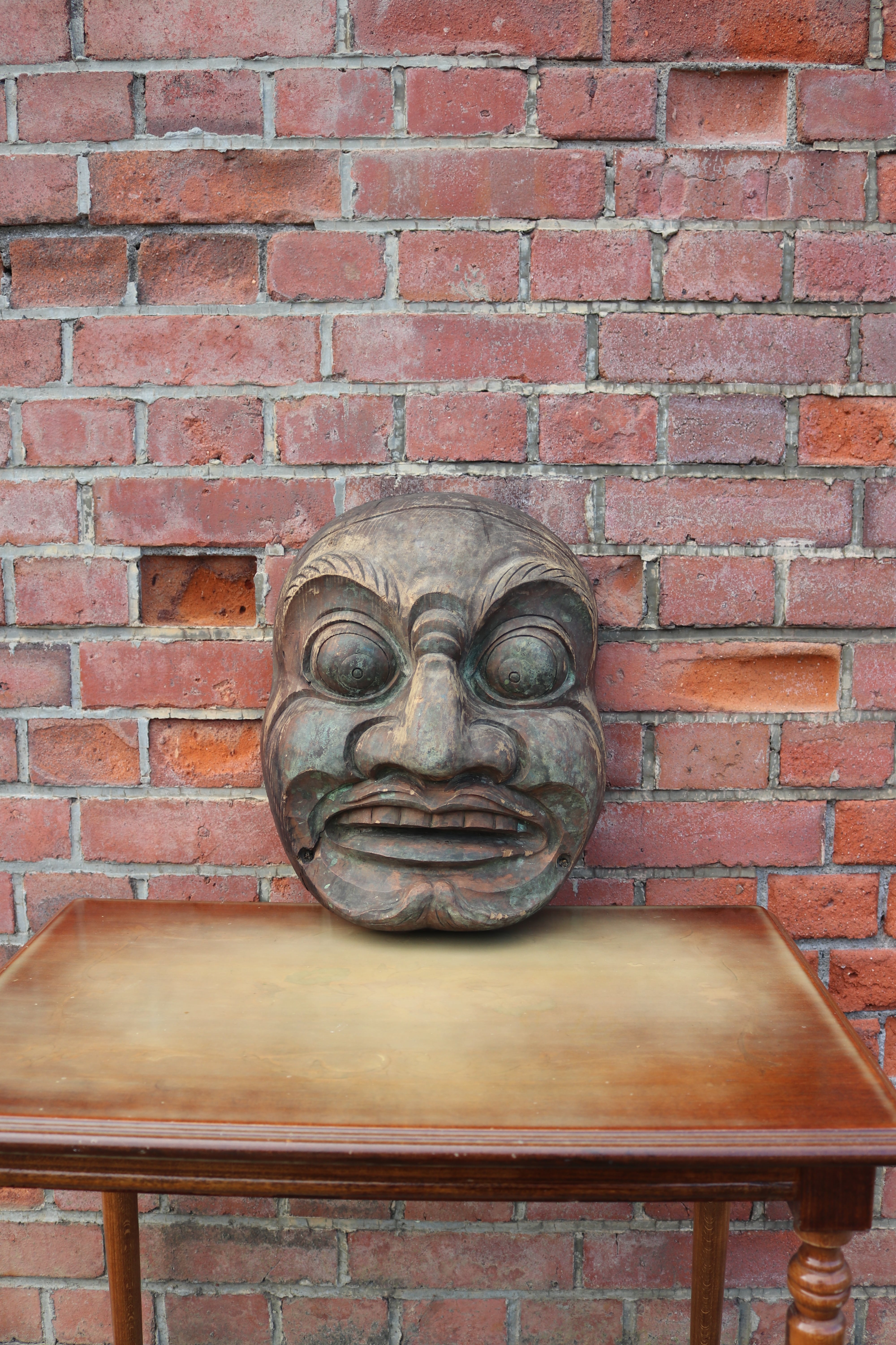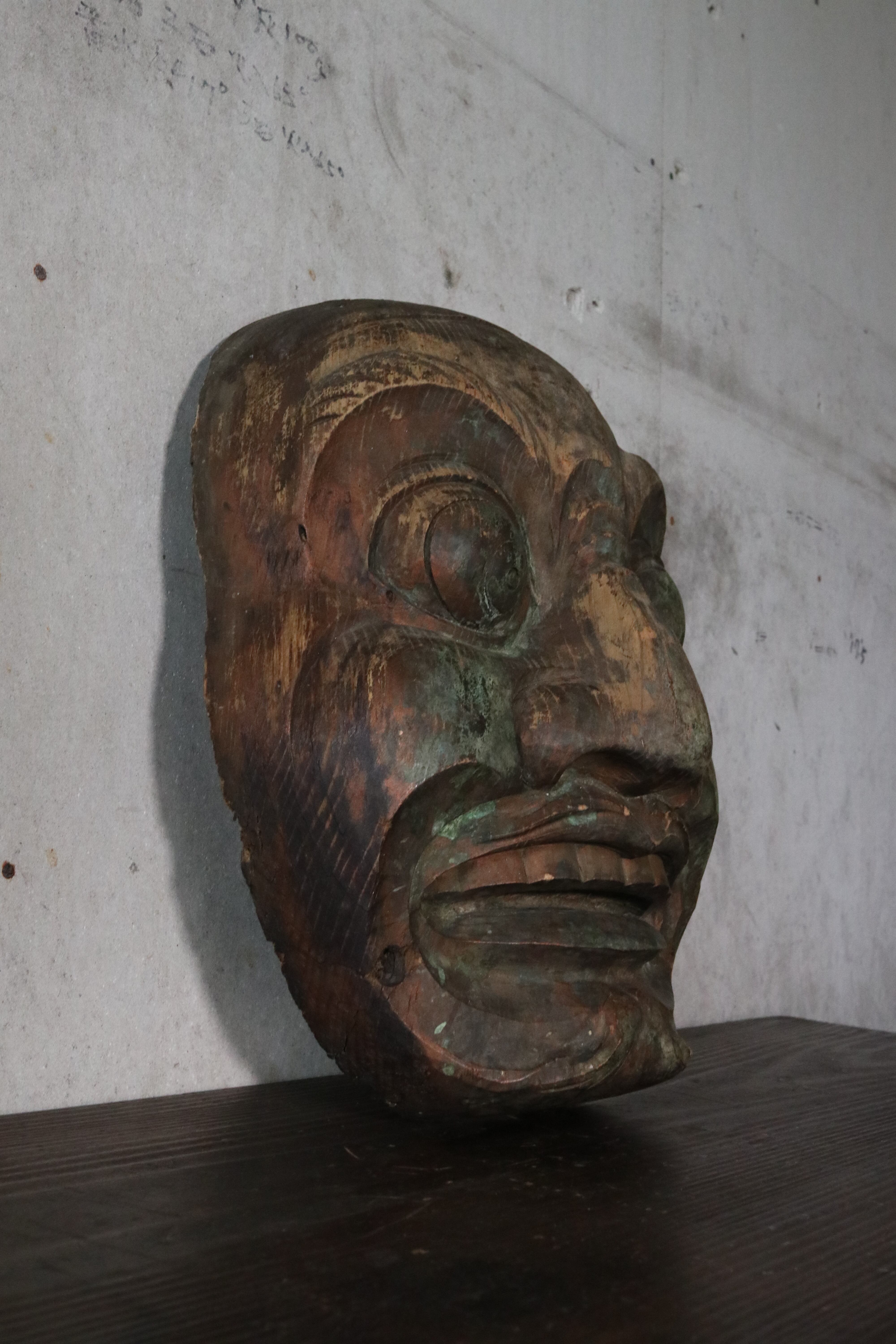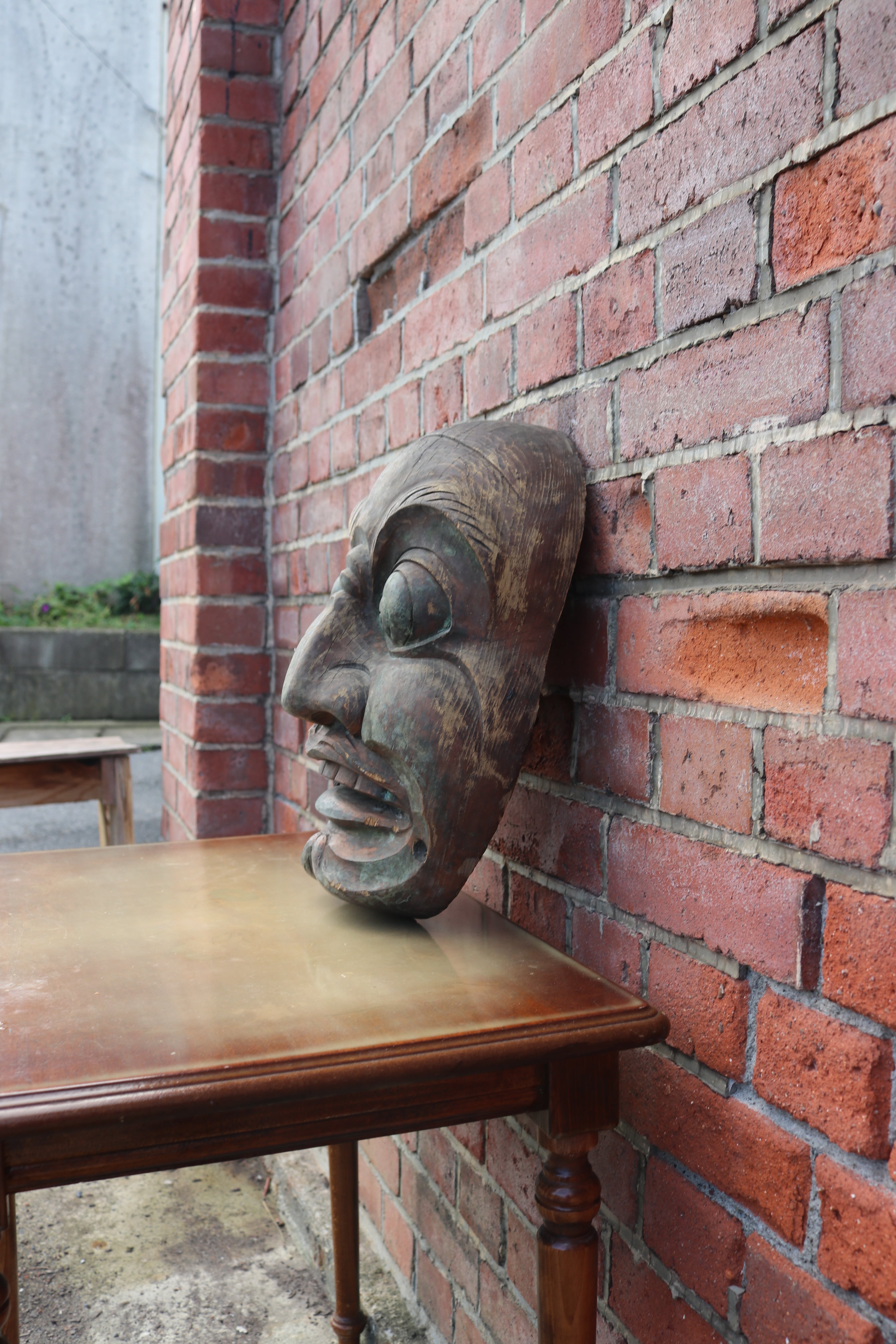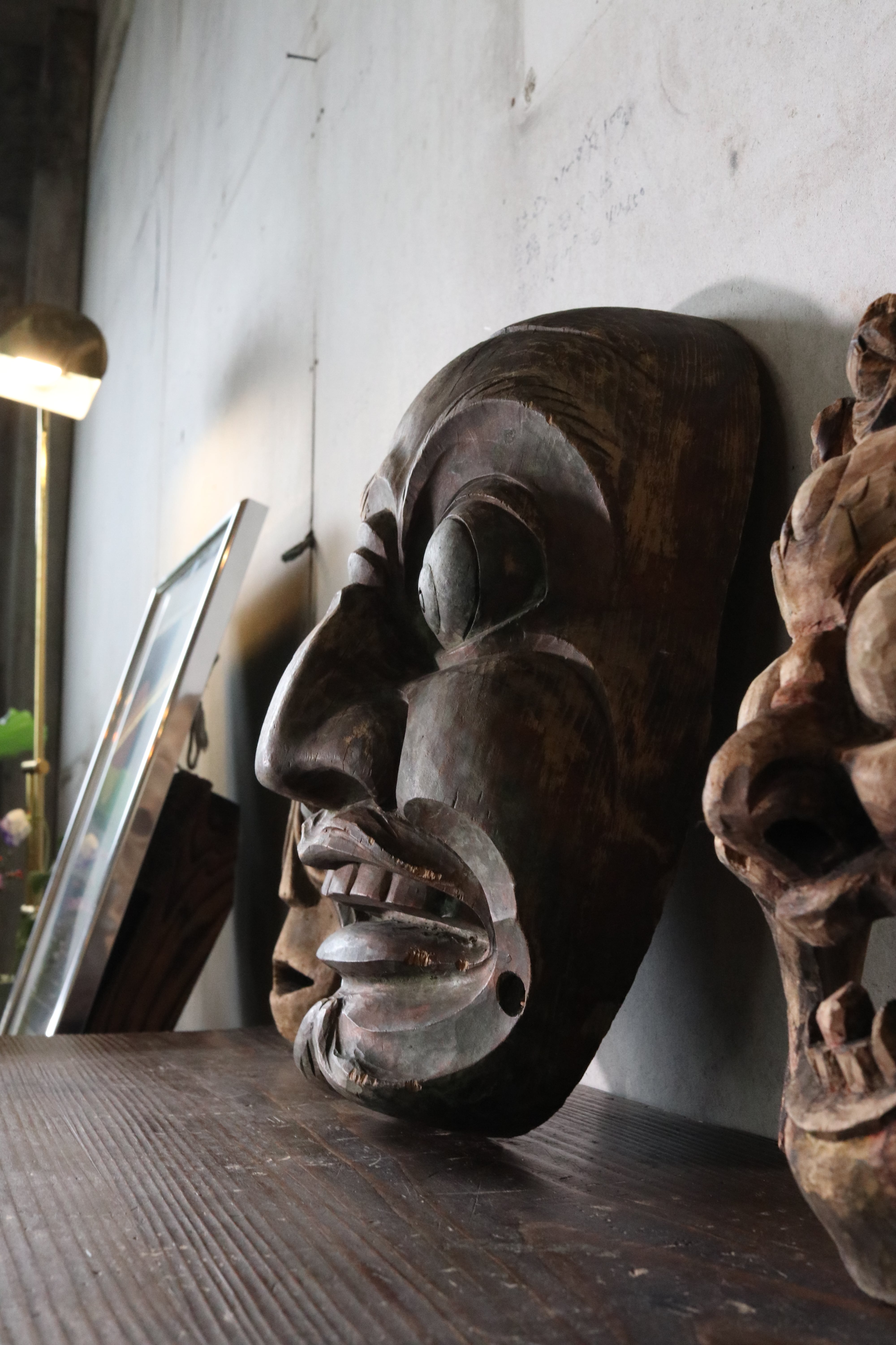 極端に誇張された目・鼻・口の造形が特徴的で、魔除けや祭祀用途で使われていた可能性があります。
