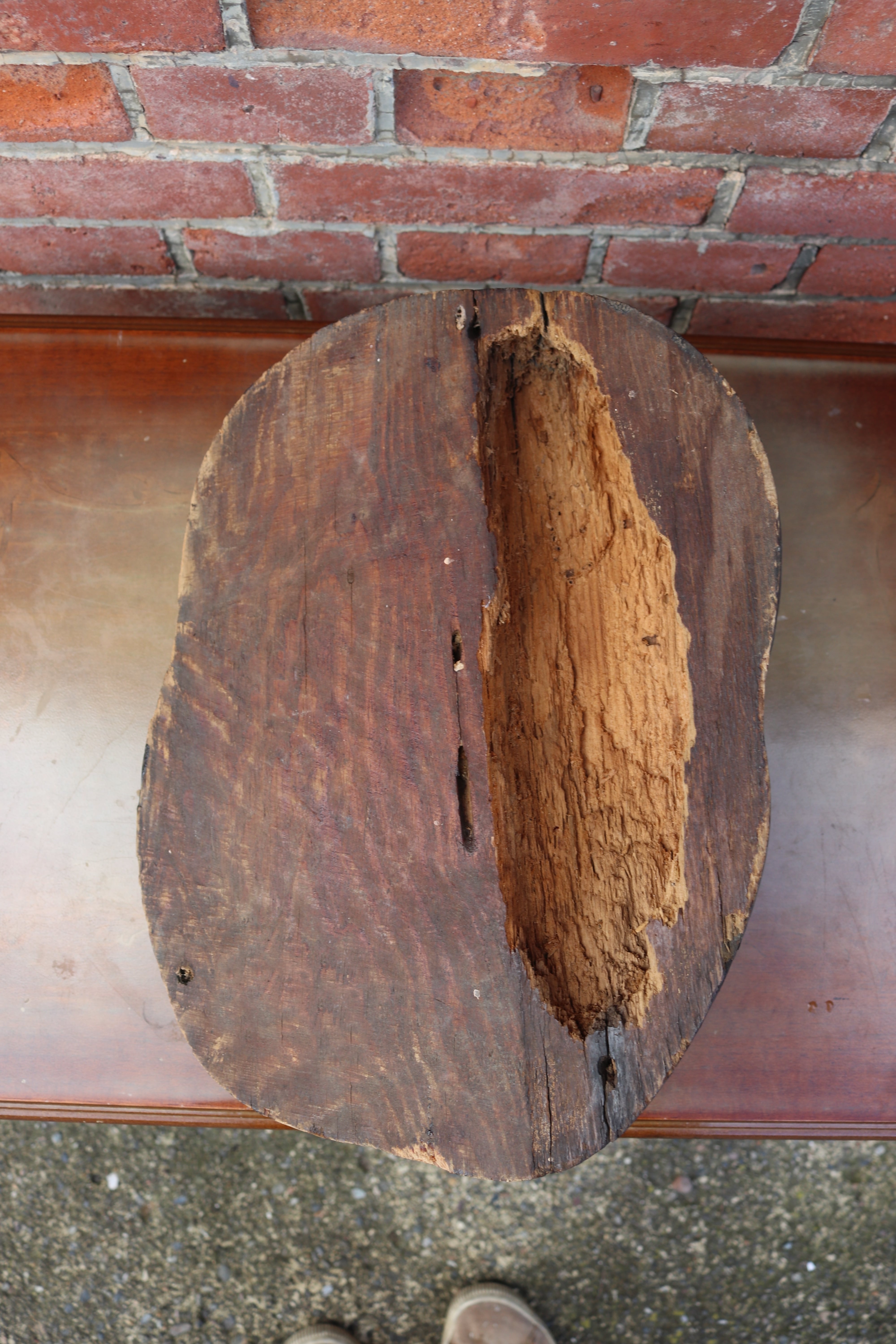 背面は一木から彫り出され、乾燥による割れや虫食い跡もそのままの姿で保存。