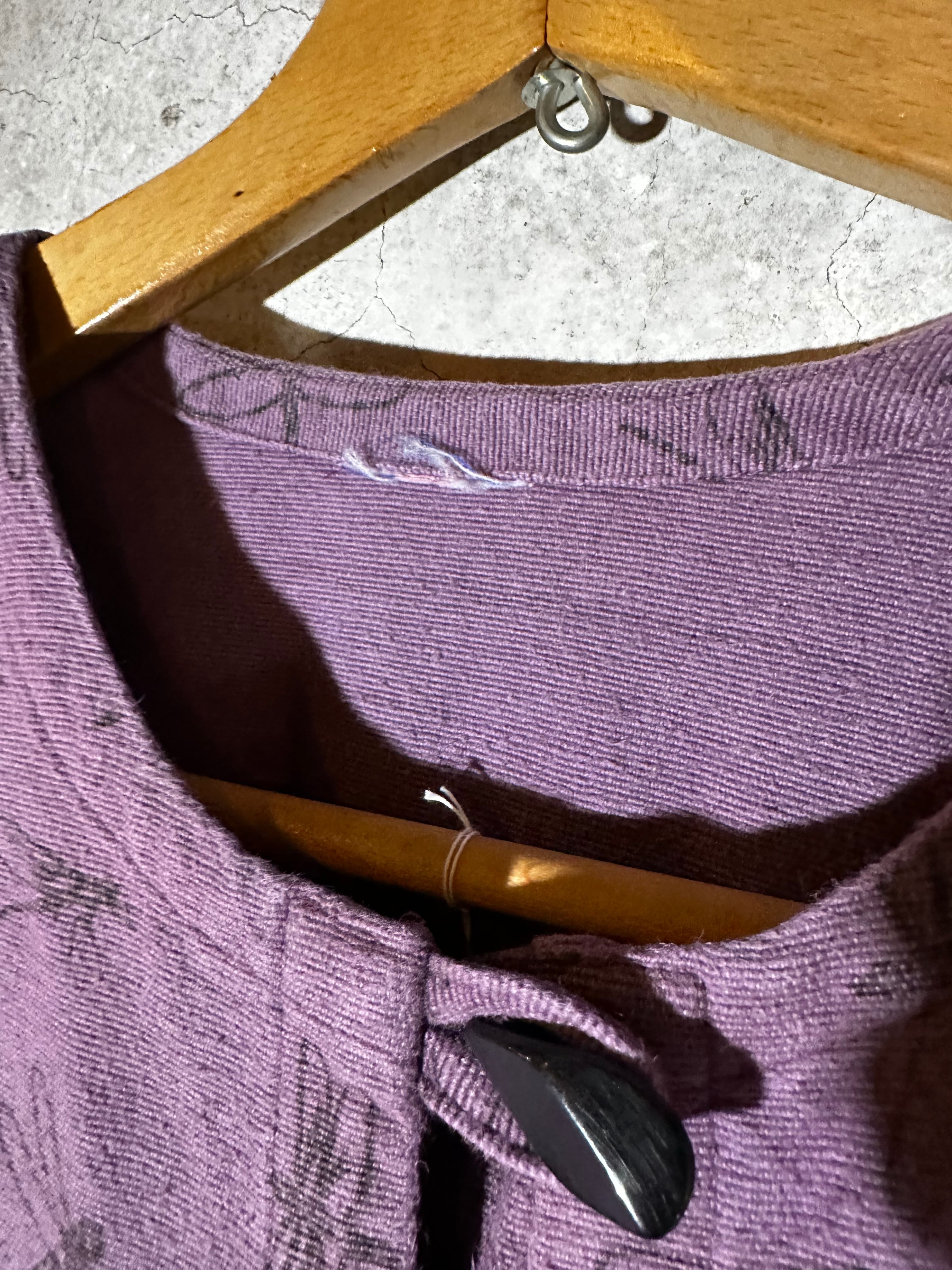 軽い羽織として季節を問わず着やすく、和の要素とエスニックの雰囲気が自然に溶け合っています。パープル寄りのくすんだ色合いが落ち着いていて、ナチュラルな装いにもモードにも馴染みます。