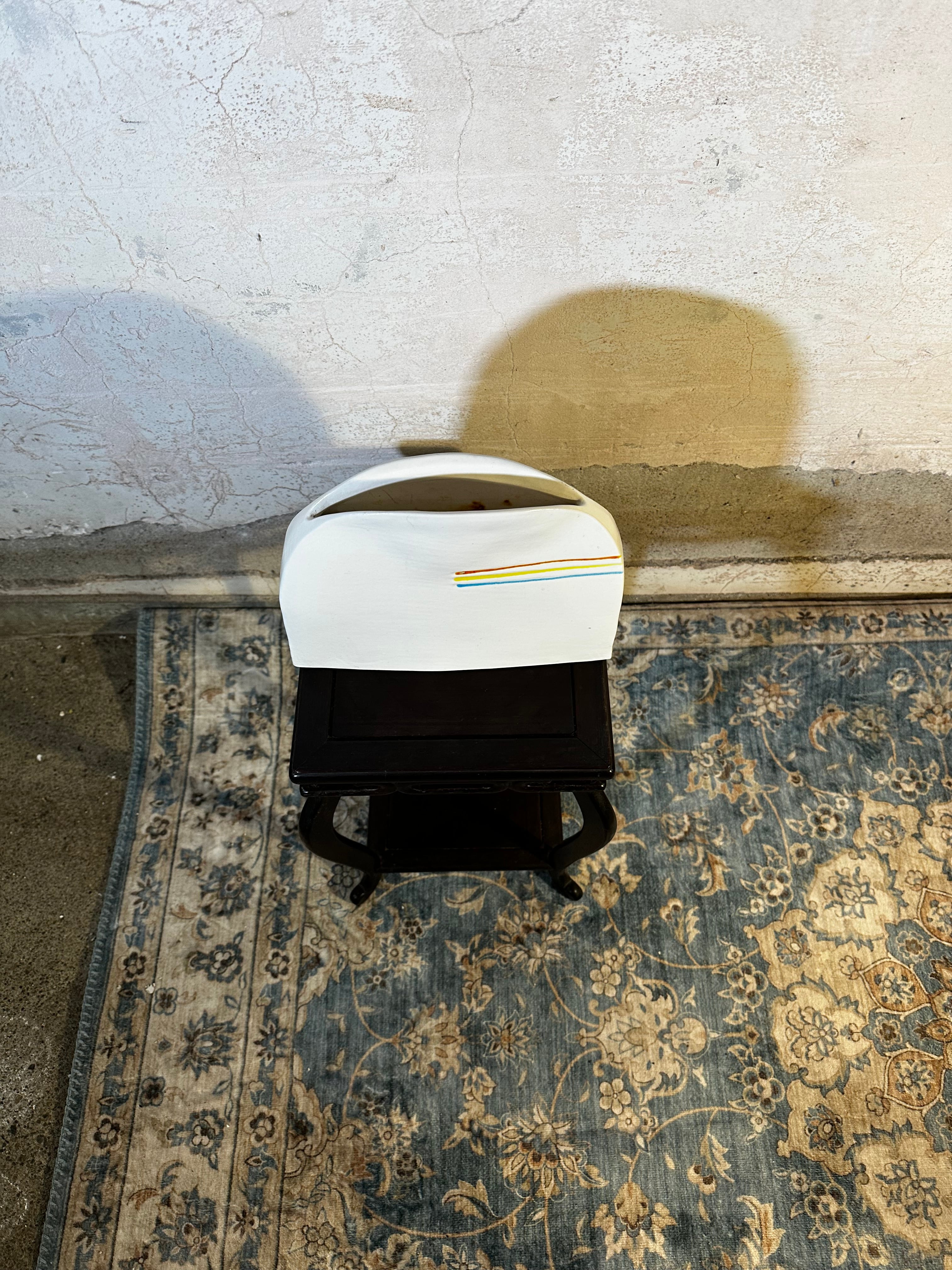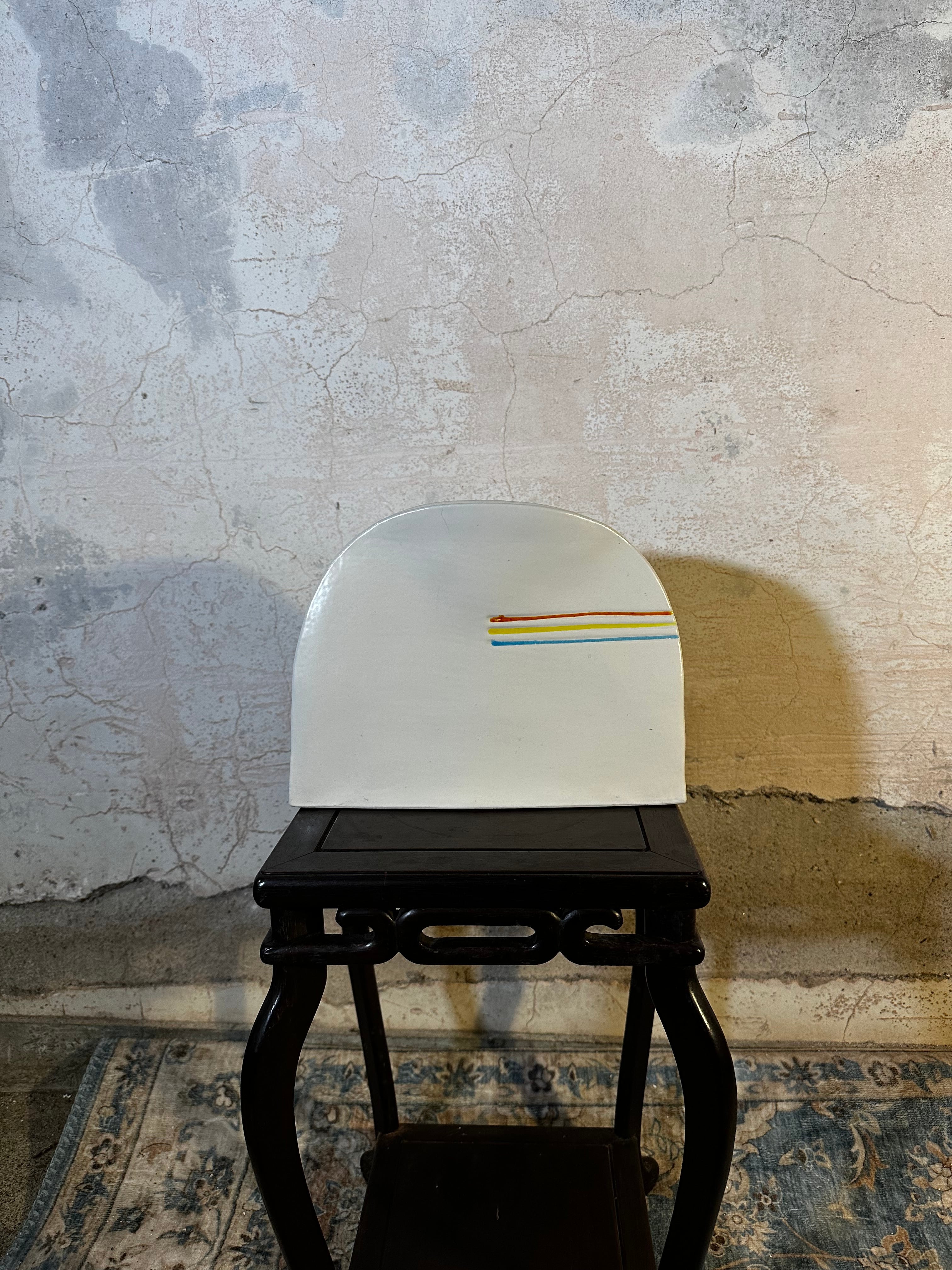 マットな白磁の表面に、オレンジ・ブルー・ブラウンの3本ラインが走るシンプルなデザインが印象的です。