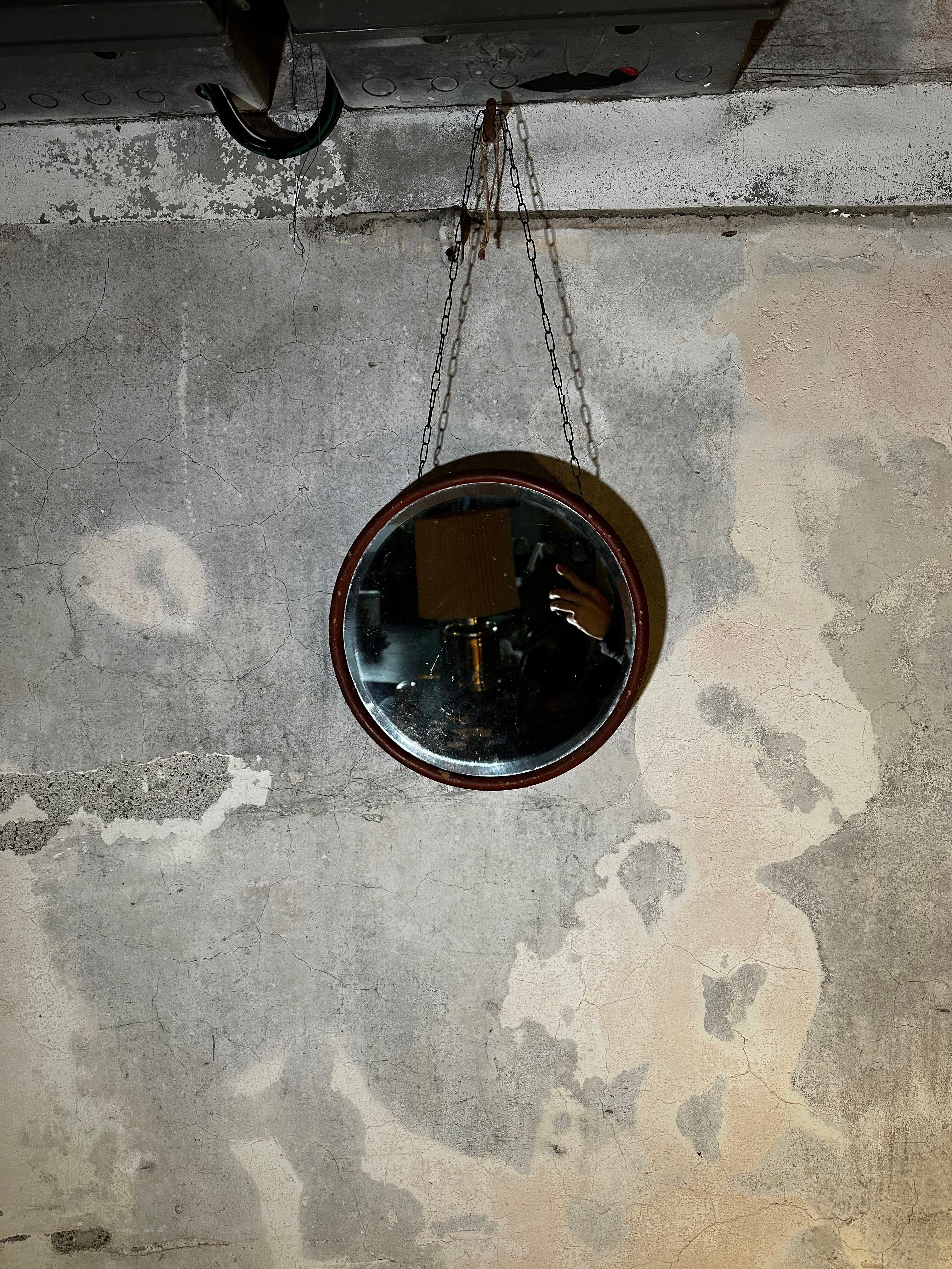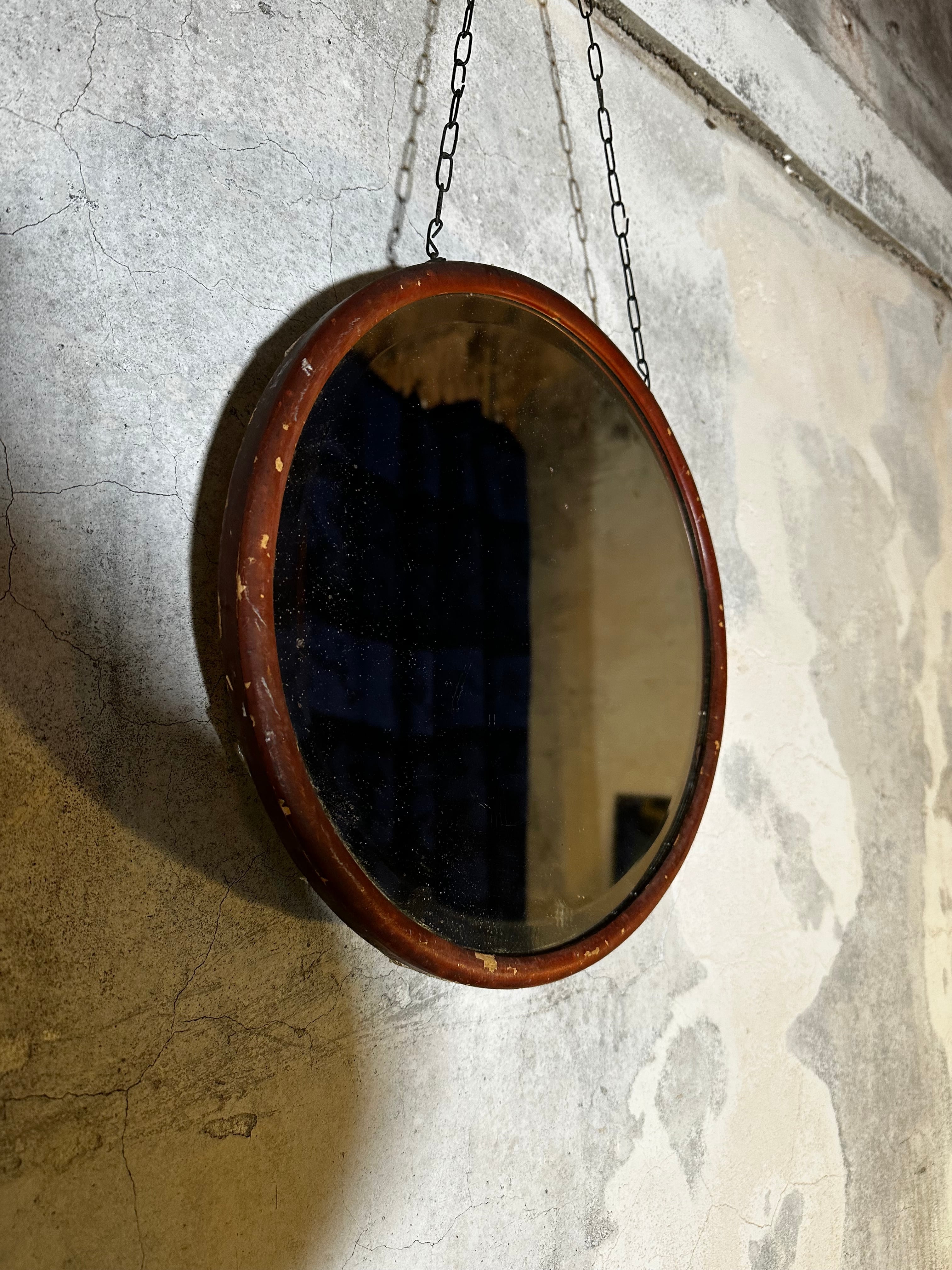 木製フレームとチェーンで吊るす丸型ウォールミラー。