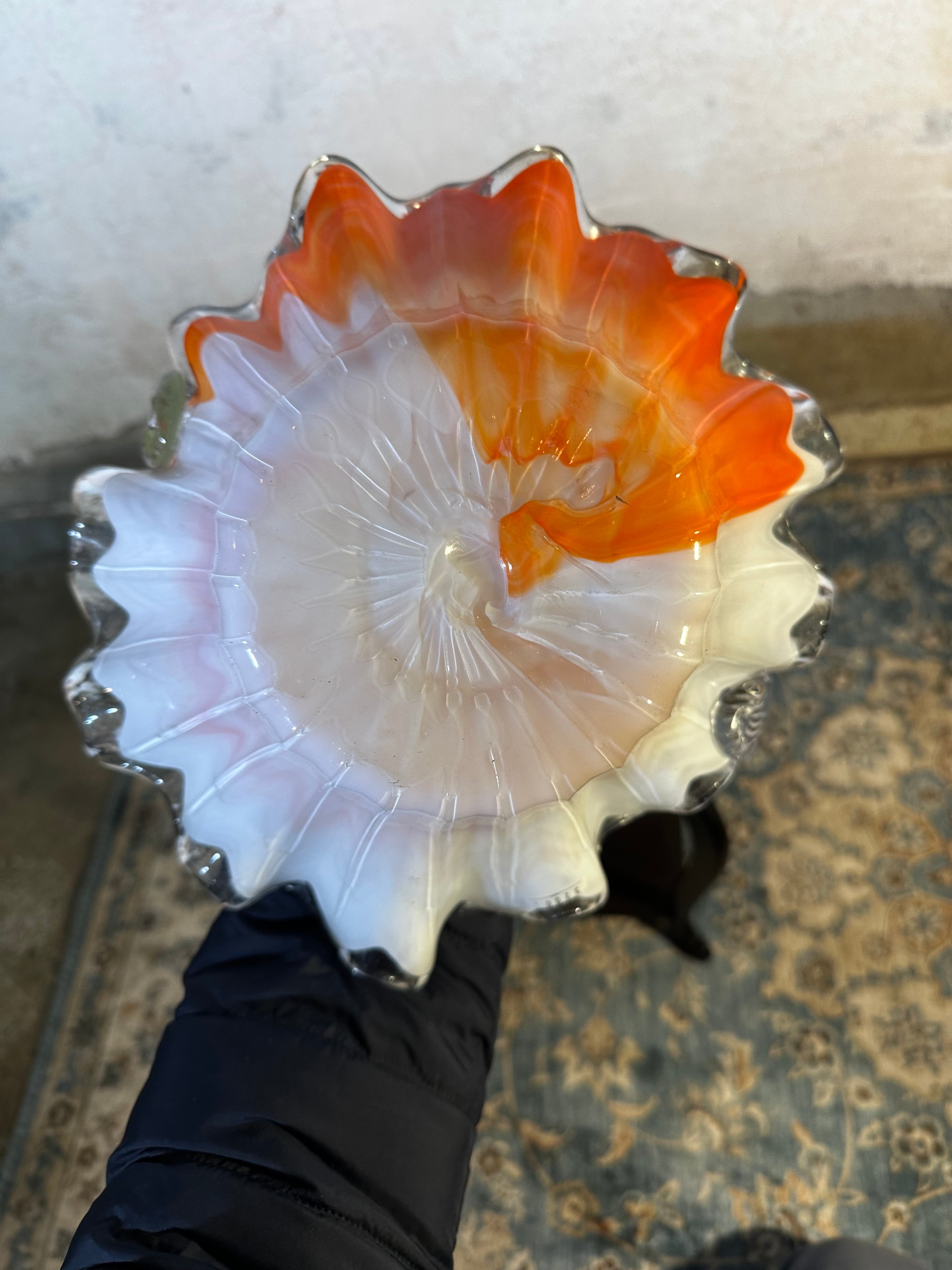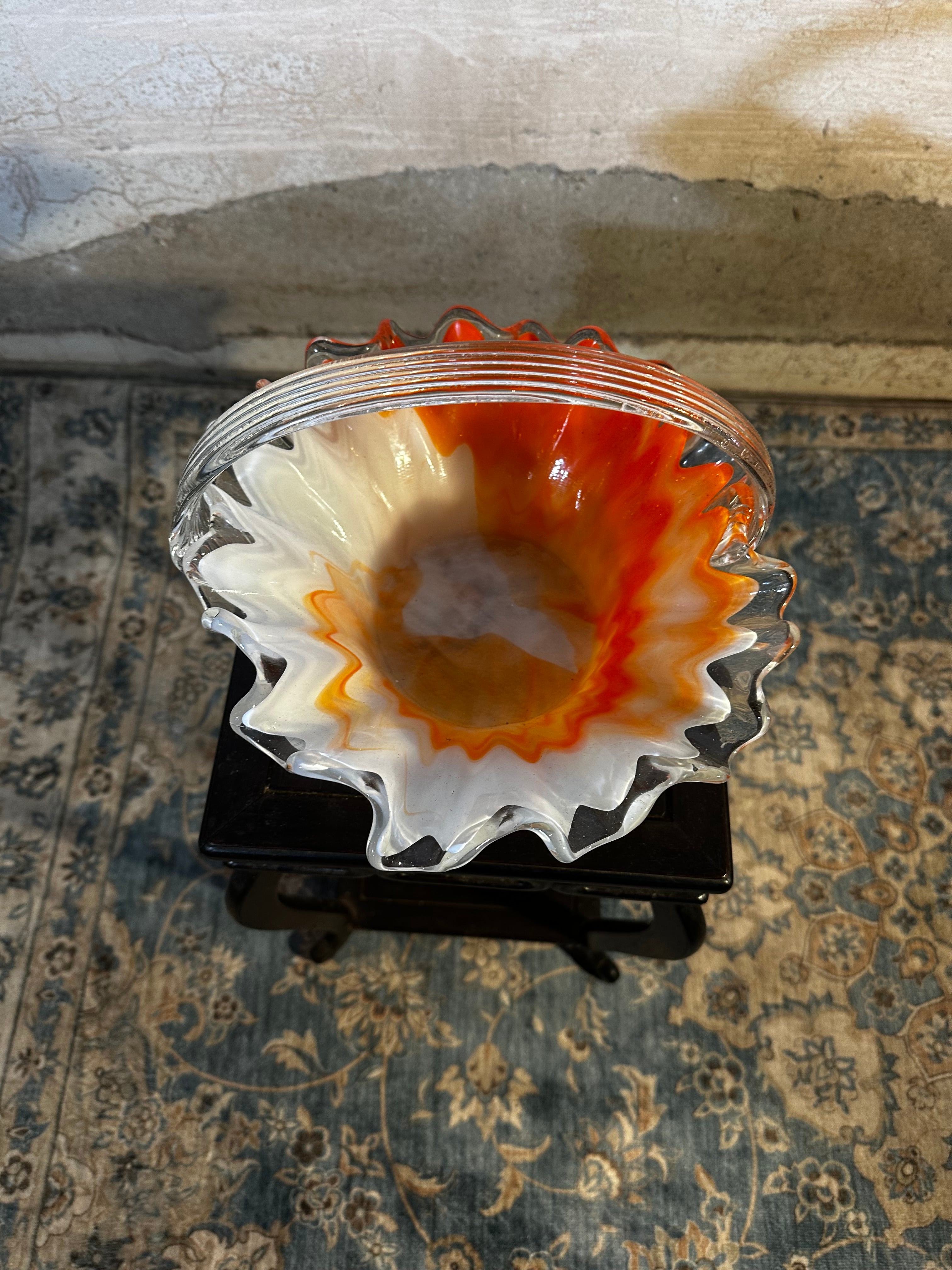 ミルクガラスに炎のようなオレンジを閉じ込めた、イタリア・ムラノガラスのバスケットボウル。 手吹きガラス特有のやわらかな揺らぎと、光を通すことで現れる深い表情が魅力です。 花器や飾り皿、キャンディボウルとしてもおすすめ。 【国】イタリア(ムラノ島製の可能性あり) 【年代】1960〜1970年代 【素材】ハンドブロウンガラス(ミルクガラス) 【サイズ】高さ20cm / 縦横25cm 【コンディション】良好(微細な気泡・揺らぎあり)