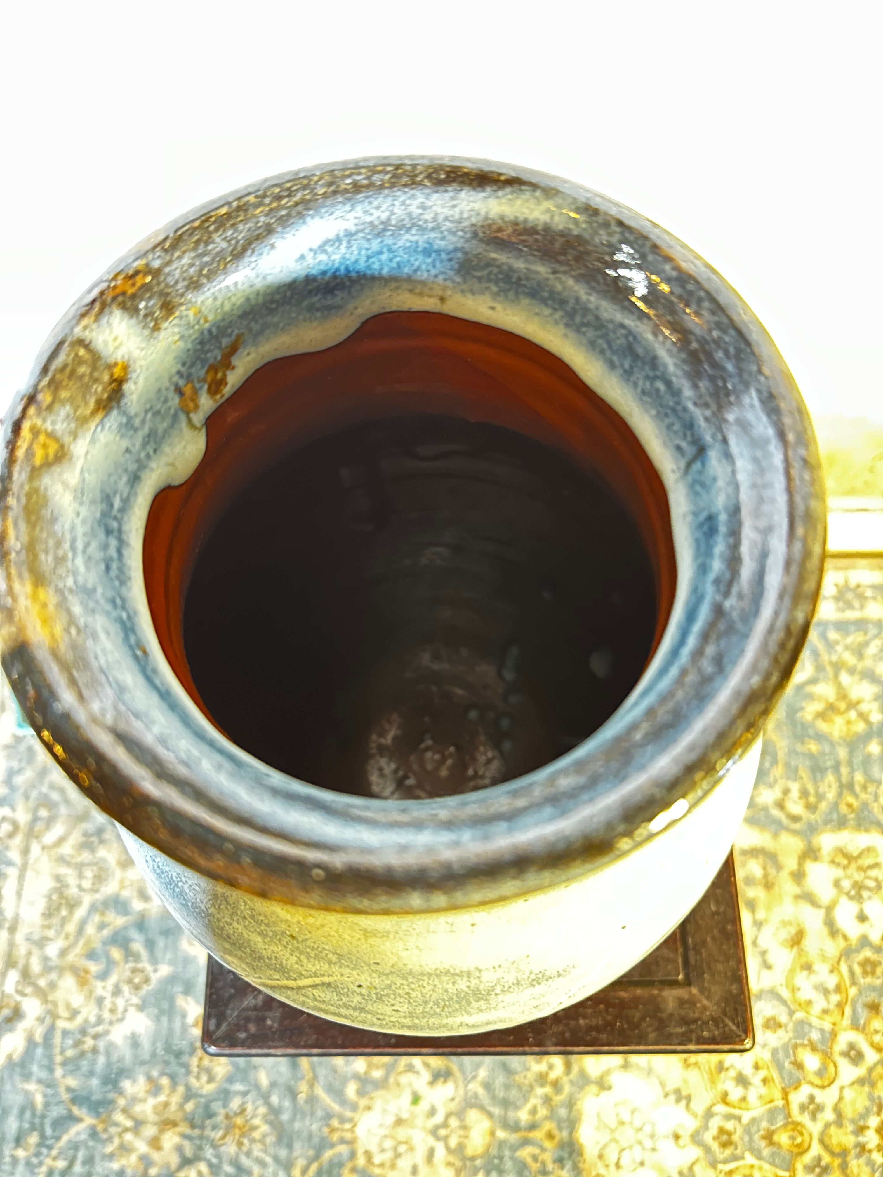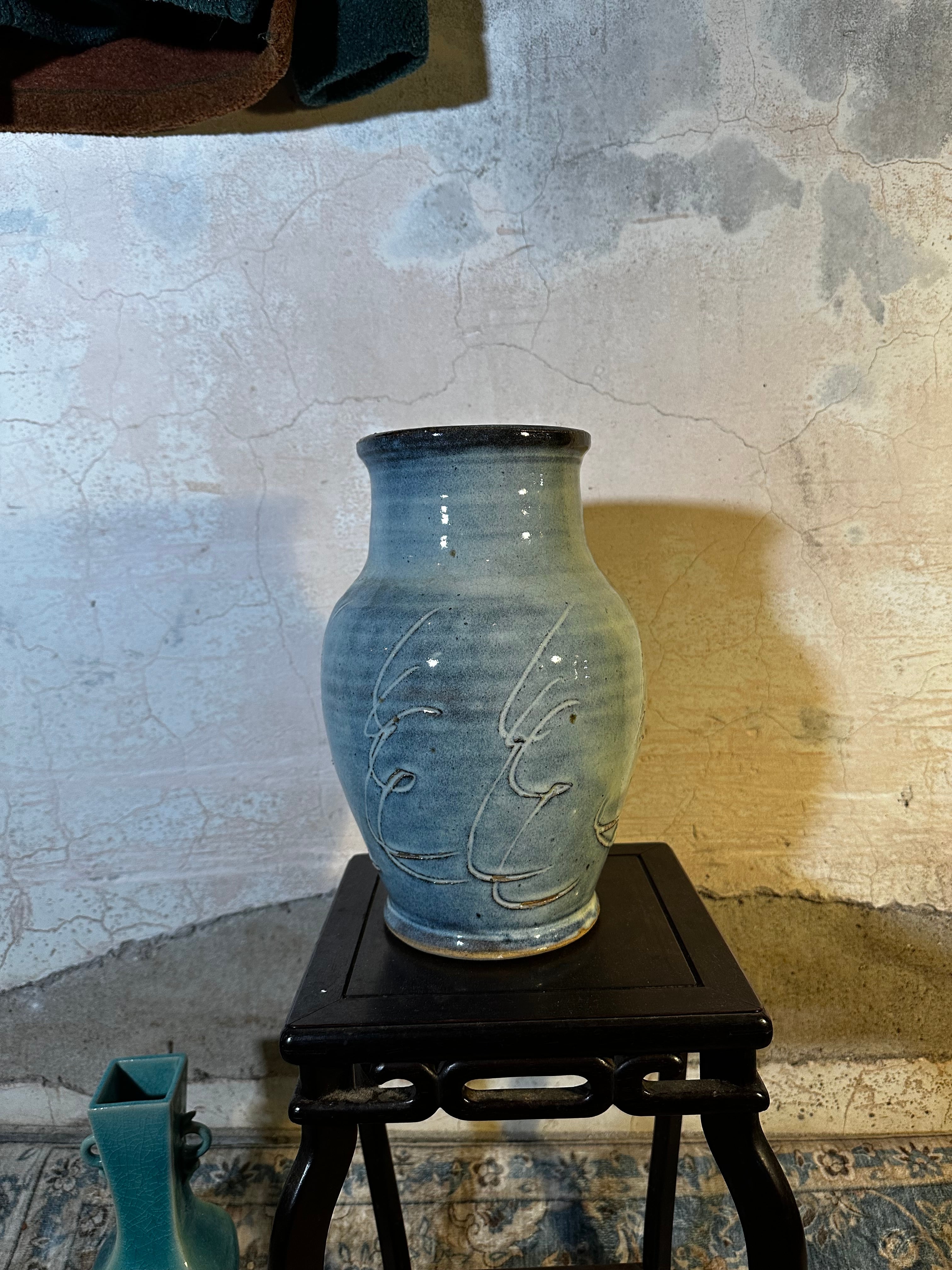 青灰釉の柔らかなグラデーションと、胴を走る線刻文様が印象的な昭和期の花器。 赤土をベースに、還元焼成で焼き締められた堅牢な仕上がり。現代的なインテリアにもよく合う、和モダンな一品です。 【国】日本 【年代】1970〜1980年代頃 【素材】陶器(赤土・青釉) 【サイズ】高さ24cm × 胴径16cm 【状態】良好(口縁にごくわずかな焼きムラあり)