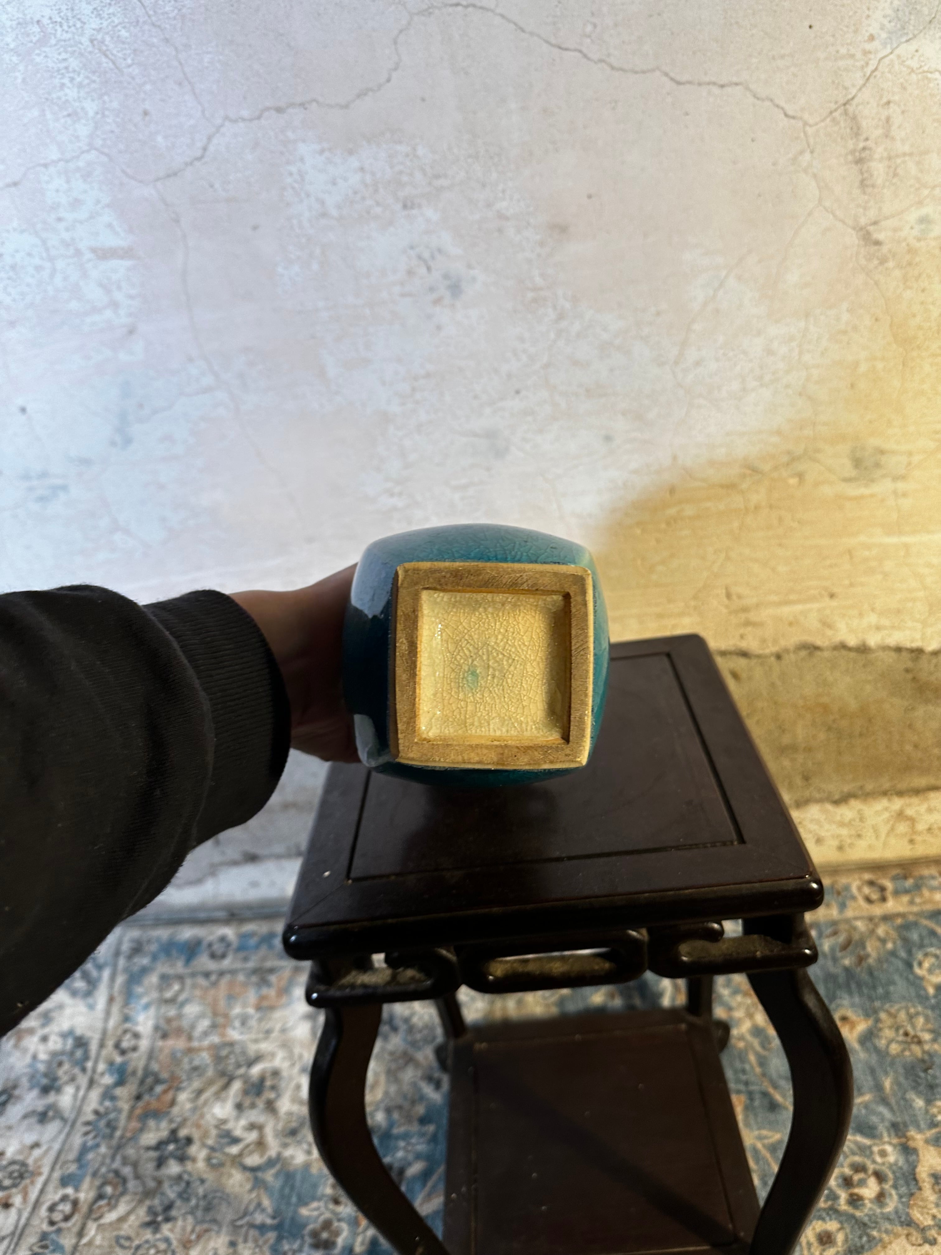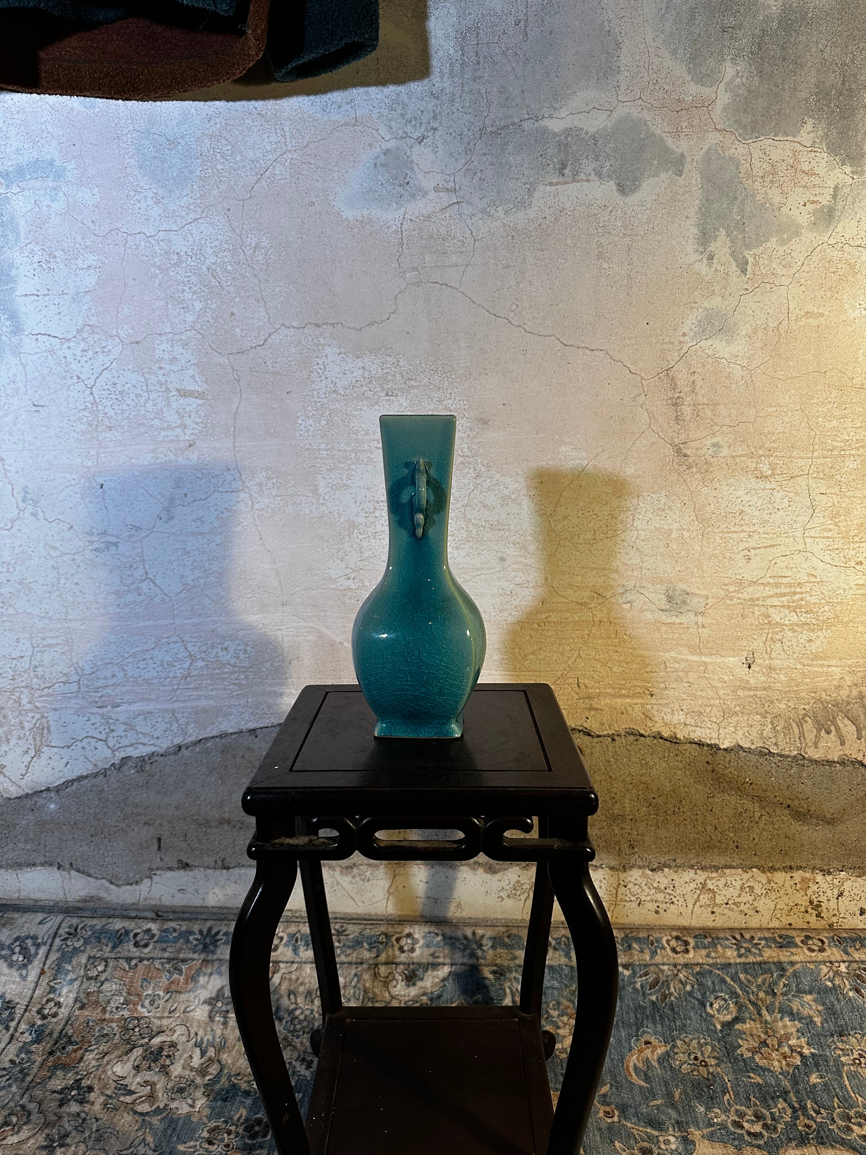 鮮やかなターコイズブルーが印象的な、昭和中期の陶製花瓶。 胴部には小さな龍耳が施され、古典的造形にモダンな釉調が重なります。 釉薬に入った細かな貫入も、美しい経年の証。 空間にひとつ置くだけで、静かな存在感を放ちます。 【国】日本 【年代】1950〜1970年代頃 【素材】陶器(孔雀青釉) 【サイズ】高さ24.5cm × 横10cm × 口径5cm 【状態】良好(わずかな貫入あり)
