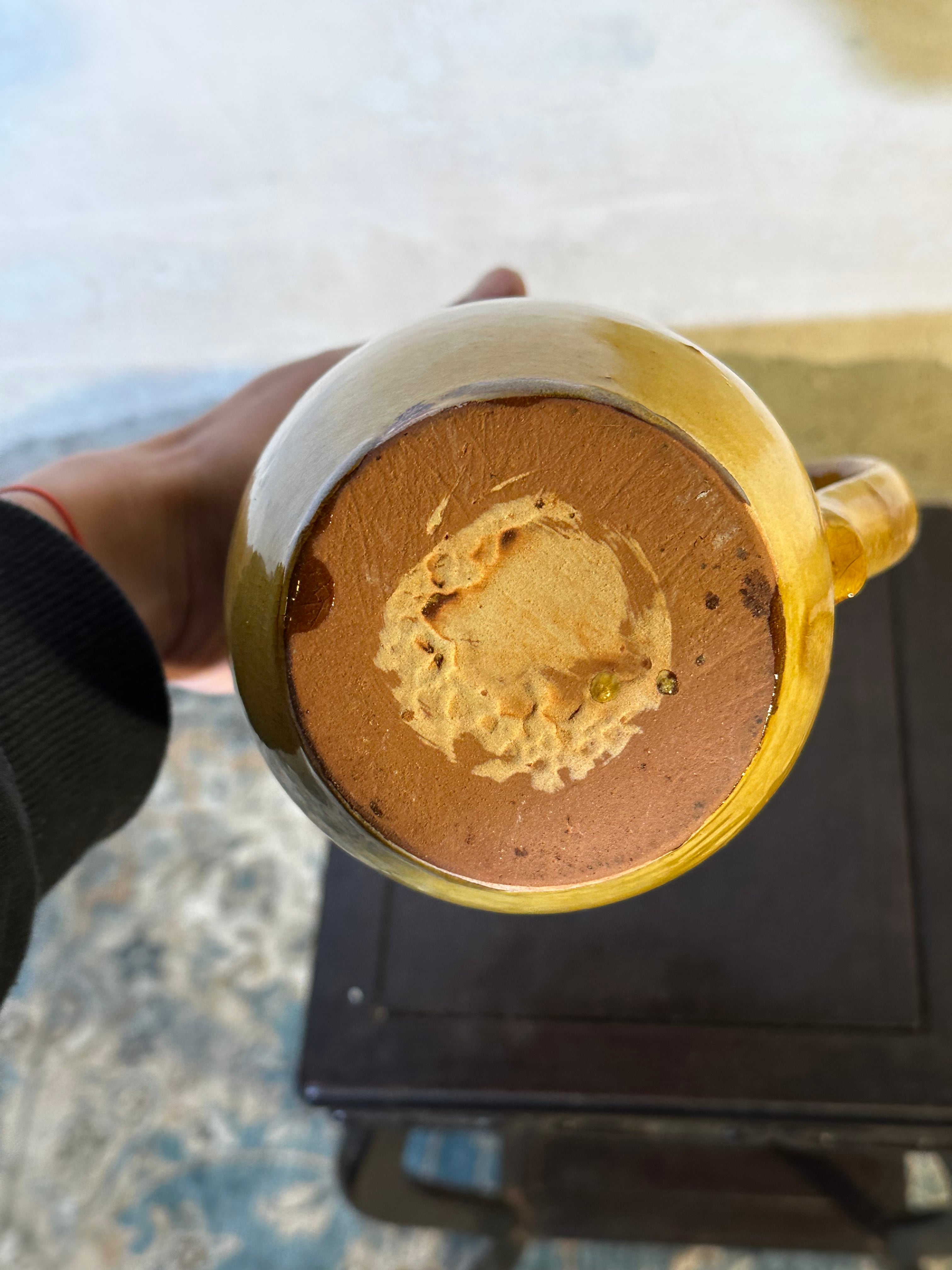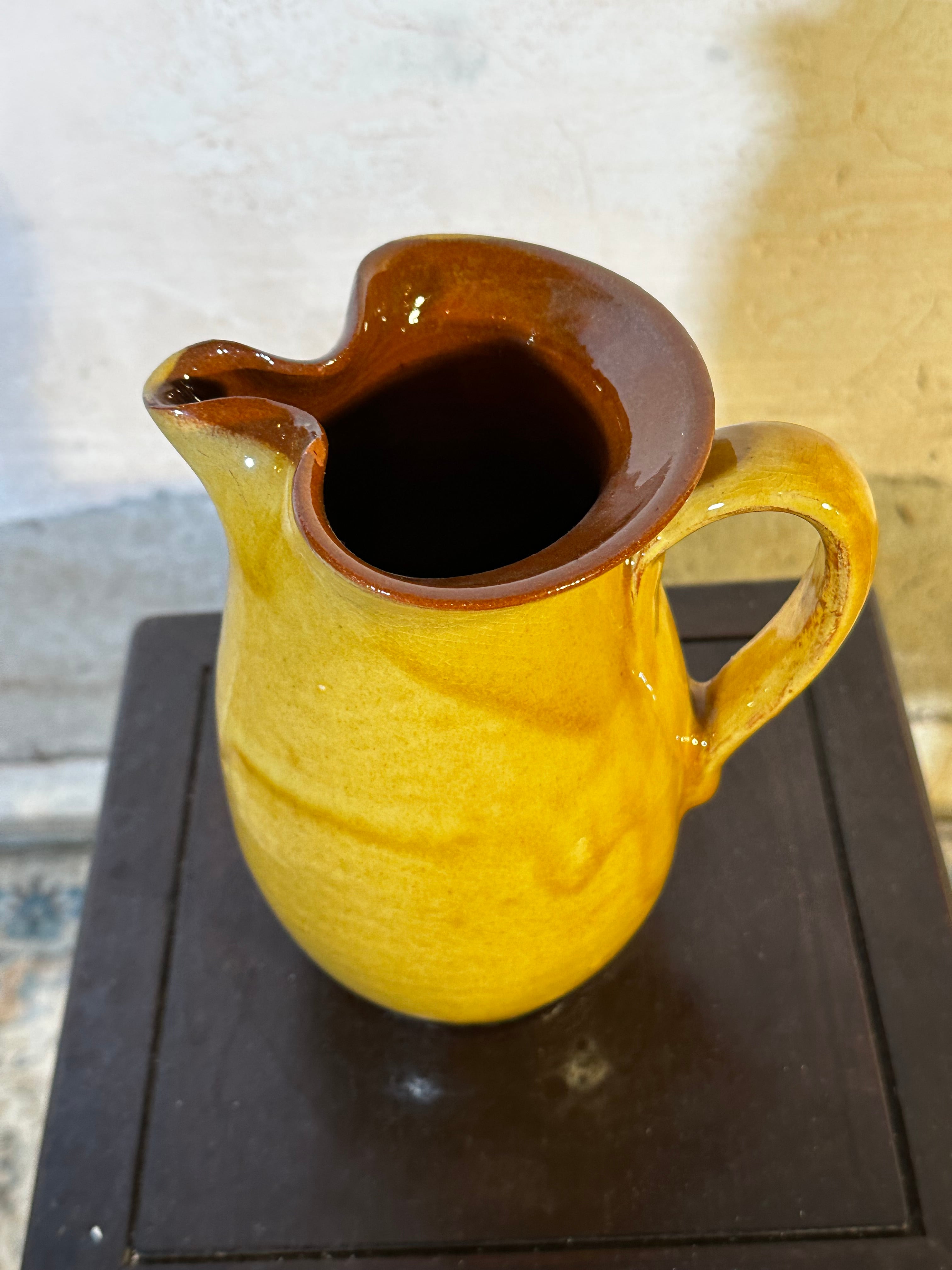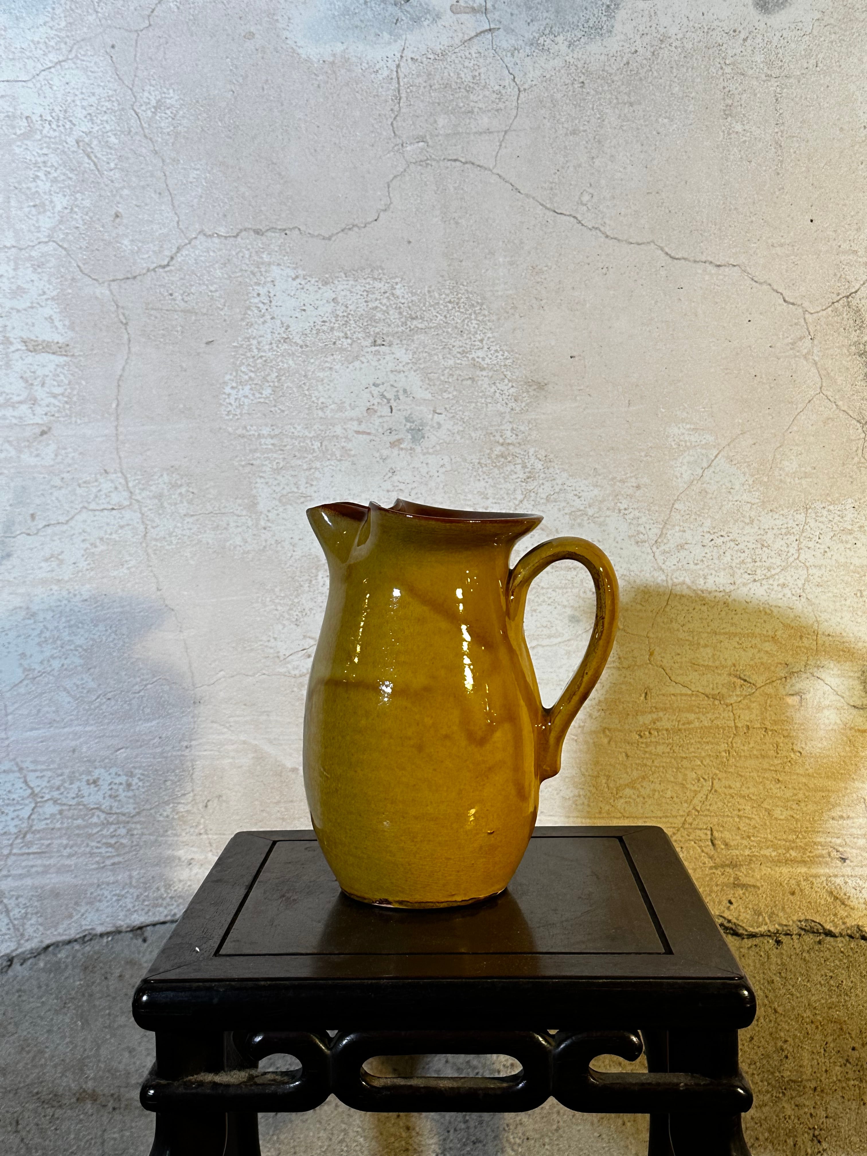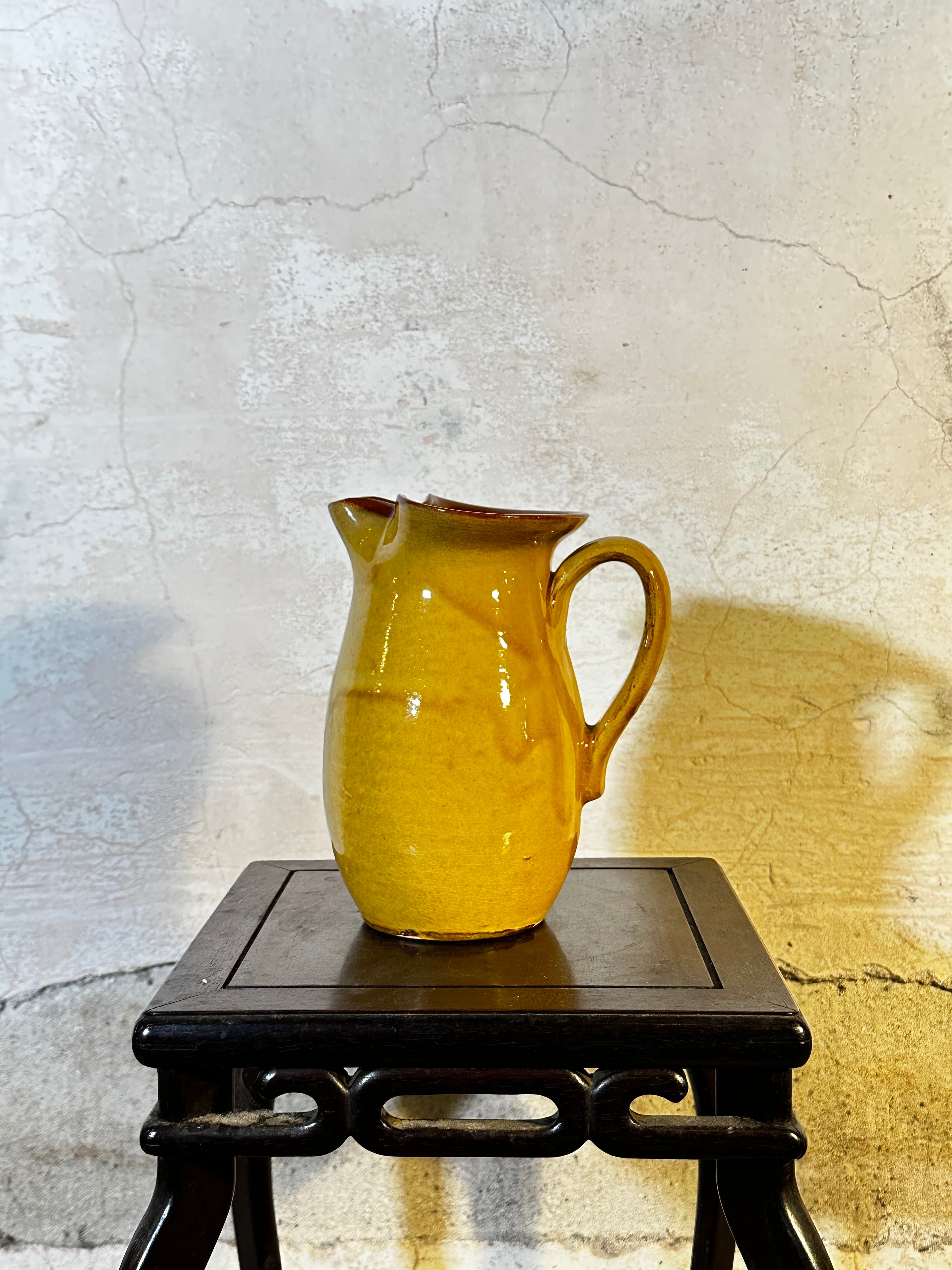昭和の暮らしの中で使われていた、黄釉のピッチャー。 赤土に明るい黄色の釉を掛け、内側は飴色の鉄釉。どこか懐かしく、どこかモダンな佇まい。 水差しや花器としても、季節の枝物とよく合います。 【国】日本 【年代】1970〜1980年代頃 【素材】陶器(赤土) 【サイズ】高さ18cm × 横14cm × 口径7cm 【状態】釉薬のムラ・小傷あり(製作時のもの)