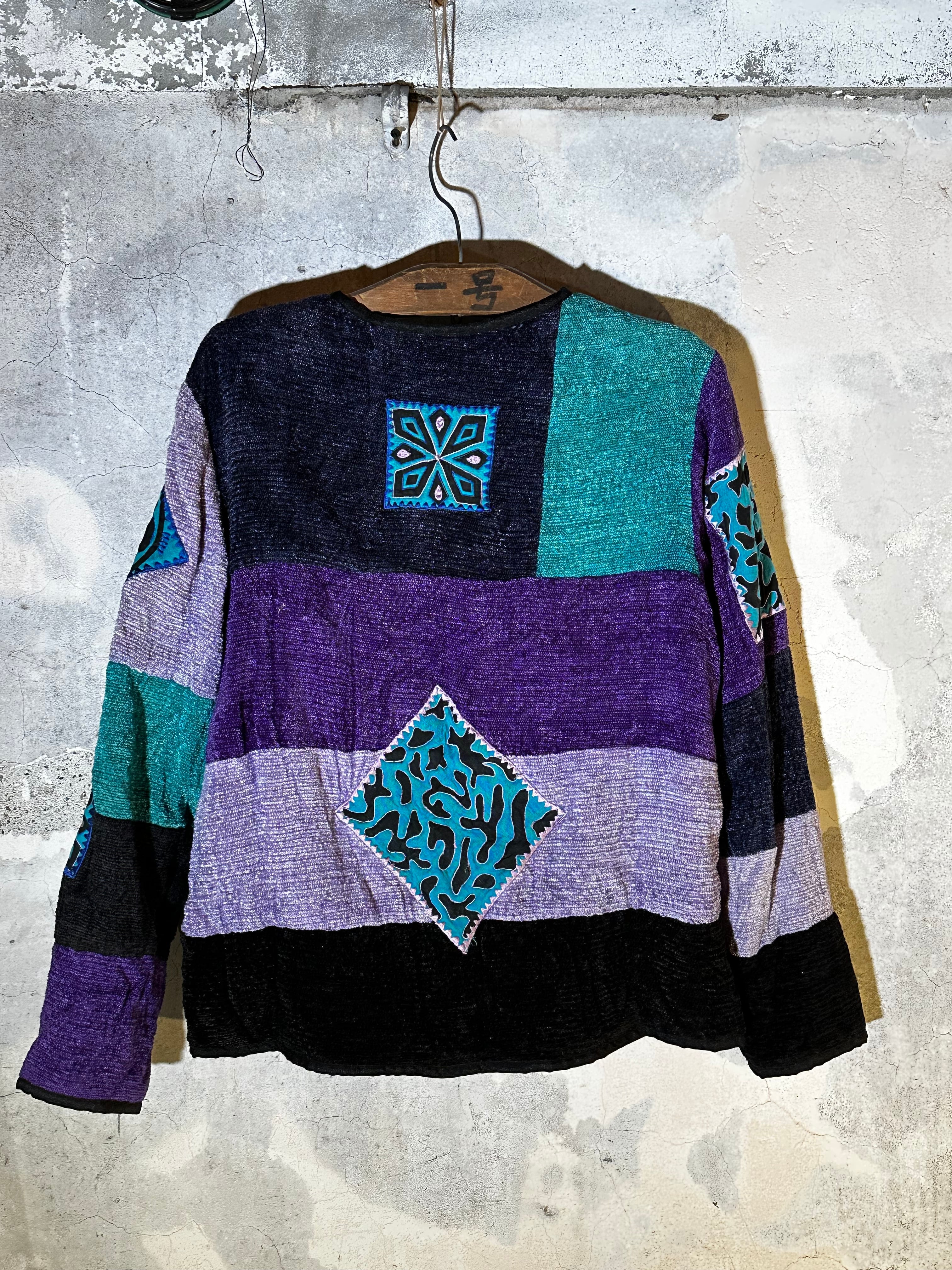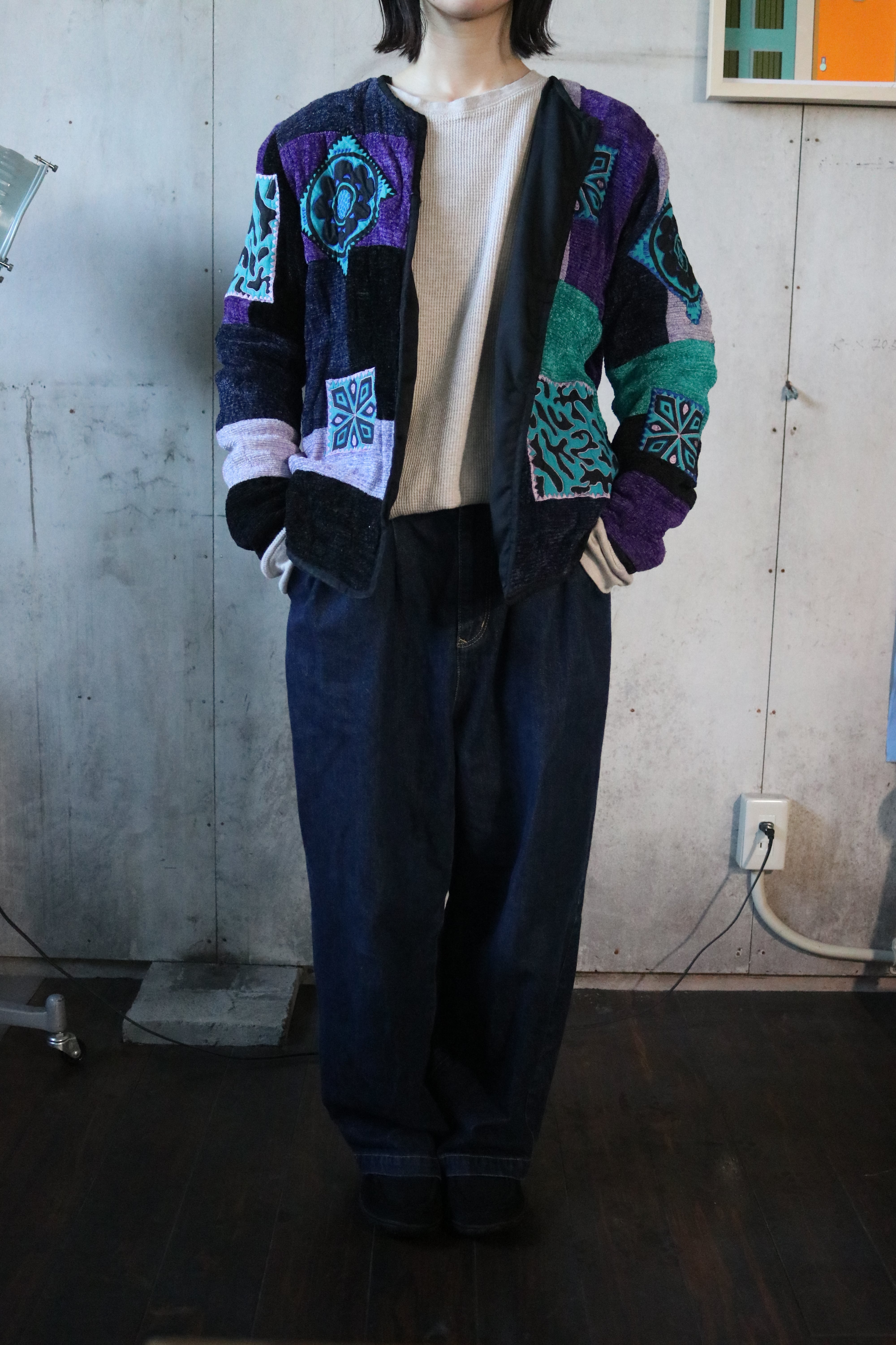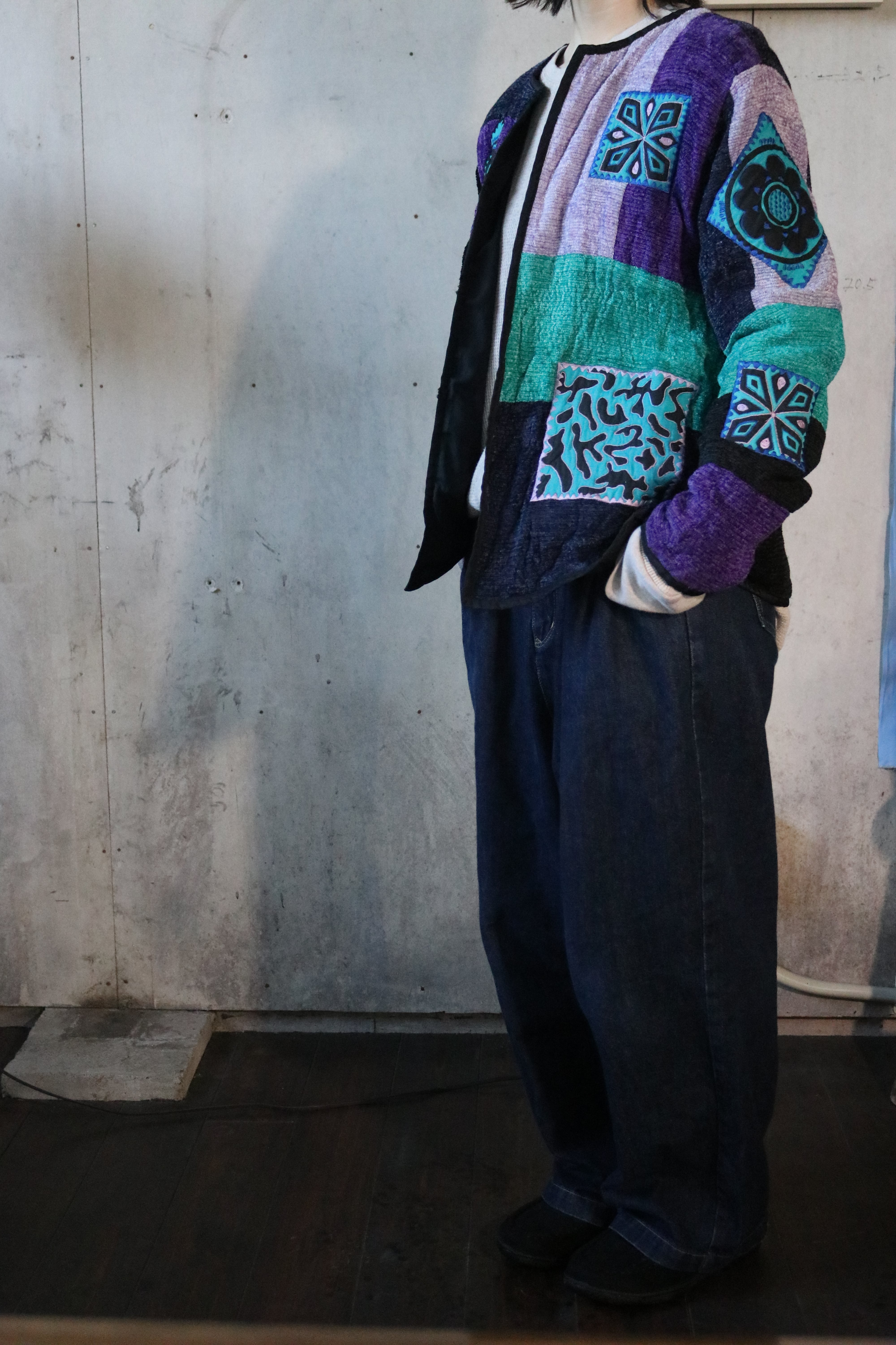 パープル・ティール・ブラックを基調に、それぞれ異なる刺繍パターンを組み合わせた独特の存在感。レーヨン100%の軽やかな生地は落ち感があり、春・秋の羽織にもぴったりの一枚。