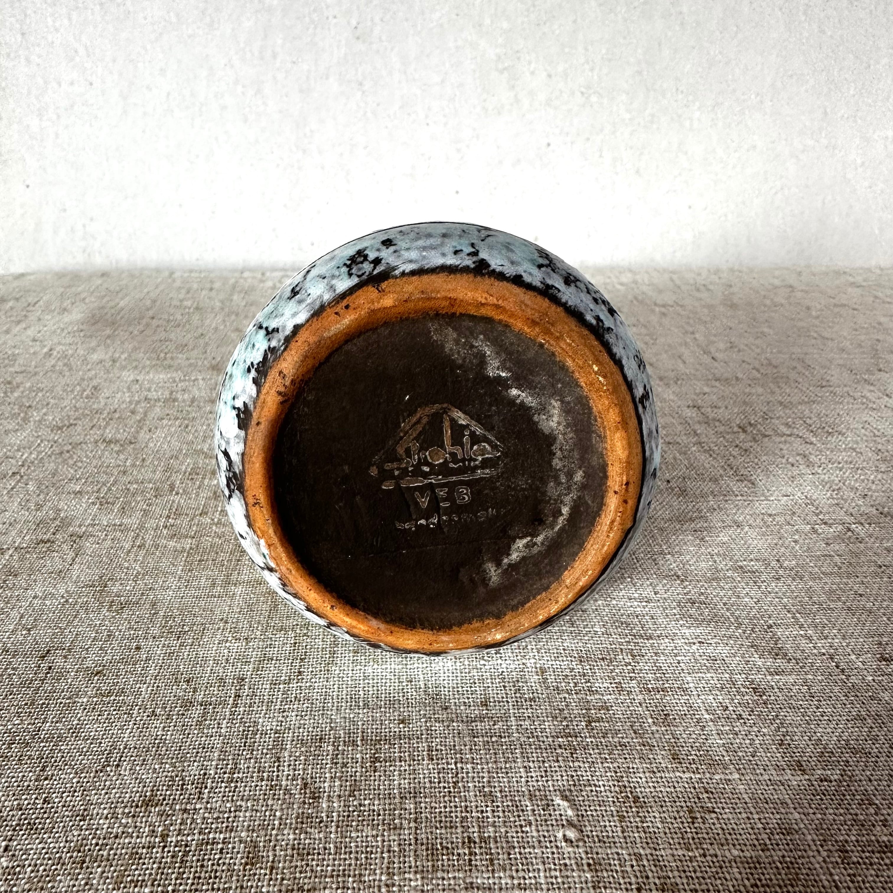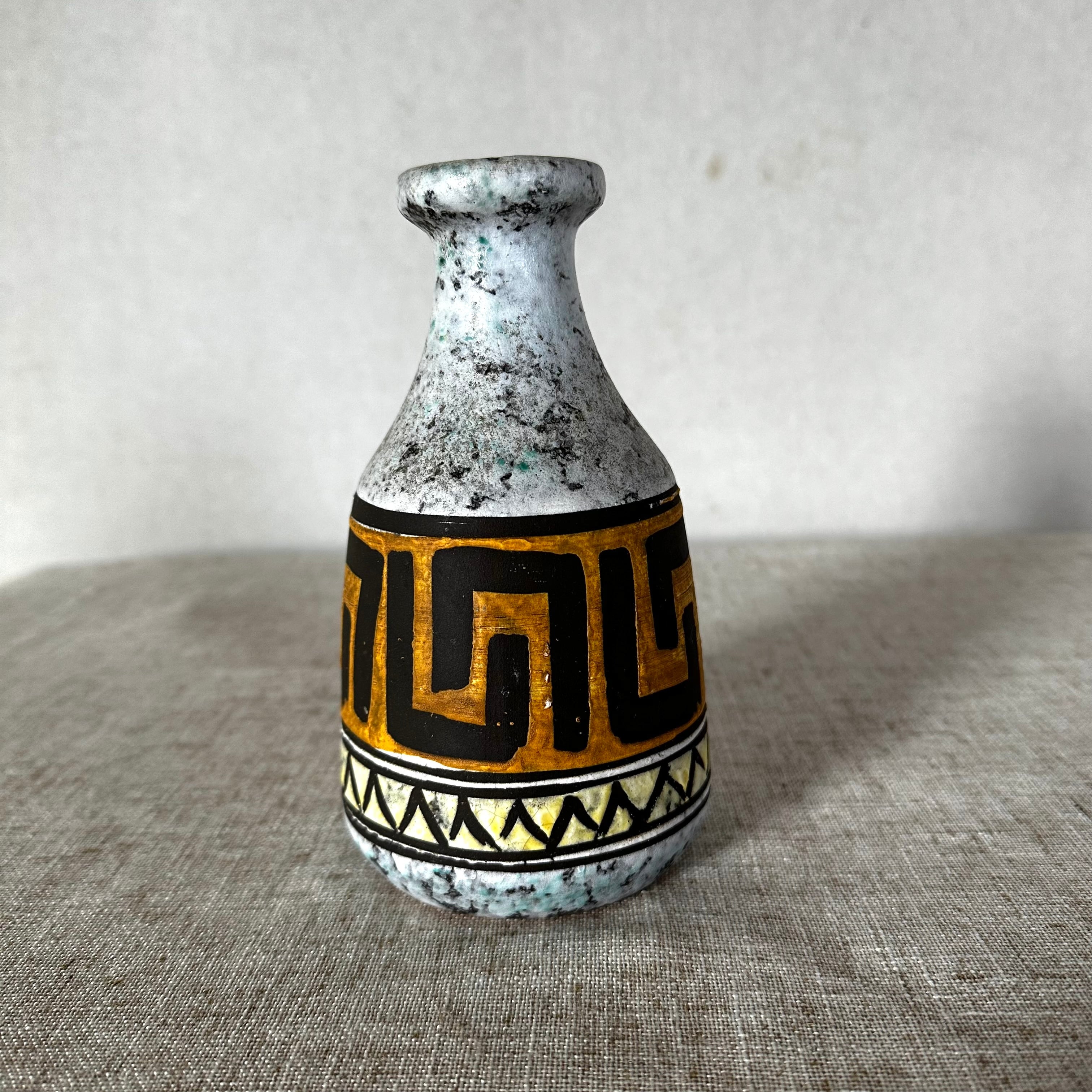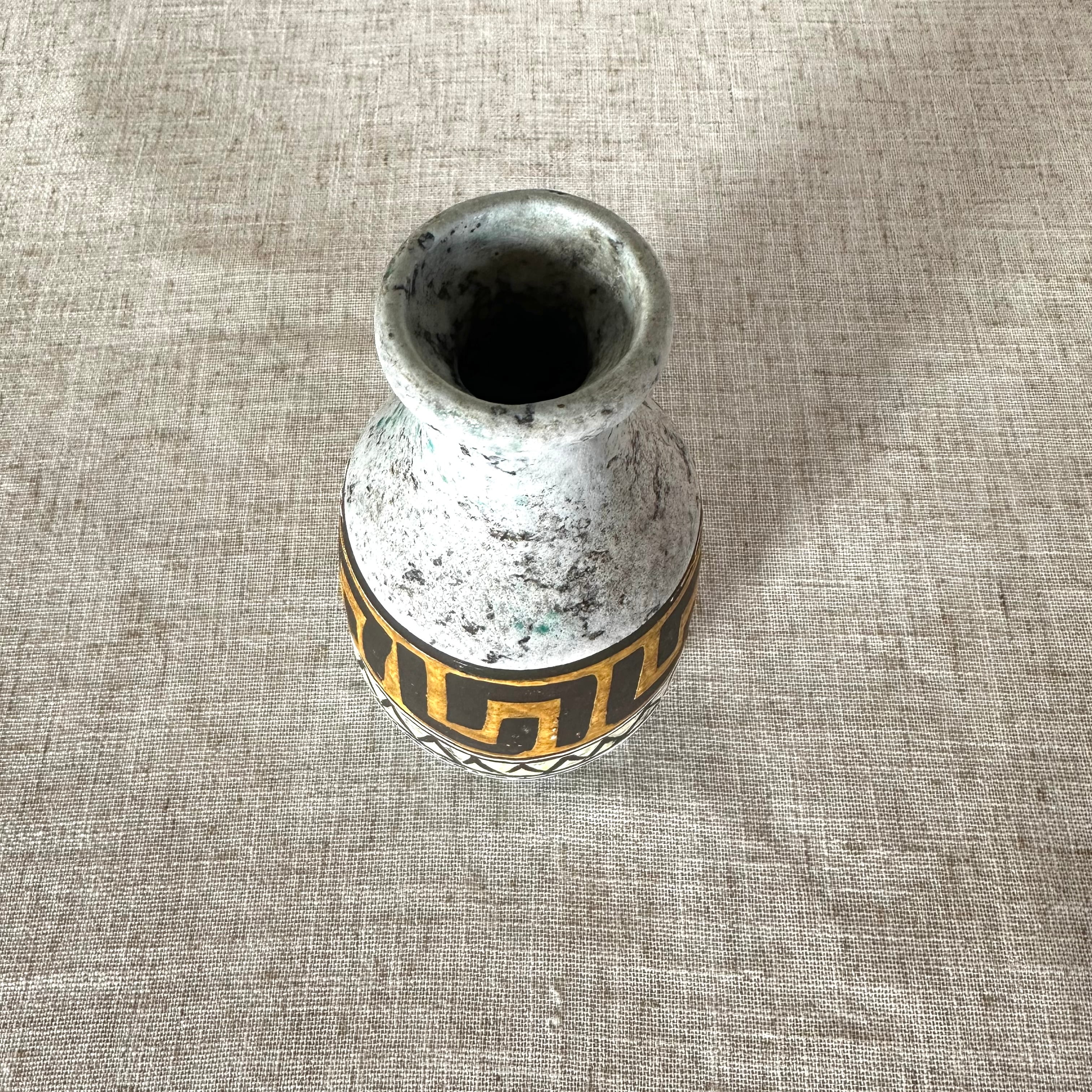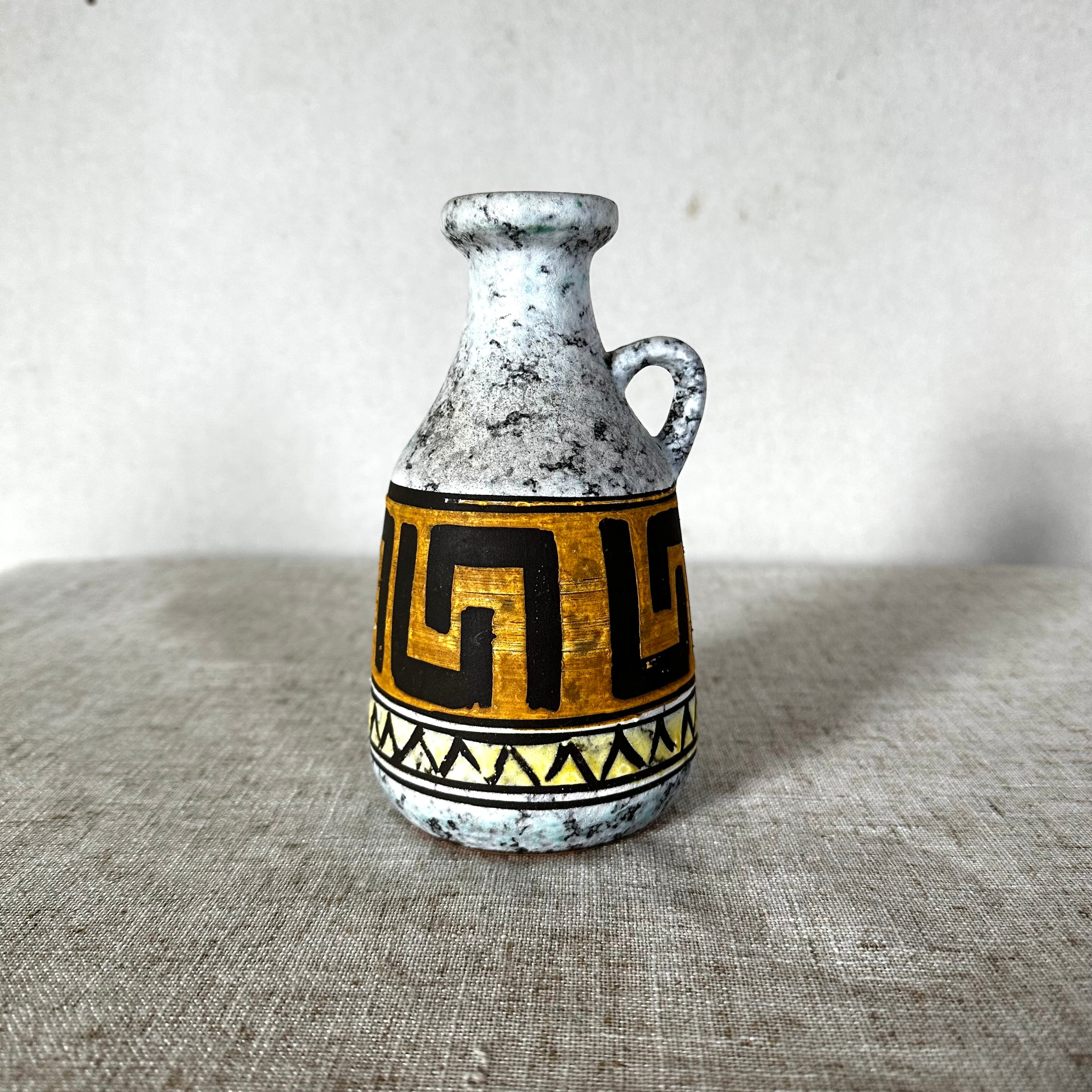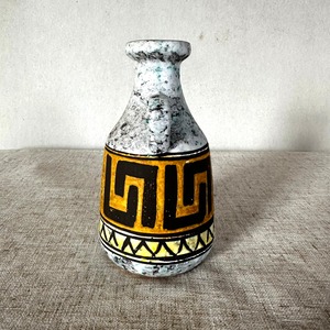 古代ギリシャのミアンダー文様を思わせる装飾が施された、旧東ドイツ・Strehla製の小ぶりなピッチャーベース。ざらつきのある独特の釉薬と、くすんだゴールドのラインが相まって、時代の空気をまとった佇まいが魅力的です。