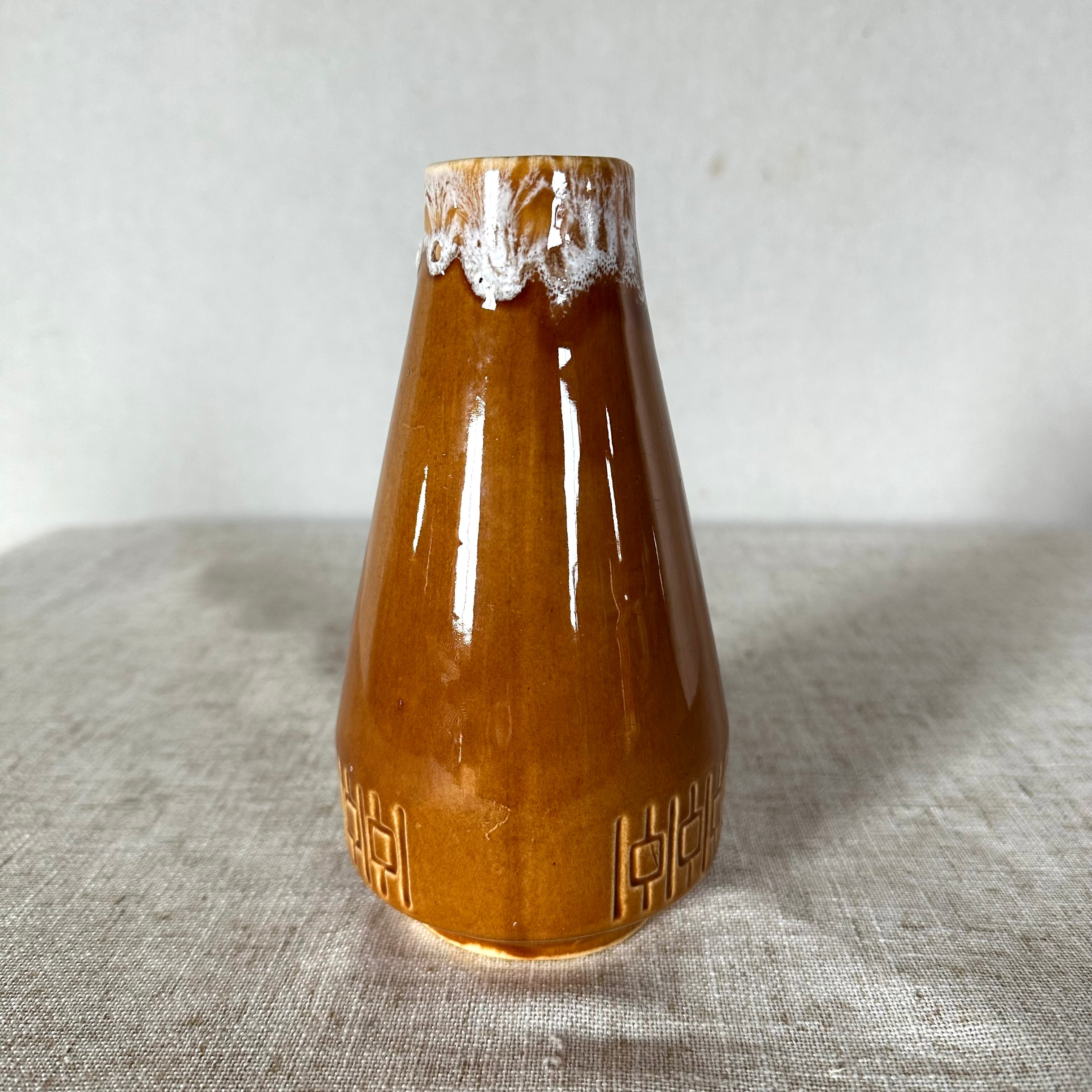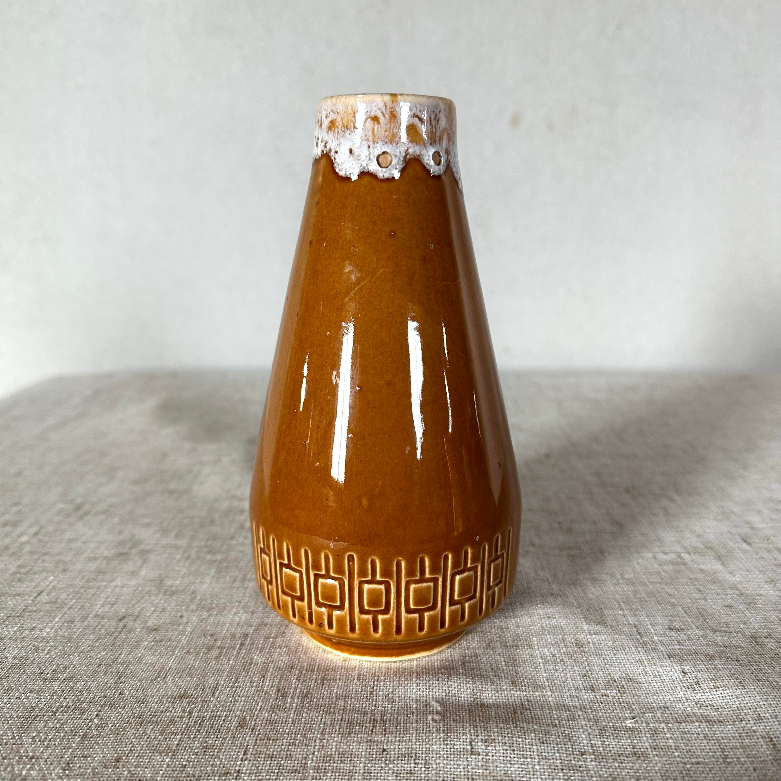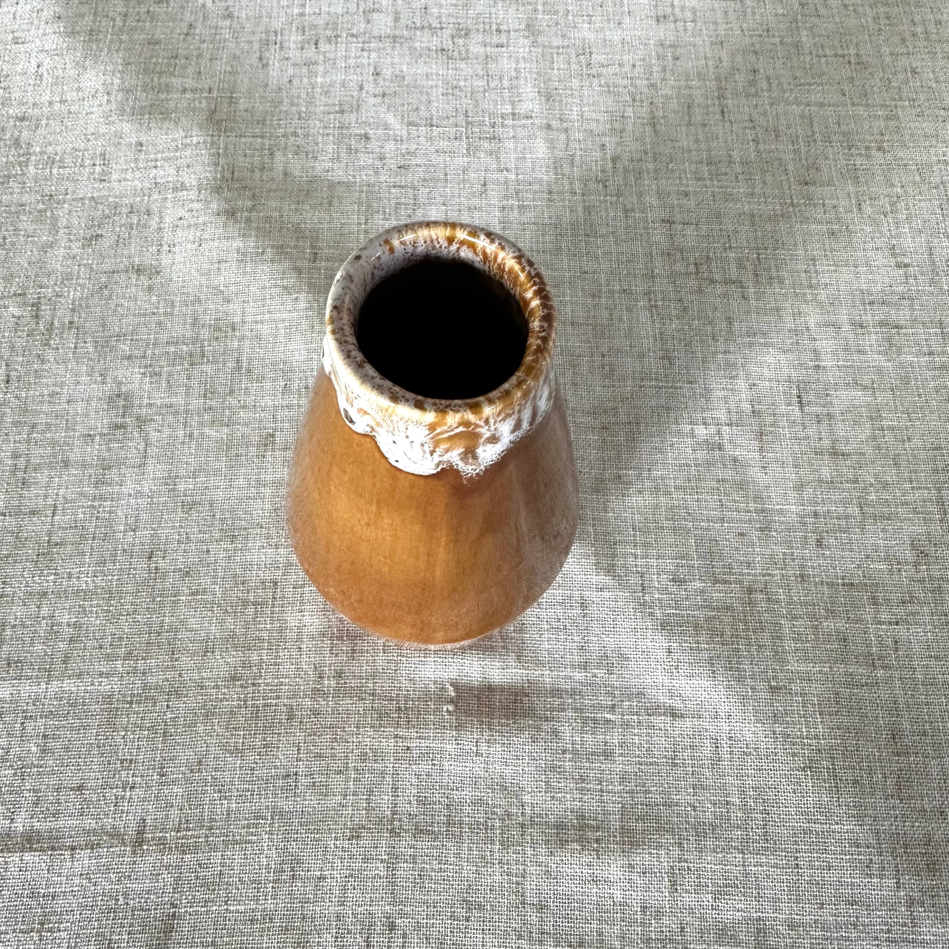 キャラメルブラウン釉に白釉がゆるやかに垂れ落ちる、ミッドセンチュリー期の旧東ドイツ陶器。 脚まわりには幾何学的なライン装飾が刻まれ、シンプルな円錐フォルムに柔らかなリズムを添えています。小ぶりながら空間に温かみをもたらす花器で、北欧インテリアや和の空間にも自然に溶け込む一点。 【国】East Germany(GDR) 【年代】1960–1970s 【素材】Ceramic 【サイズ】高さ16.5cm × 横8cm × 口径3cm 【状態】良好(細かな釉ムラ・薄いスレあり)