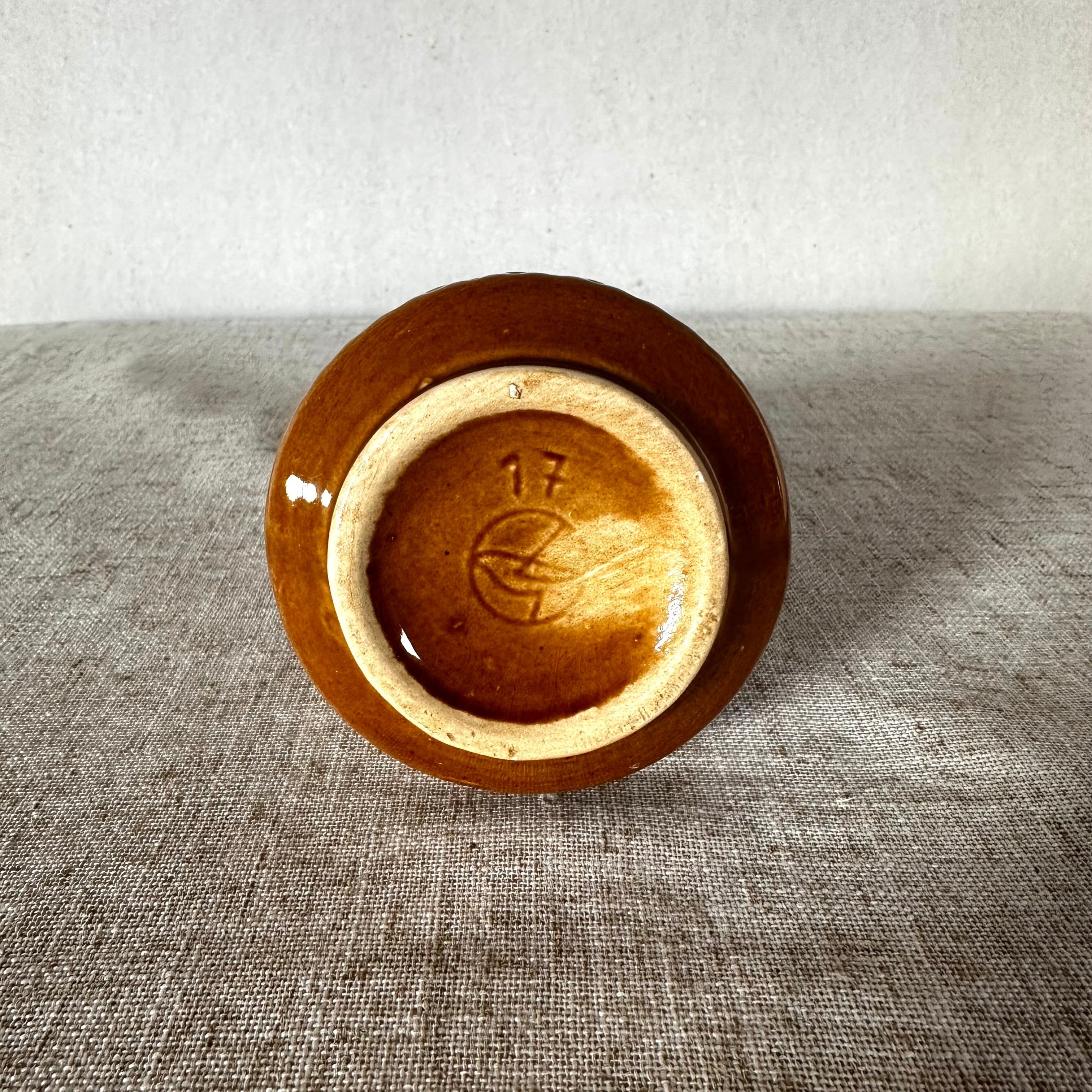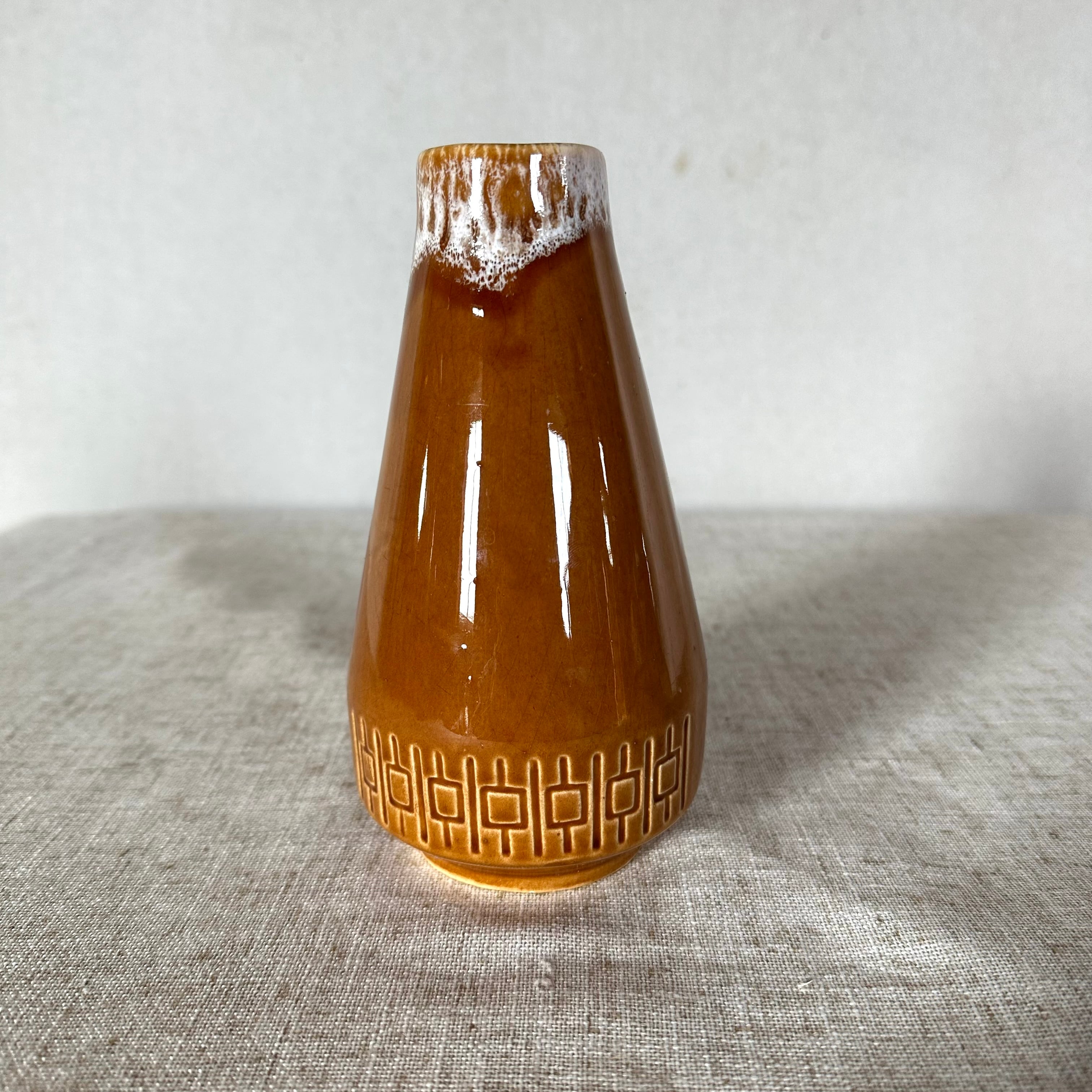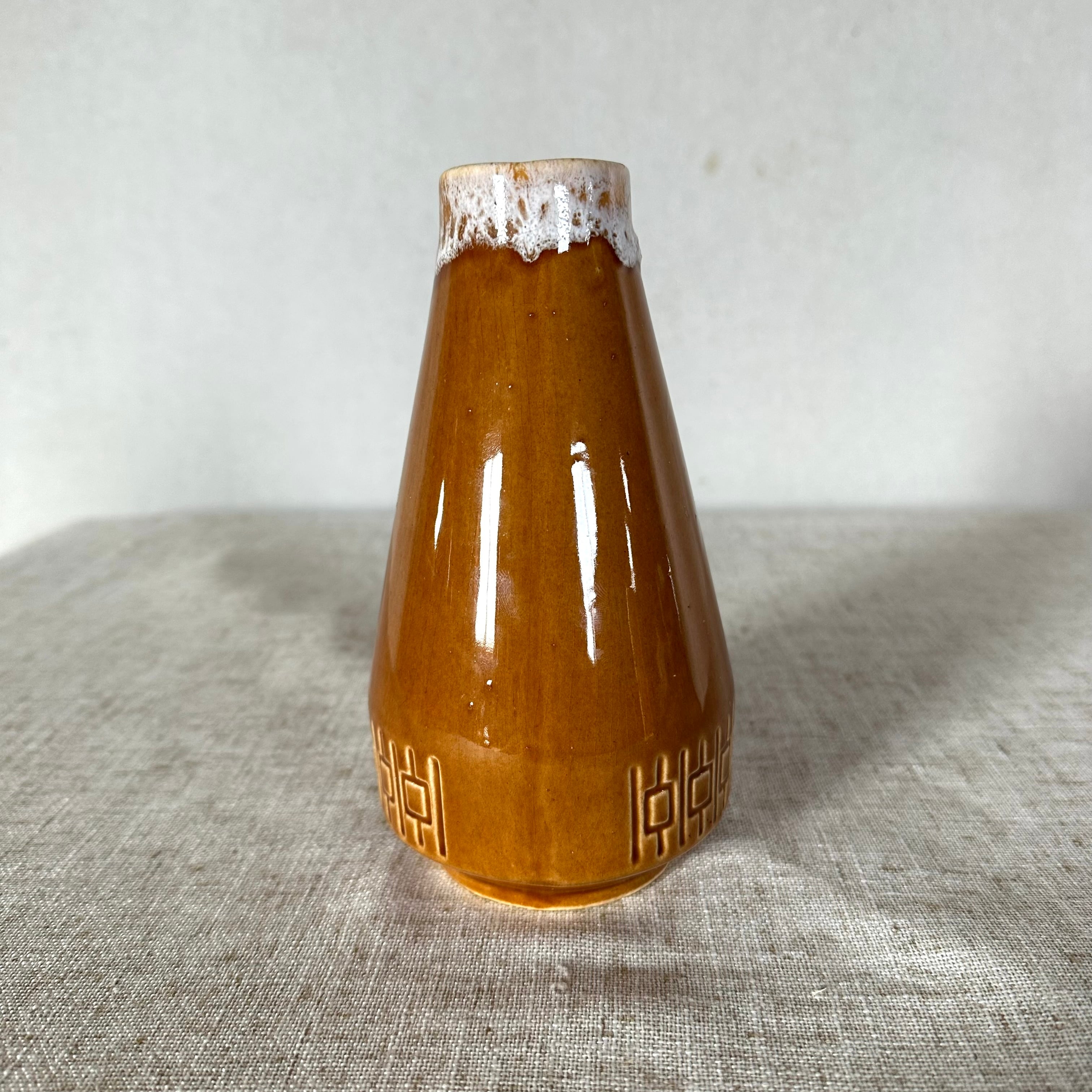 キャラメルブラウン釉に白釉がゆるやかに垂れ落ちる、ミッドセンチュリー期の旧東ドイツ陶器。 脚まわりには幾何学的なライン装飾が刻まれ、シンプルな円錐フォルムに柔らかなリズムを添えています。小ぶりながら空間に温かみをもたらす花器で、北欧インテリアや和の空間にも自然に溶け込む一点。 【国】East Germany(GDR) 【年代】1960–1970s 【素材】Ceramic 【サイズ】高さ16.5cm × 横8cm × 口径3cm 【状態】良好(細かな釉ムラ・薄いスレあり)
