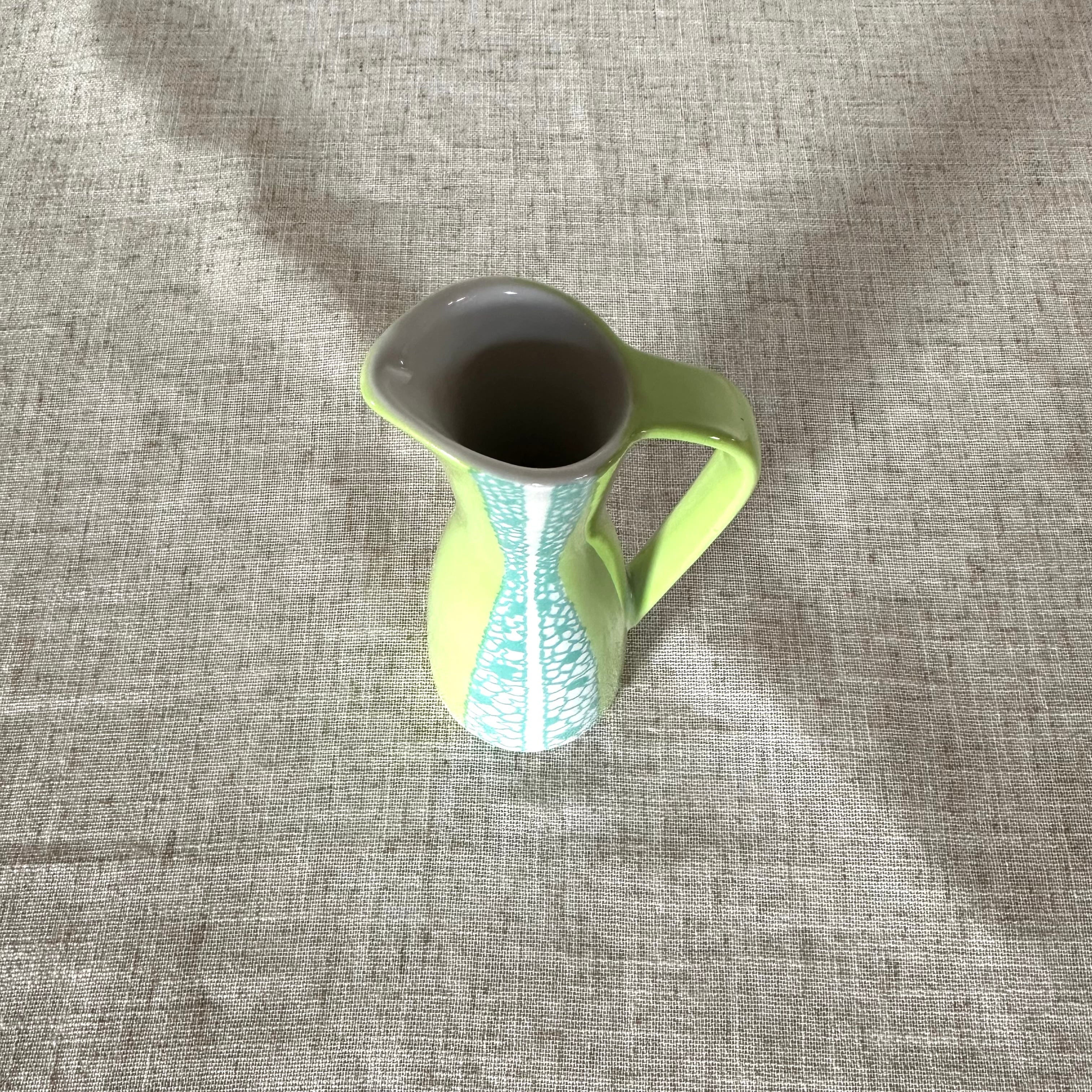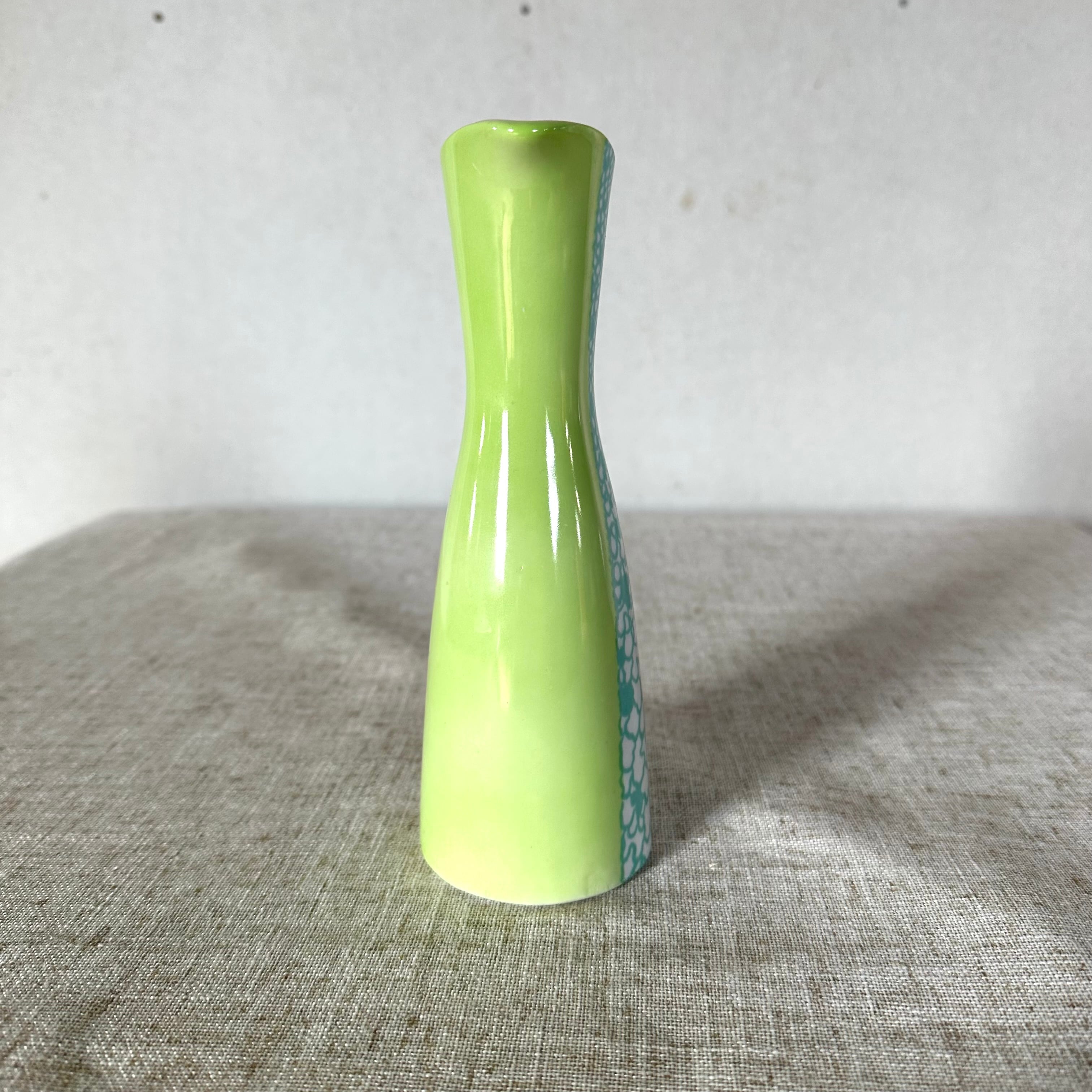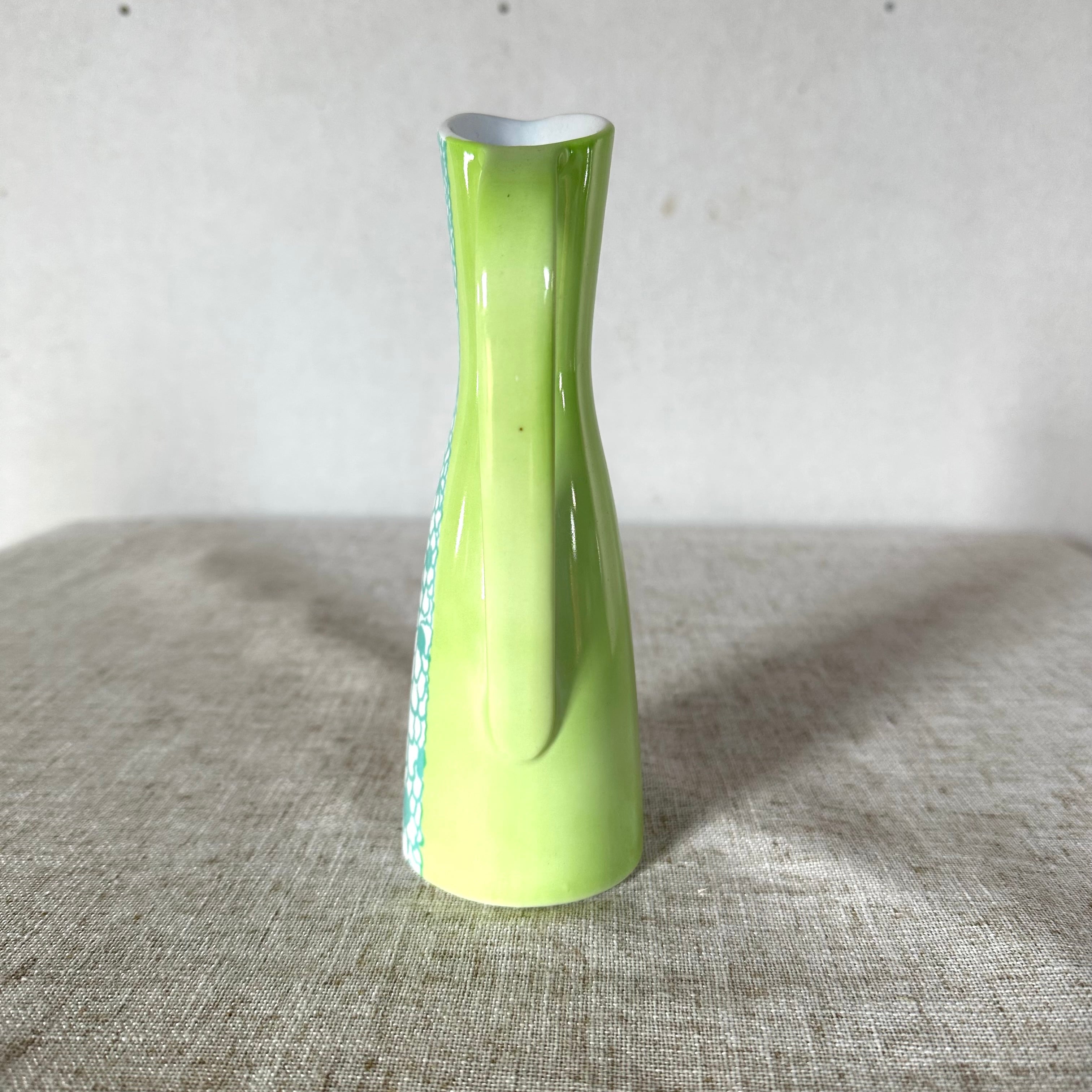 柔らかなライトグリーンを基調に、前面には泡のように広がる白釉の装飾が入り、ミッドセンチュリーらしい軽やかなモダン性が漂います。