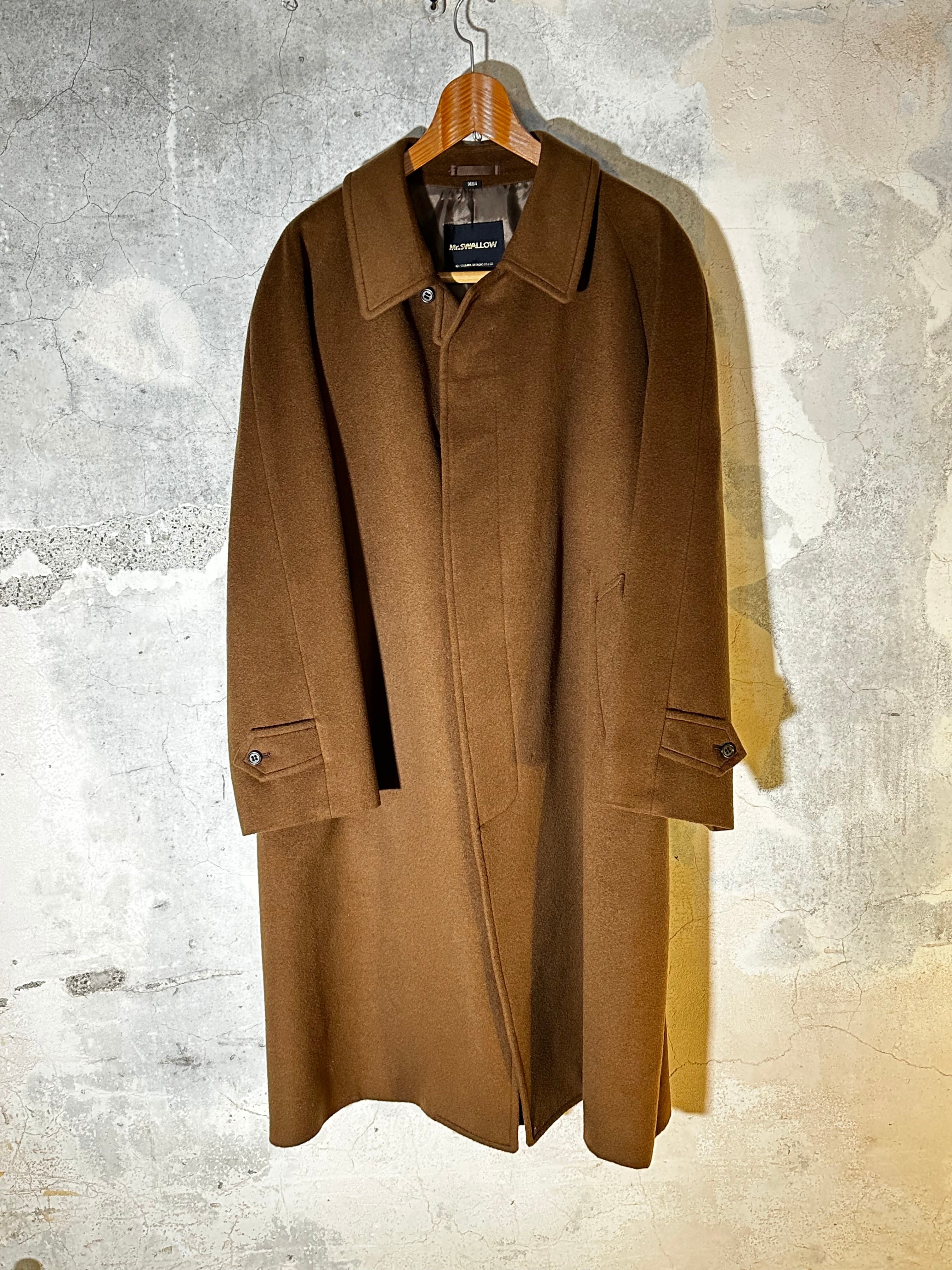上質なウールにカシミヤを30%含んだ、柔らかく上品なロングコート。 ラグランスリーブによる丸みのあるシルエットと、比翼ボタンのミニマルなデザインが魅力です。落ち着いたブラウンカラーで、フォーマルにも日常にも合わせやすい一着。 【サイズ】 着丈 99cm 身幅 60.5cm 袖丈(首元から)71.5cm 【素材】 表地:毛100%(カシミヤ30%含む) 裏地:ポリエステル 【生産国】日本製 【コンディション】良好