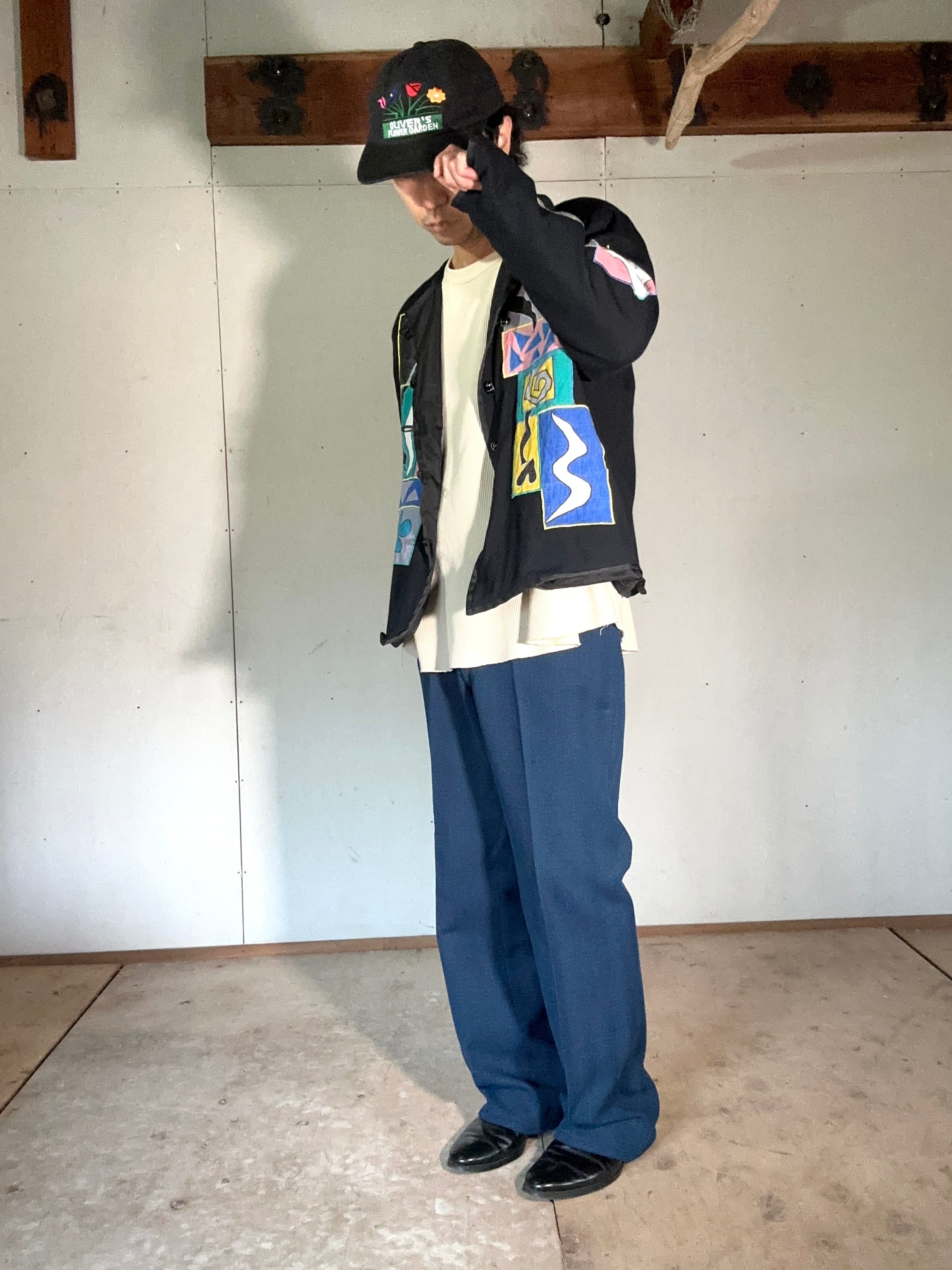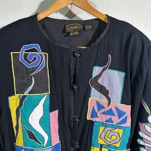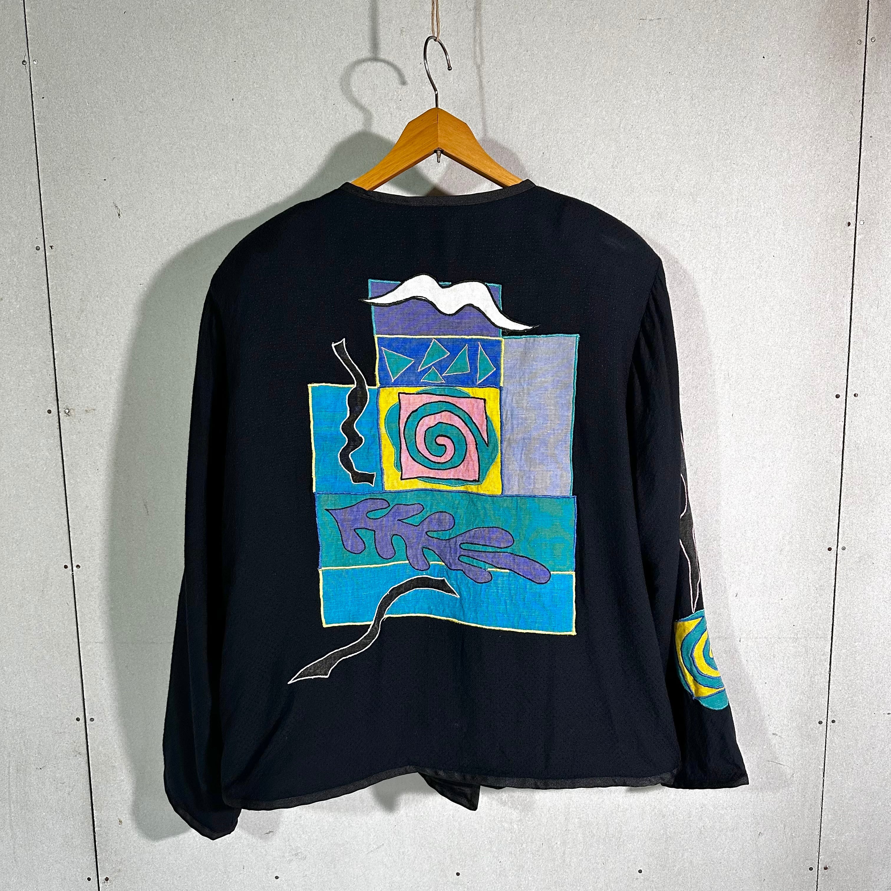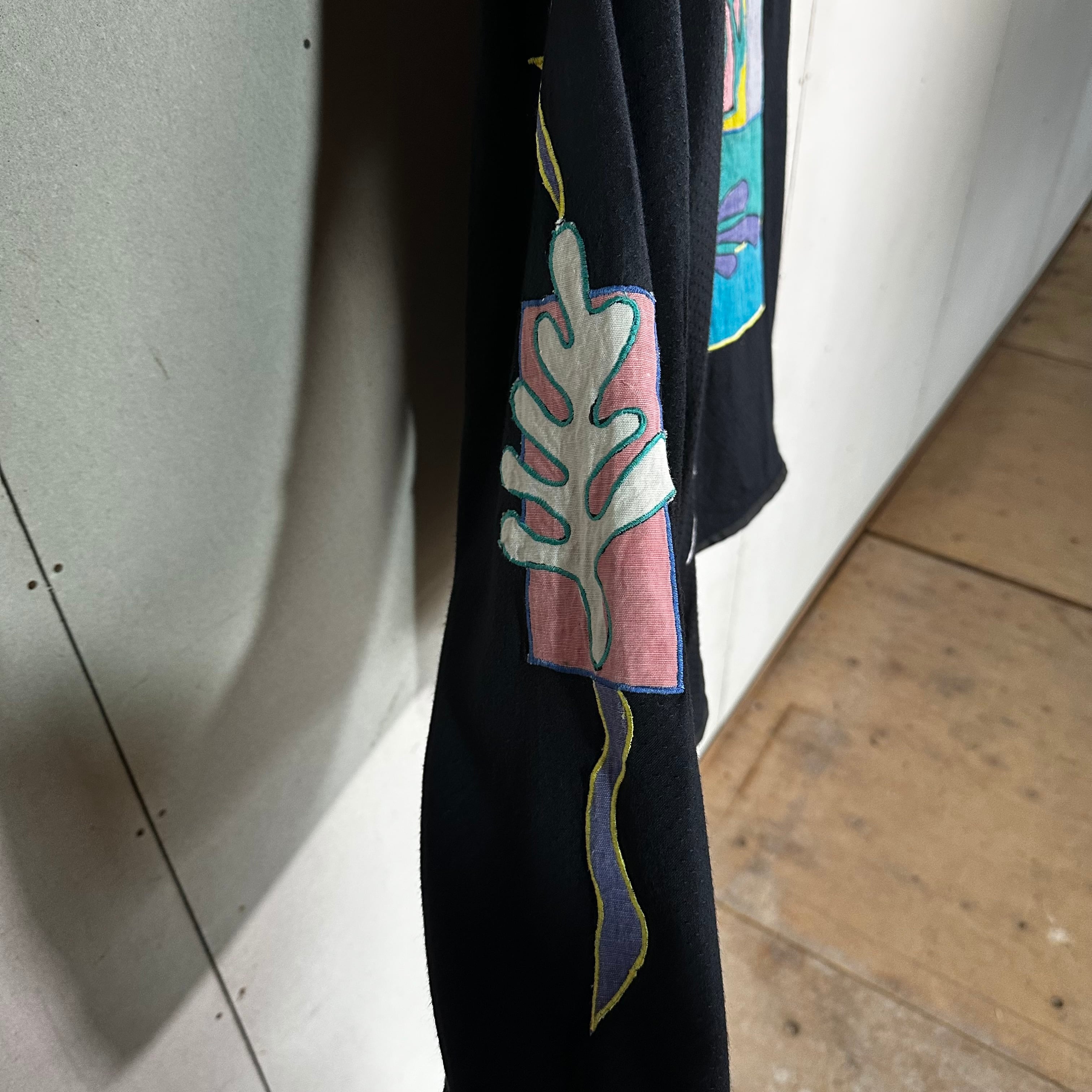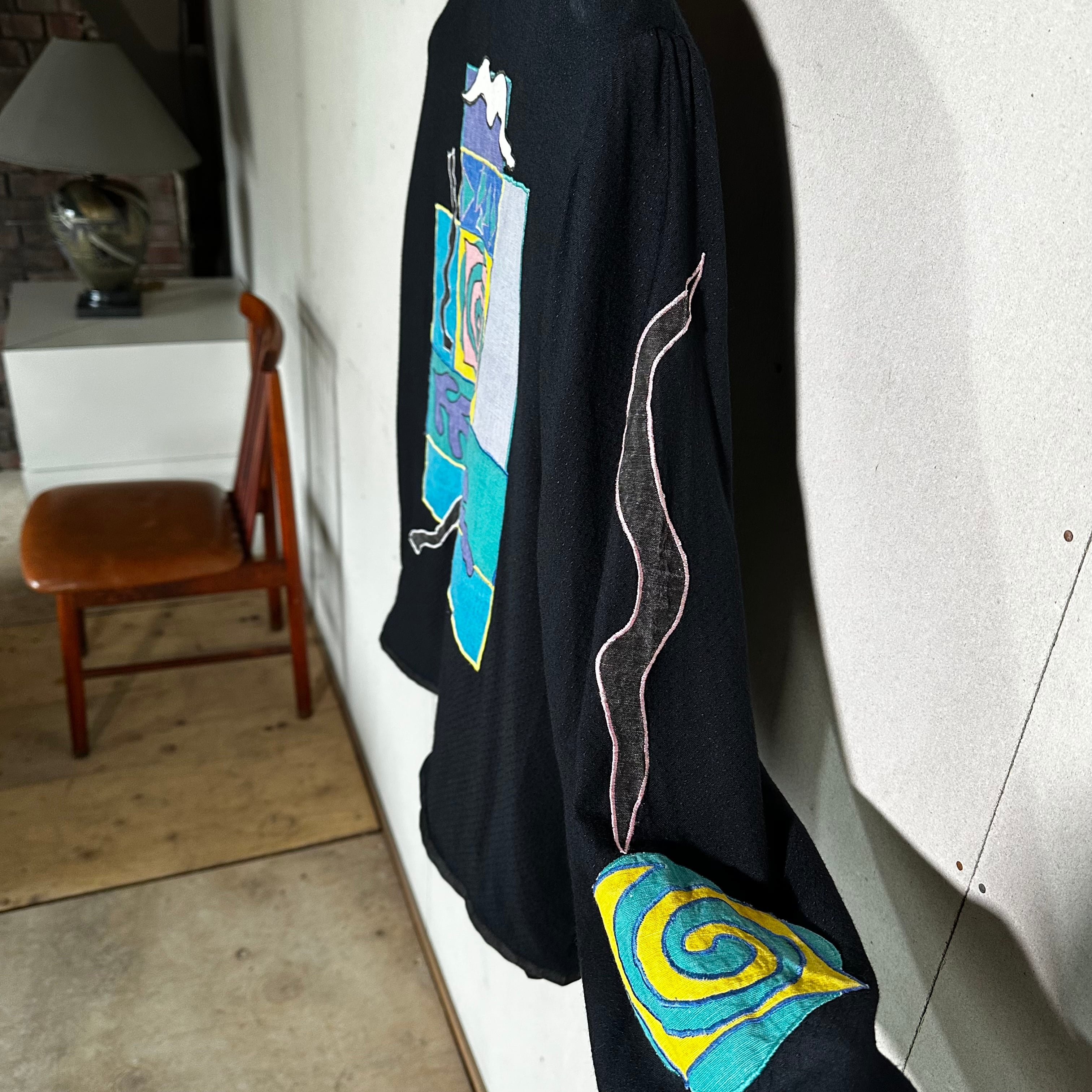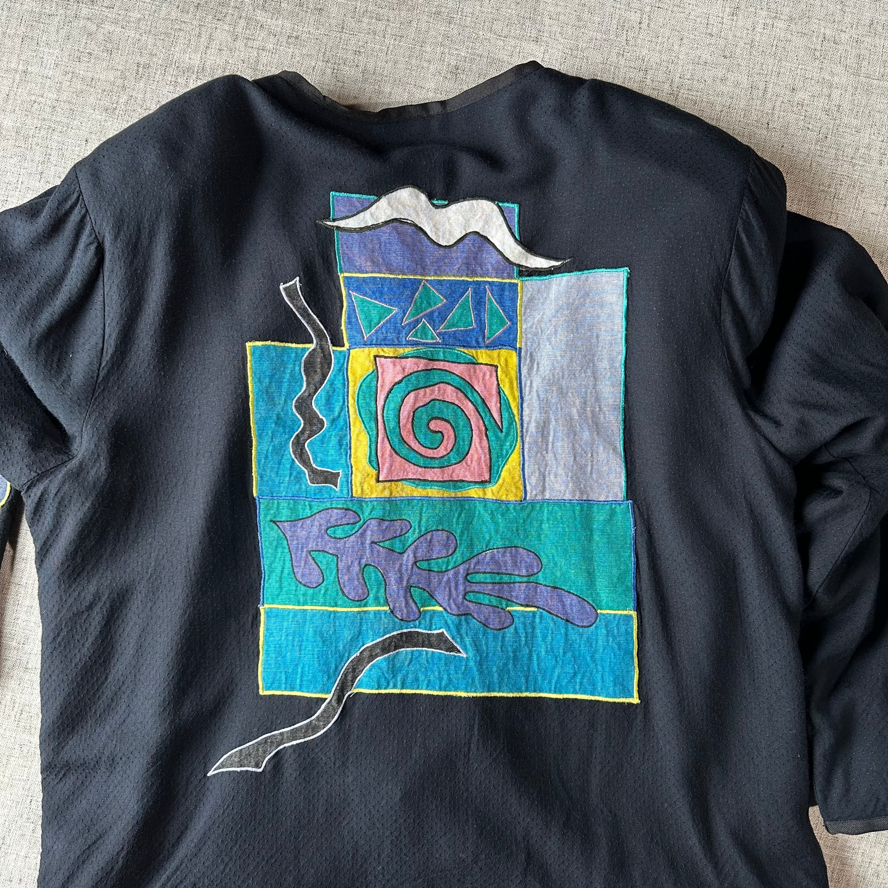 フロント・バック・スリーブ全体に施された抽象アップリケは、ミロやマティスを思わせる遊びと余白のあるデザイン。