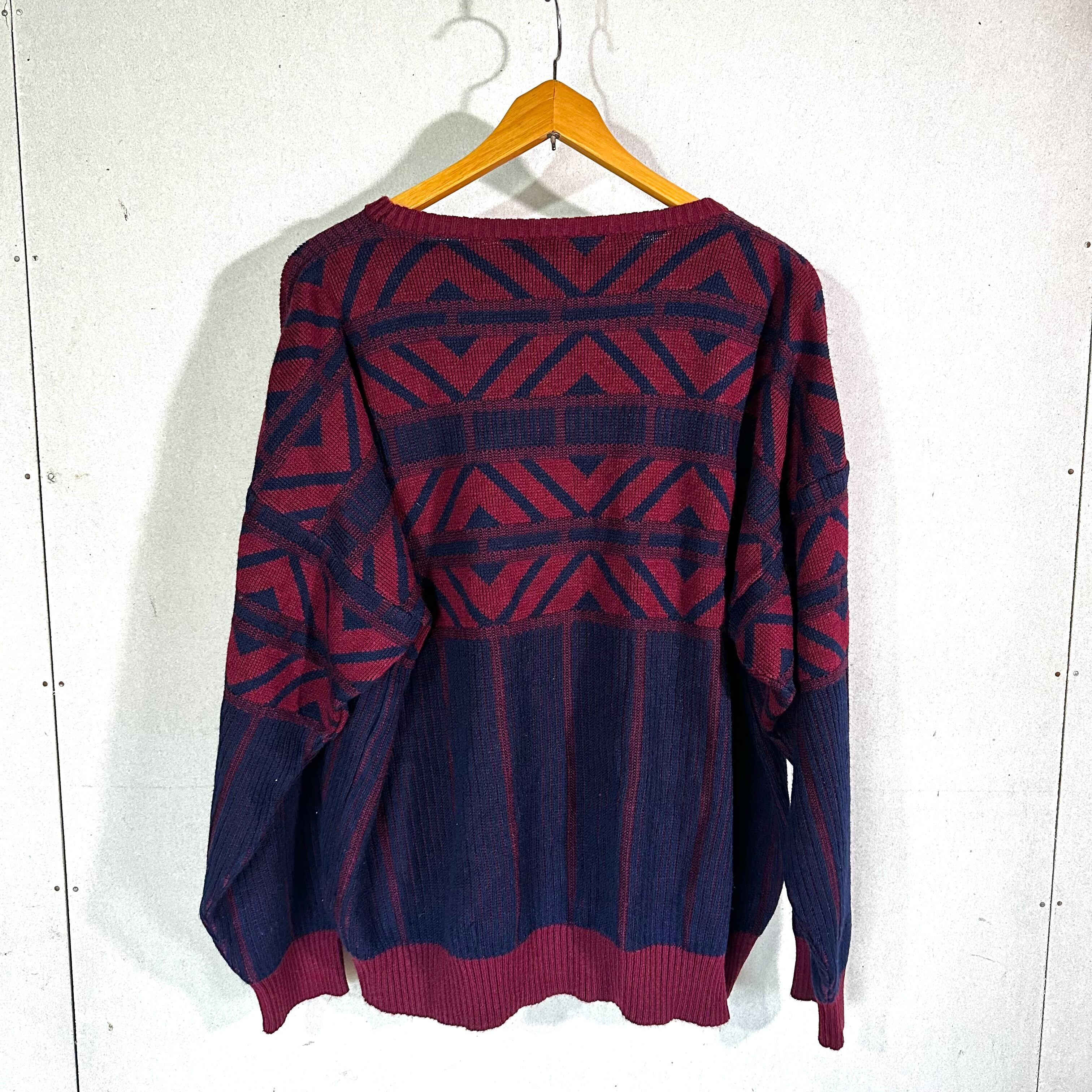 深いバーガンディ × ネイビーの配色が秀逸で、全面に施された幾何学的な柄がコーディネートの主役になる一枚です。