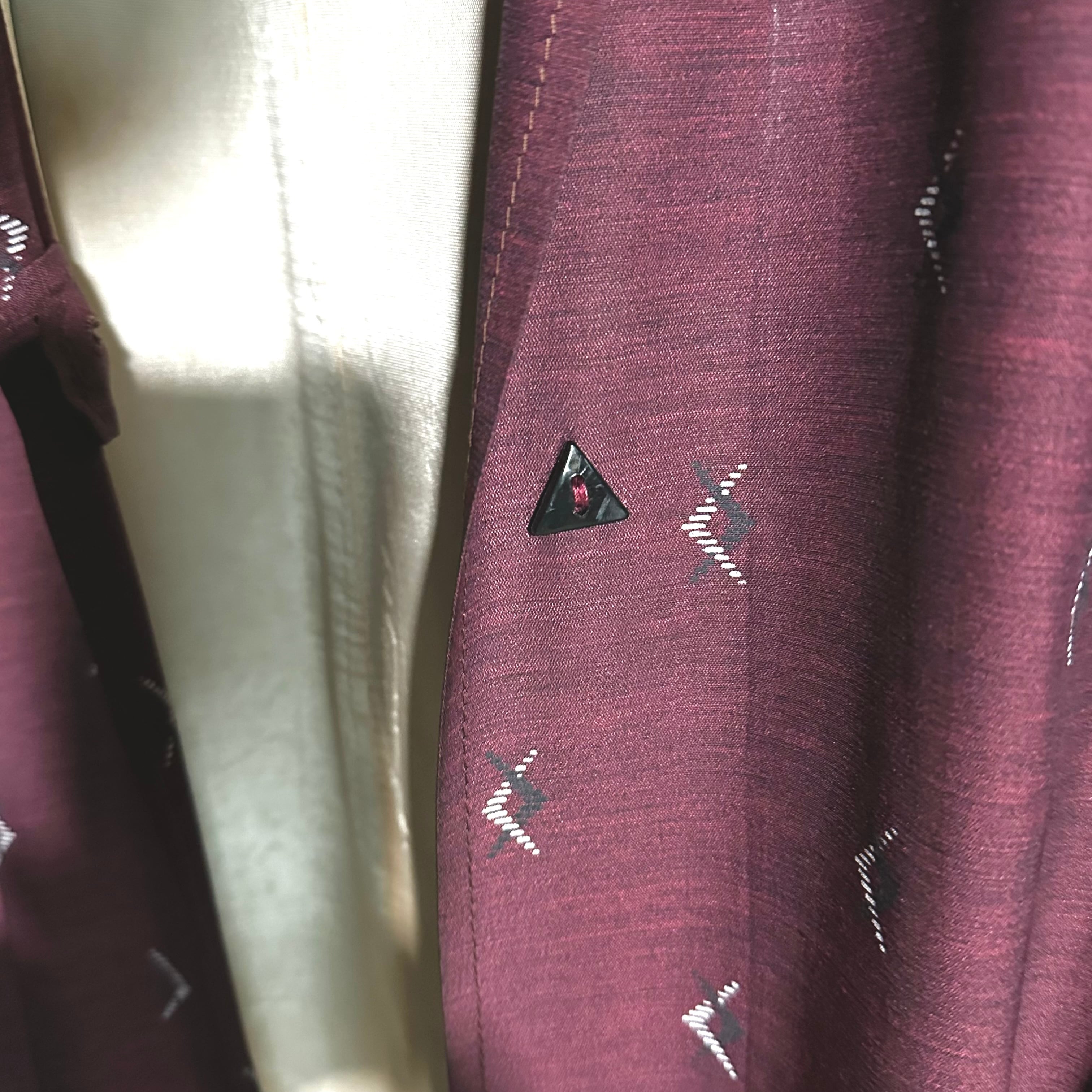 深みのあるボルドーカラーに、小紋調の抽象的な柄が静かに散りばめられています。