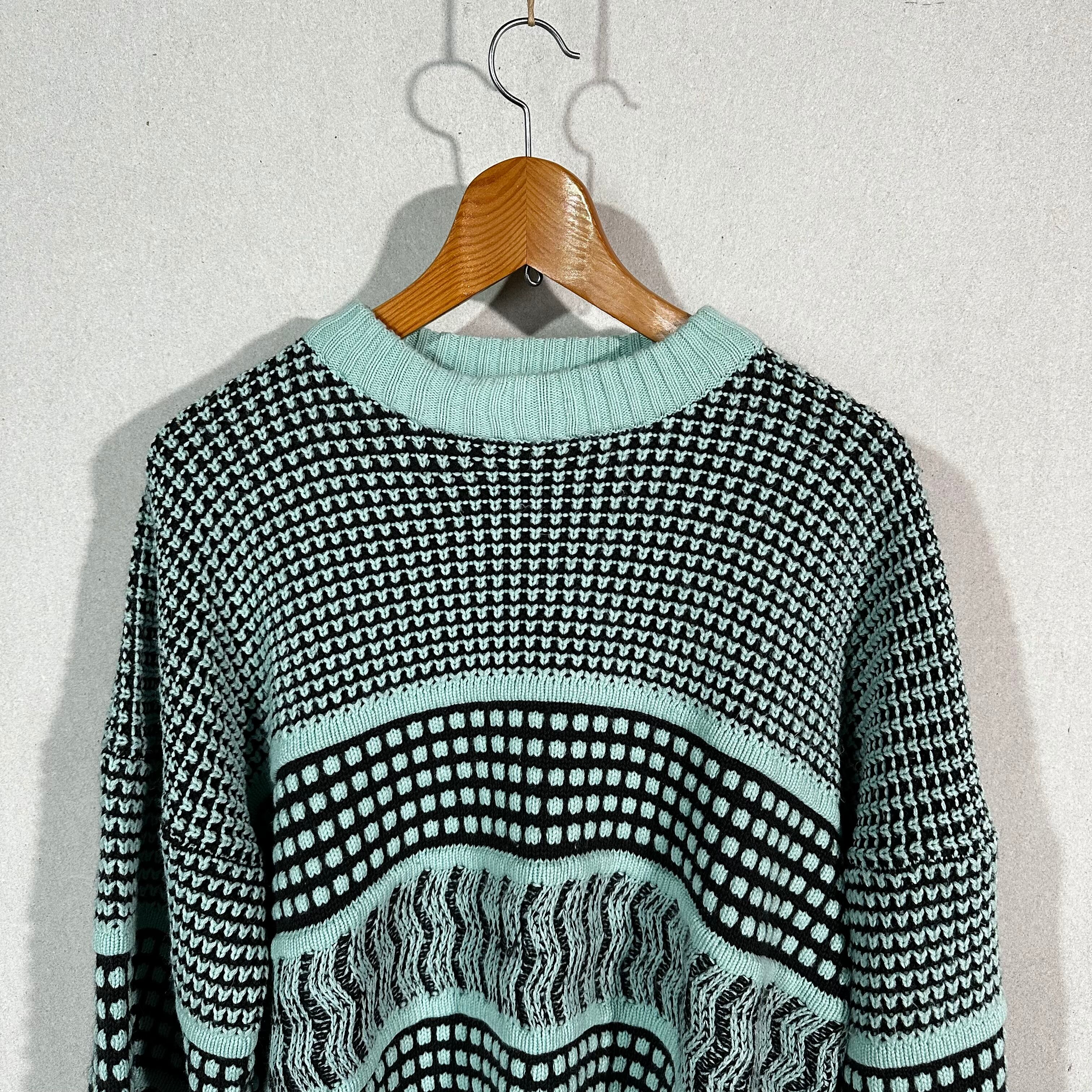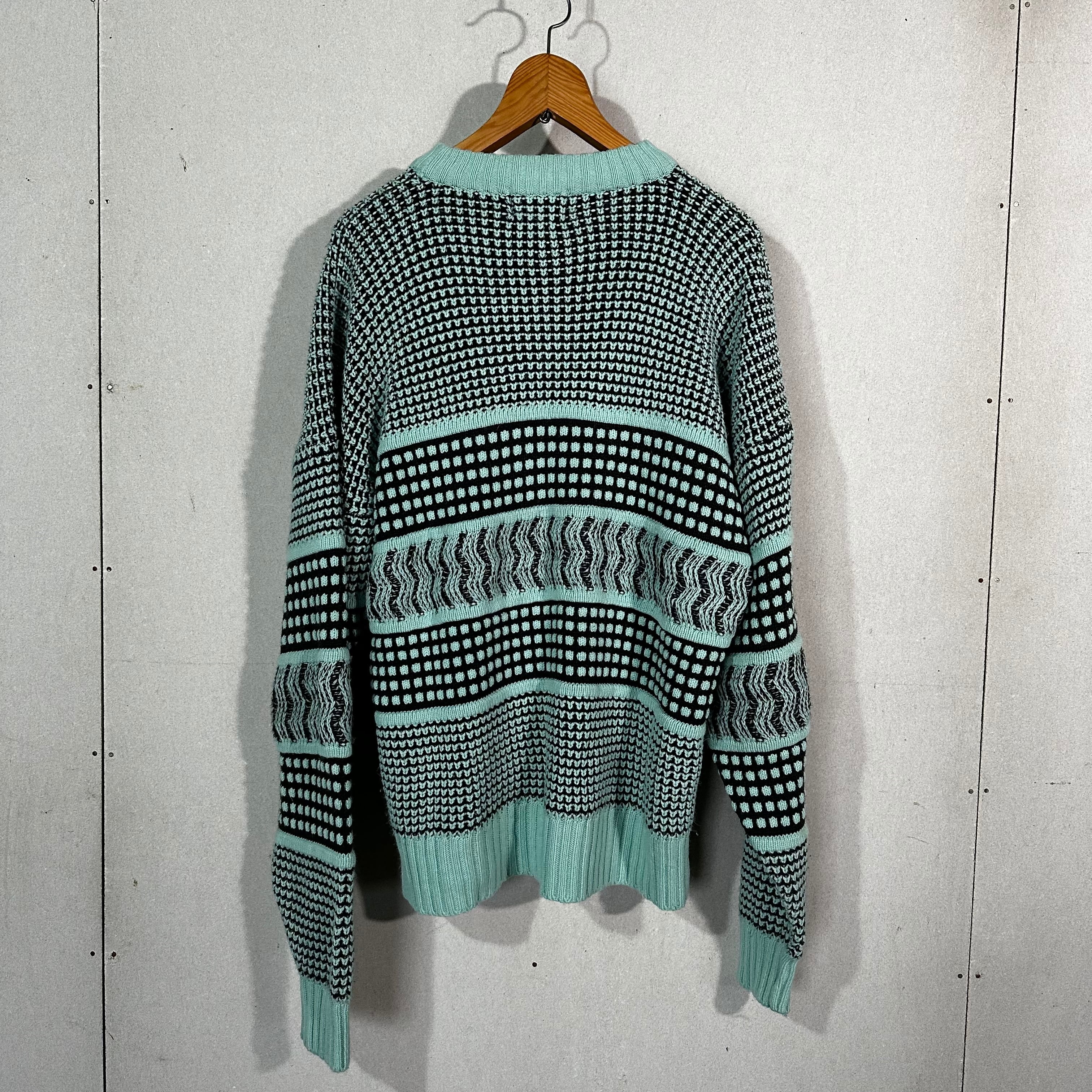 ミントグリーンとブラックを基調に、複数の編み柄を横段で切り替えた、非常に手の込んだ一着です。