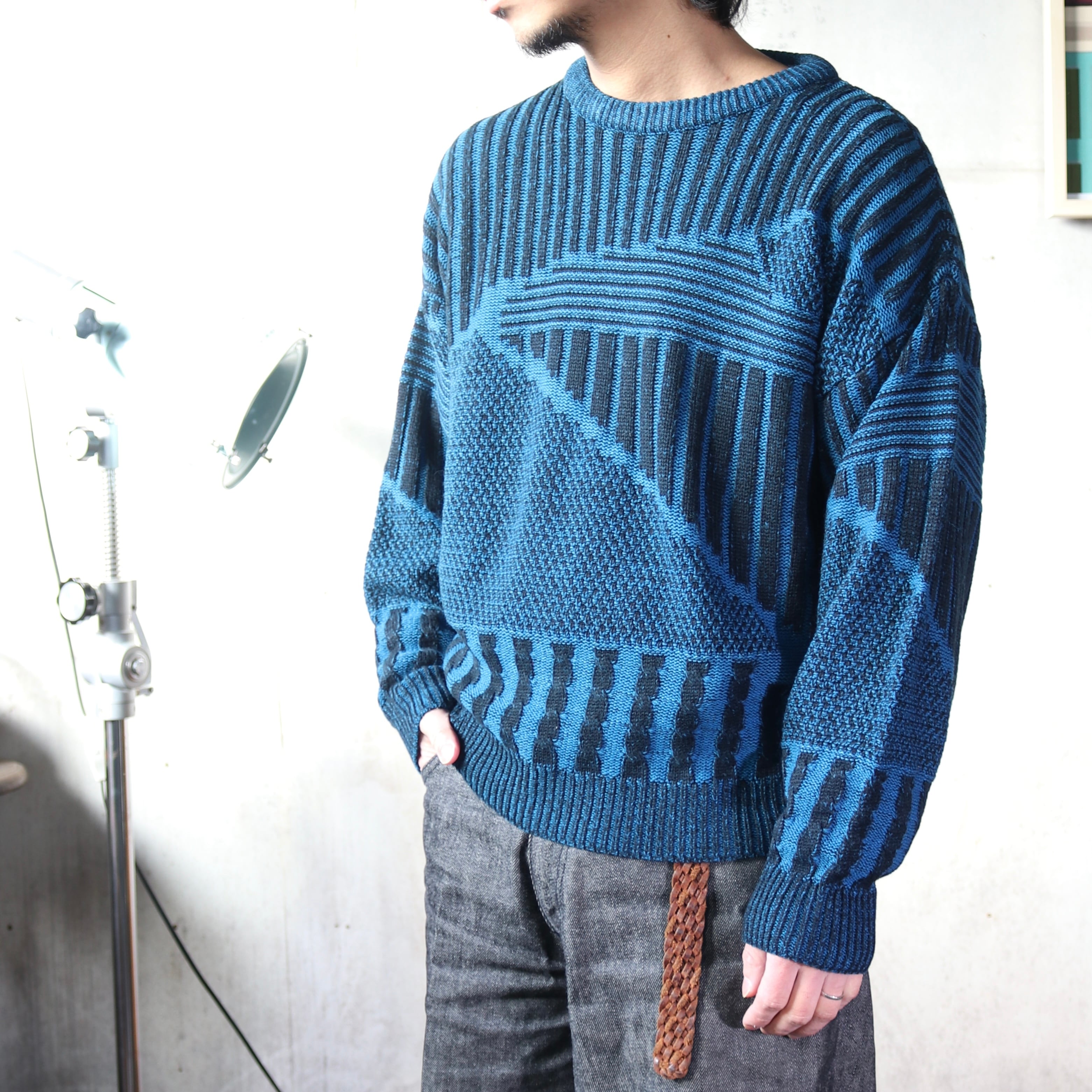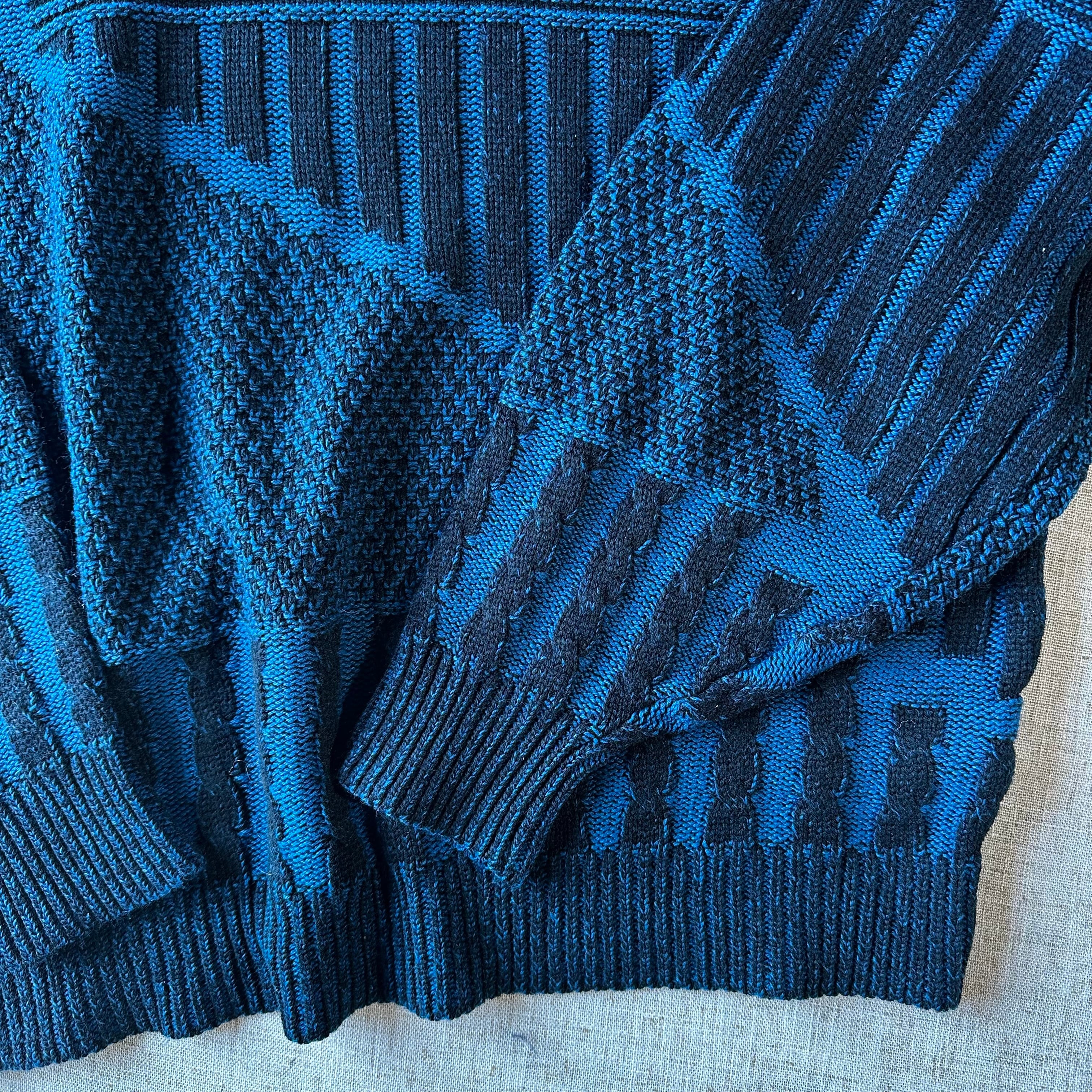 ブルー×ブラックのコントラストに、複数の編み地を切り替えた立体的なパターンが特徴の一着です。