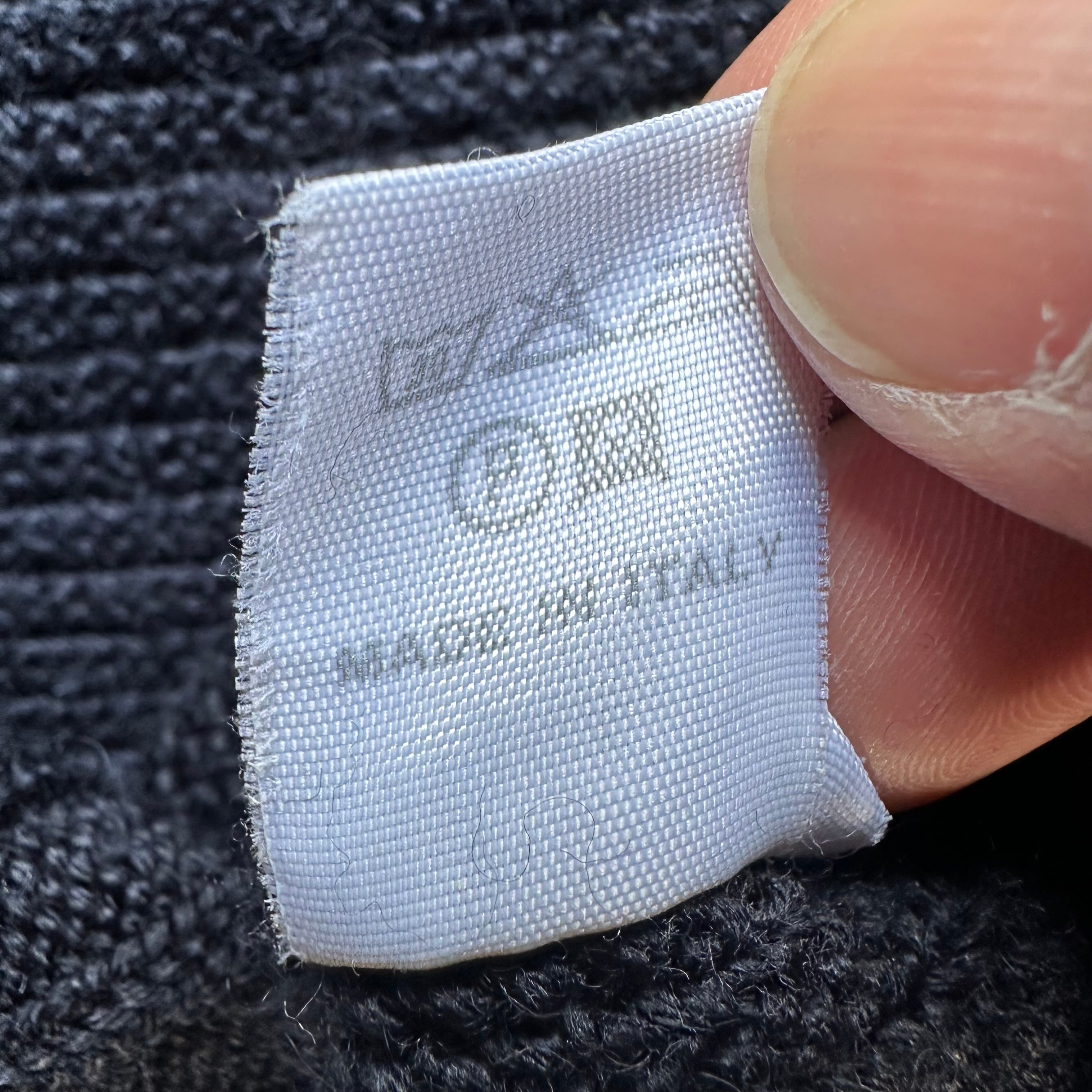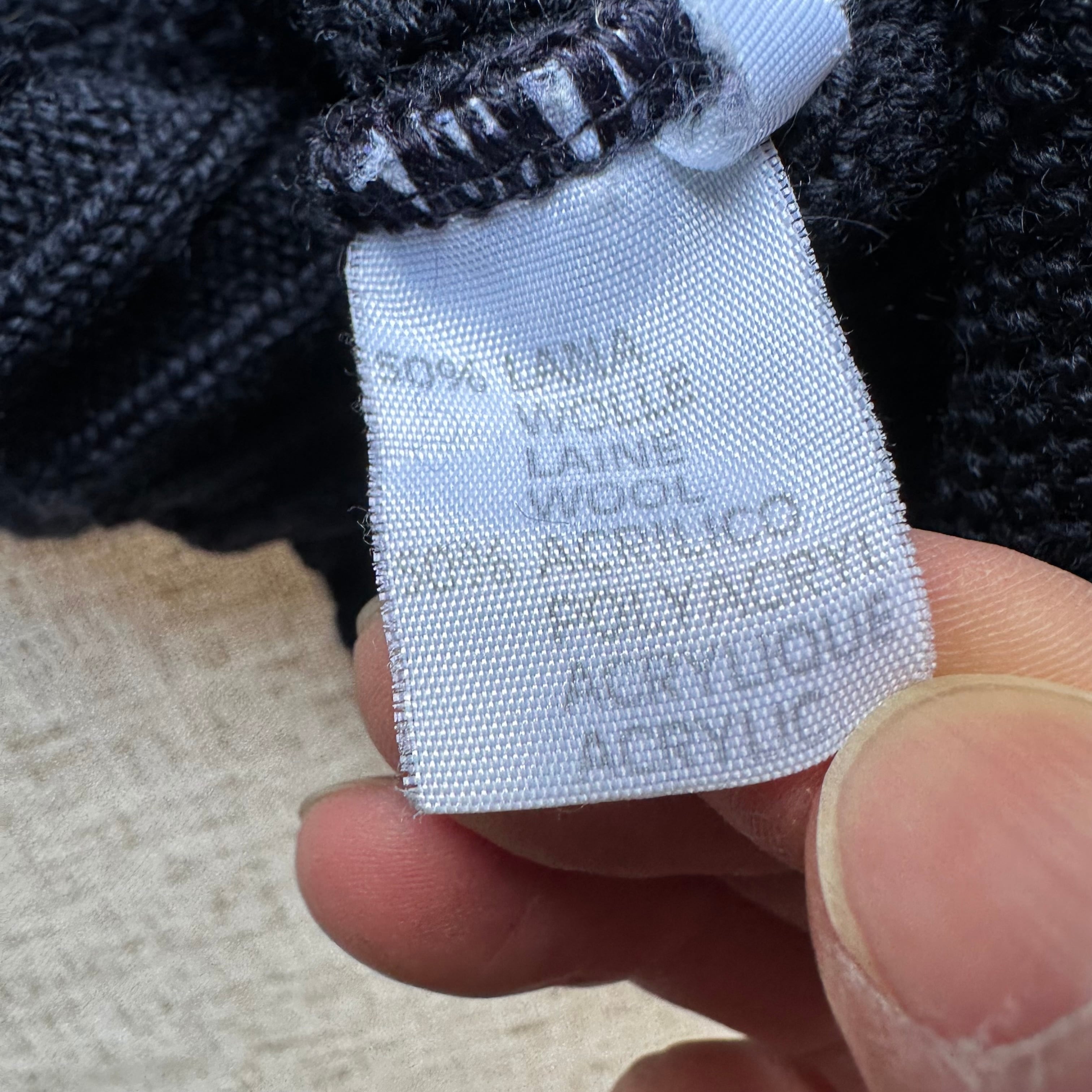 立体感のある縦編みが特徴で、ネイビーベースに走る細いストライプが控えめながら印象的な表情を作っています。