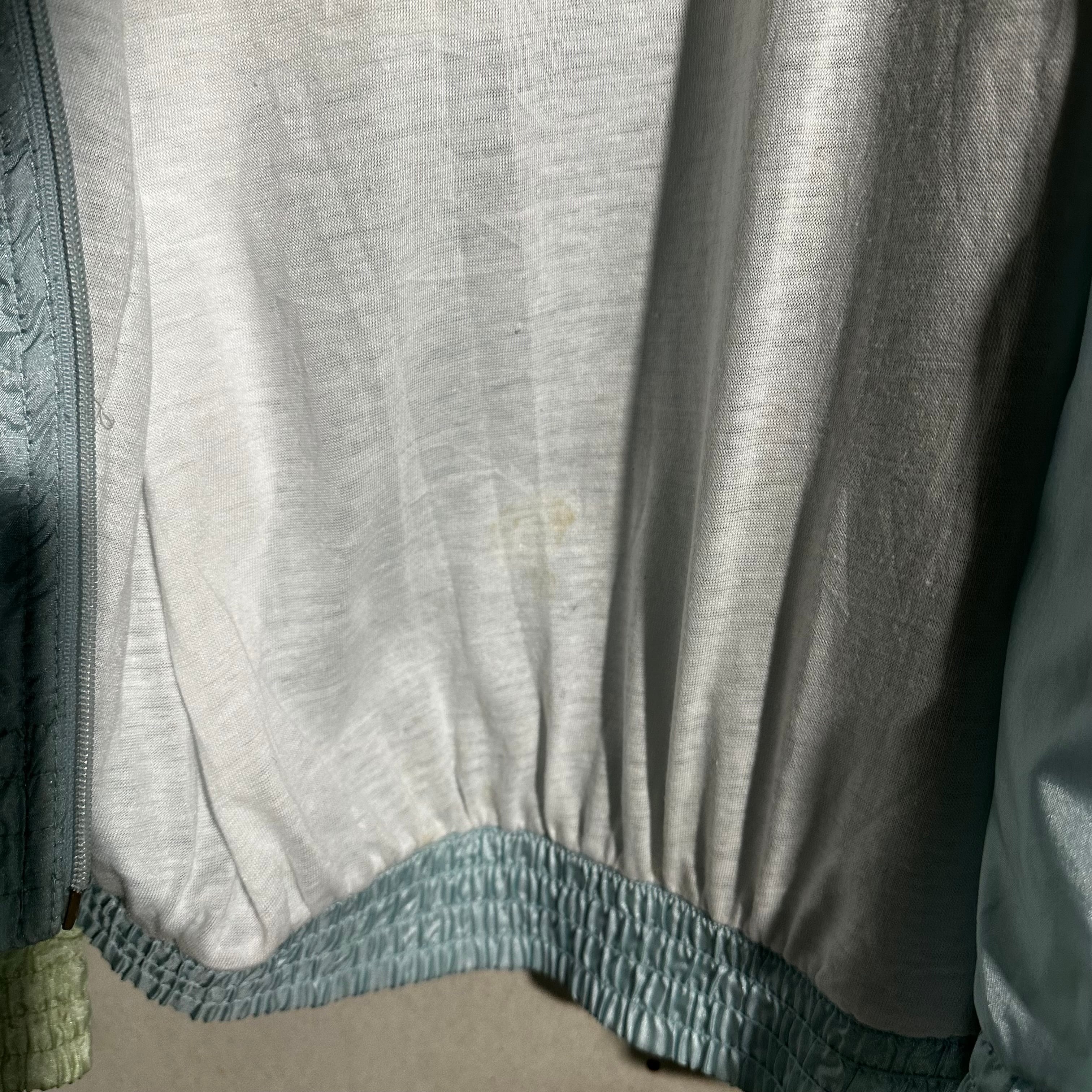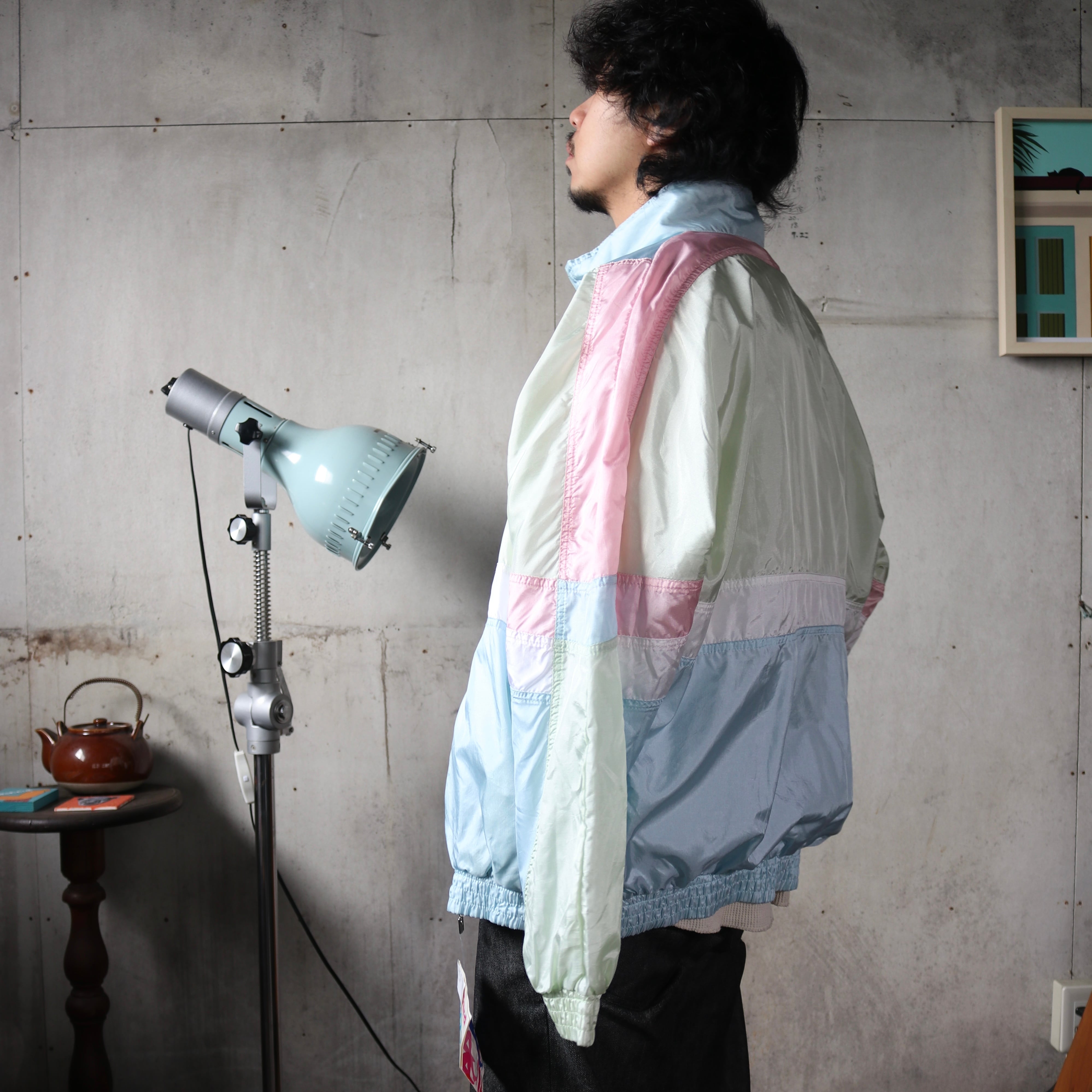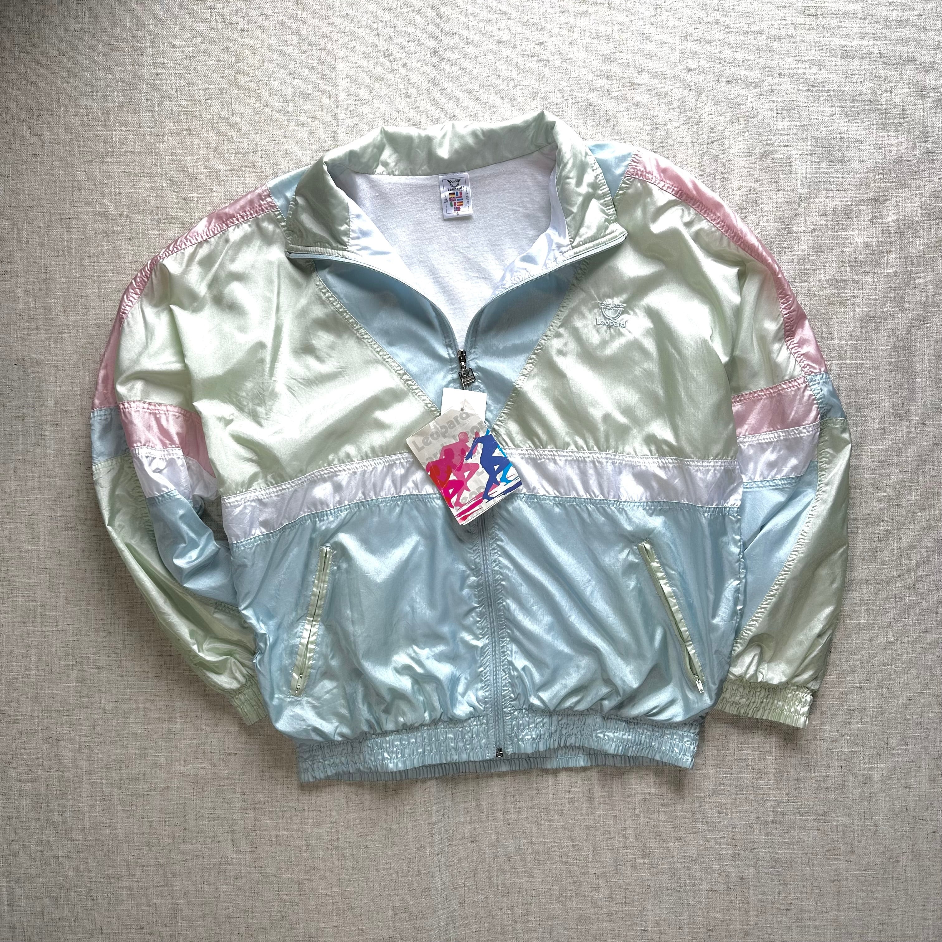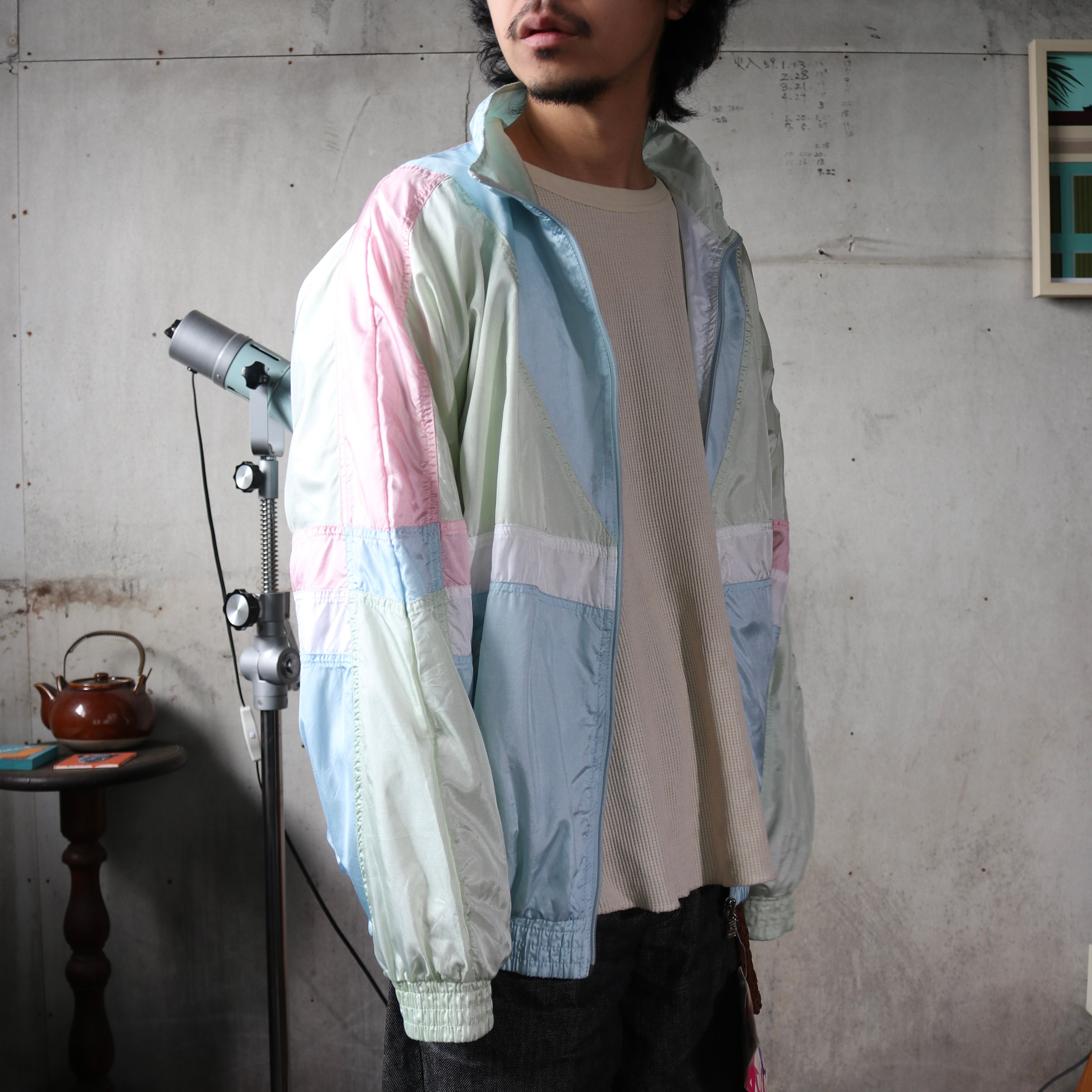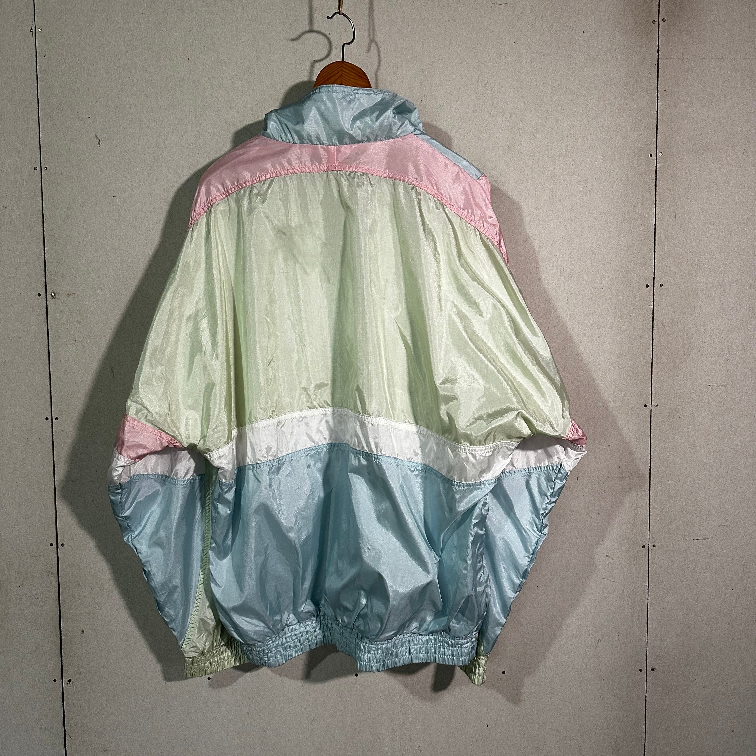 パステル調の切替配色が印象的で、当時のスポーツウェアらしい軽快なデザインが特徴の一着です。