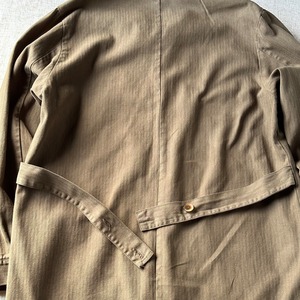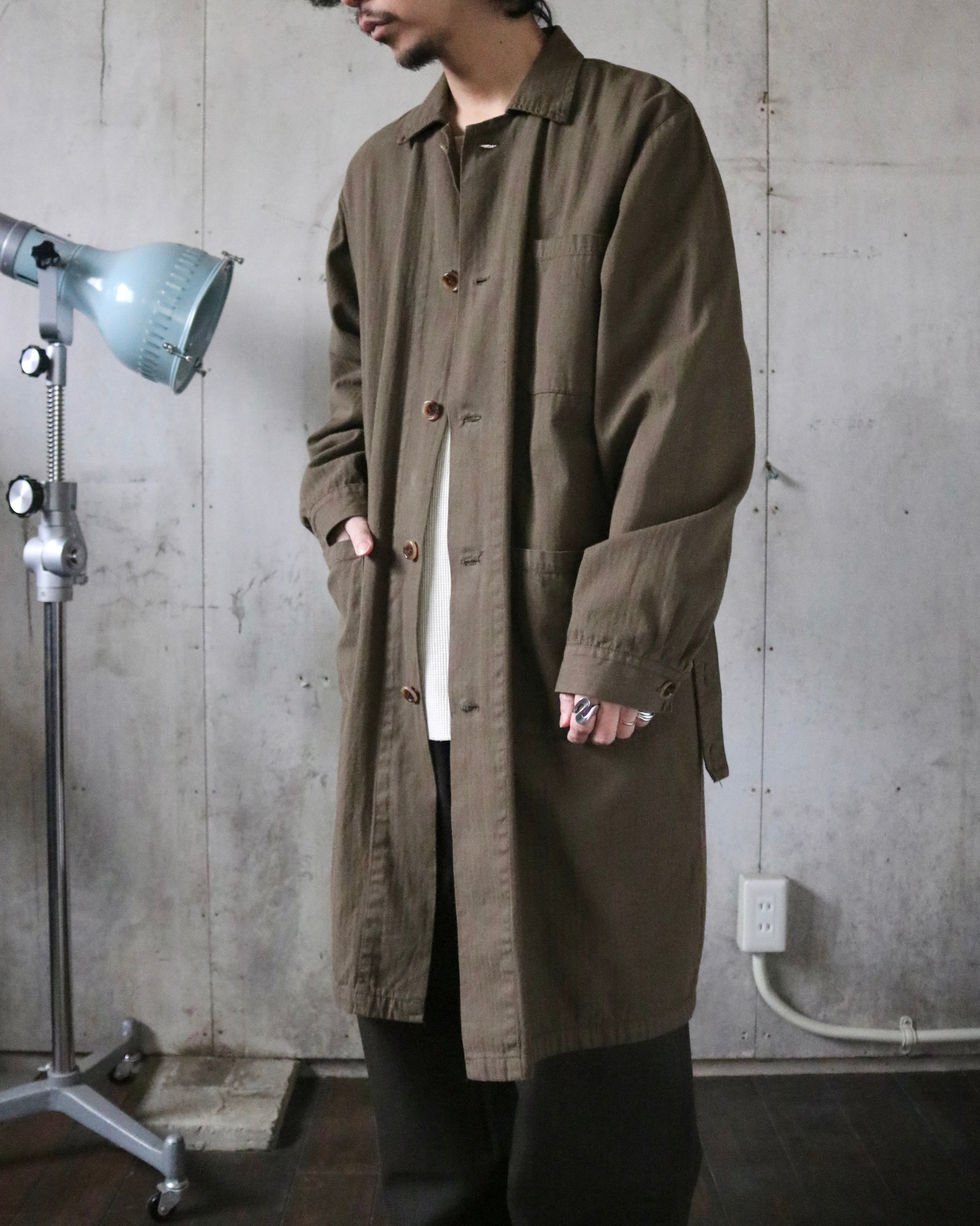 フレンチワークに近い雰囲気を持ちながらも、やや軽さのある生地で柔らかなドレープが出るのが特徴。胸ポケット角丸の3ポケット仕様とロング丈のシルエットで、シンプルながら存在感があります。