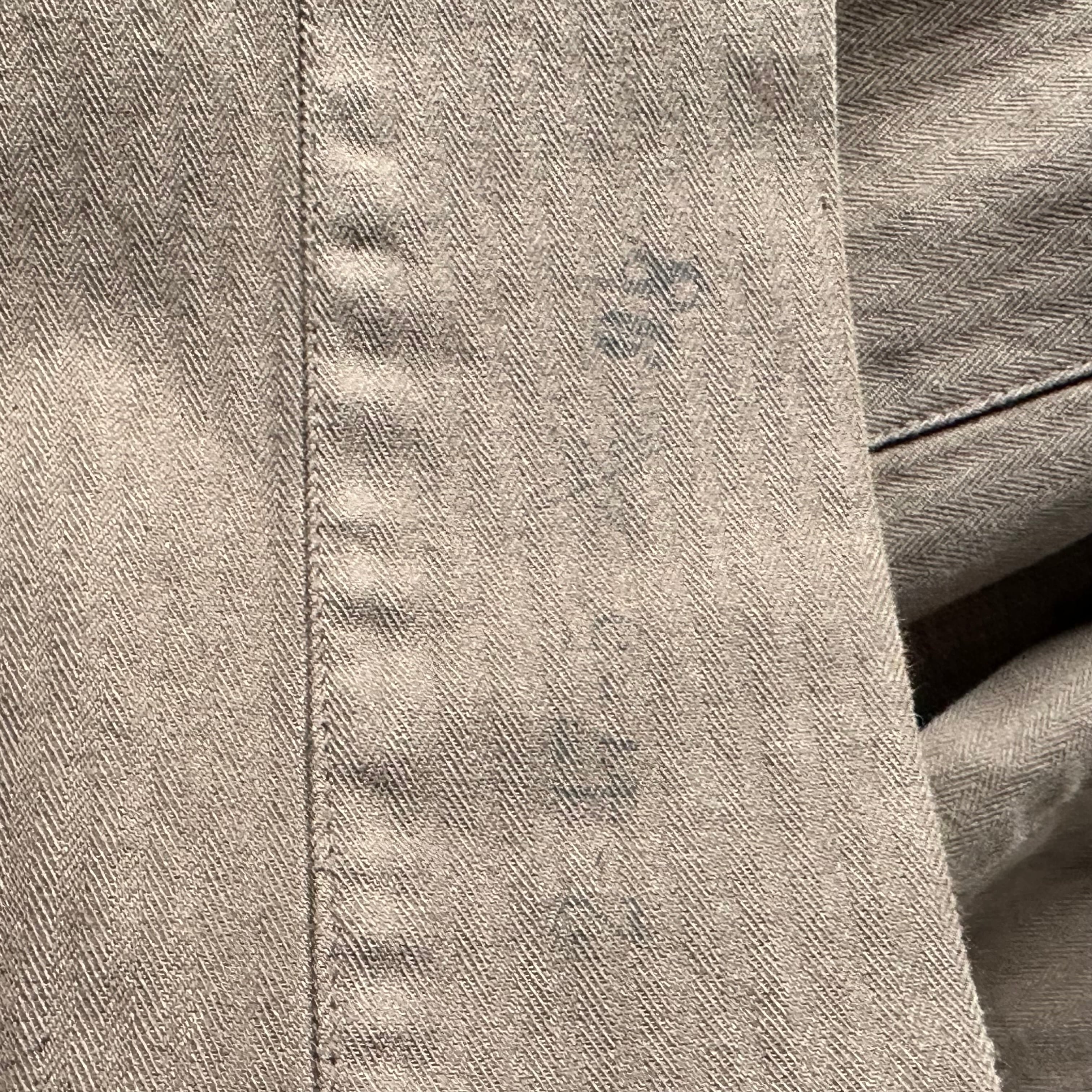 袖内側には工場管理番号と思われるブルーステンシルが入り、ワークウェアらしいディテールも魅力。ユーロワークパンツや軍パン、リネンシャツなどとも相性の良い一着です。