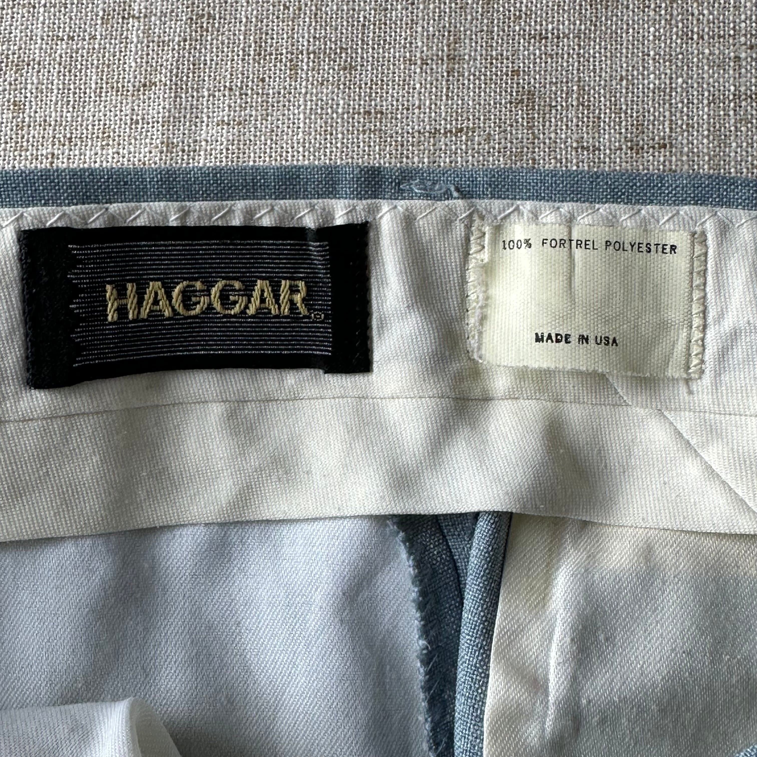 アメリカの老舗ブランド HAGGAR によるスラックス。淡いブルーグレーの色味と、滑らかなポリエステル生地による美しい落ち感が魅力の一本です。