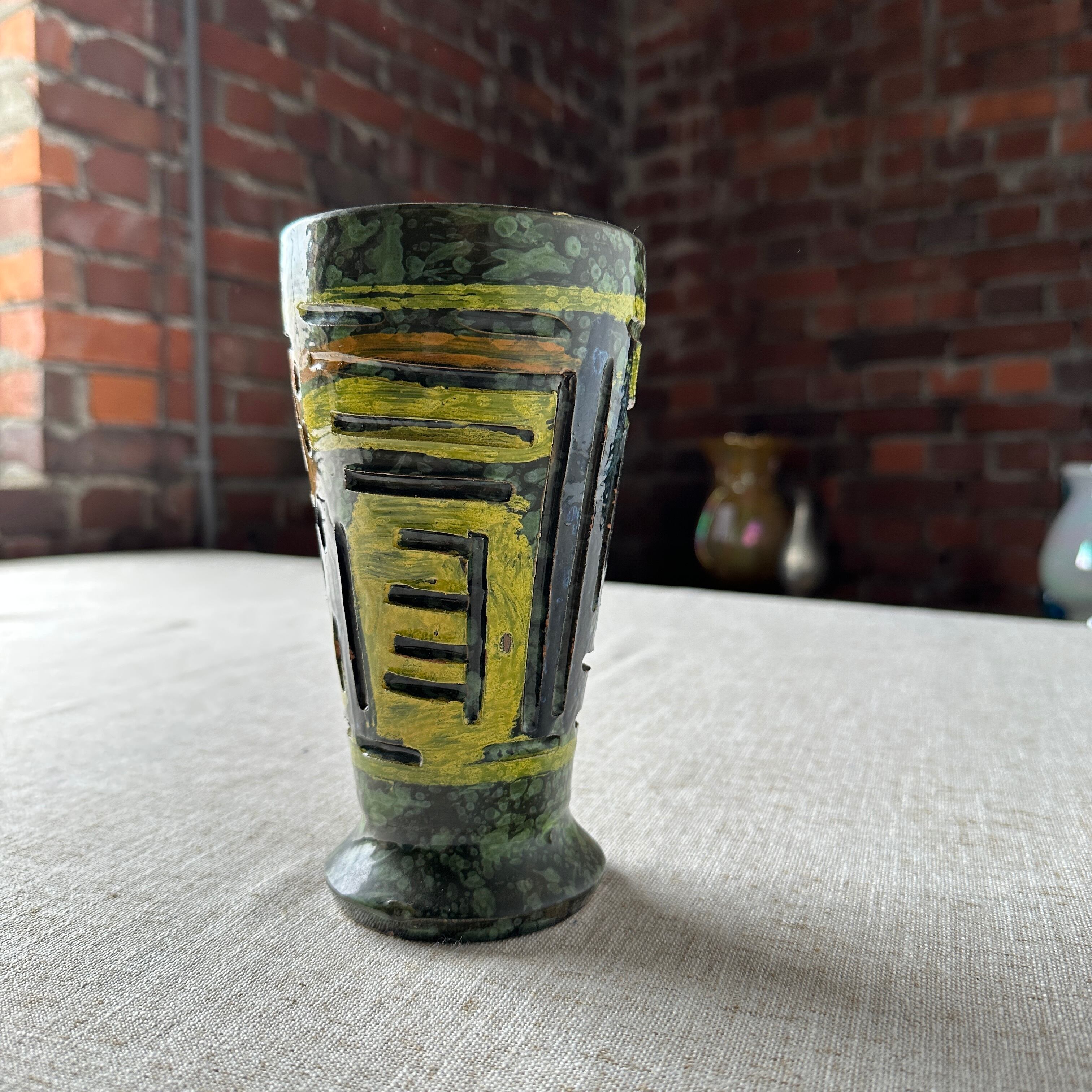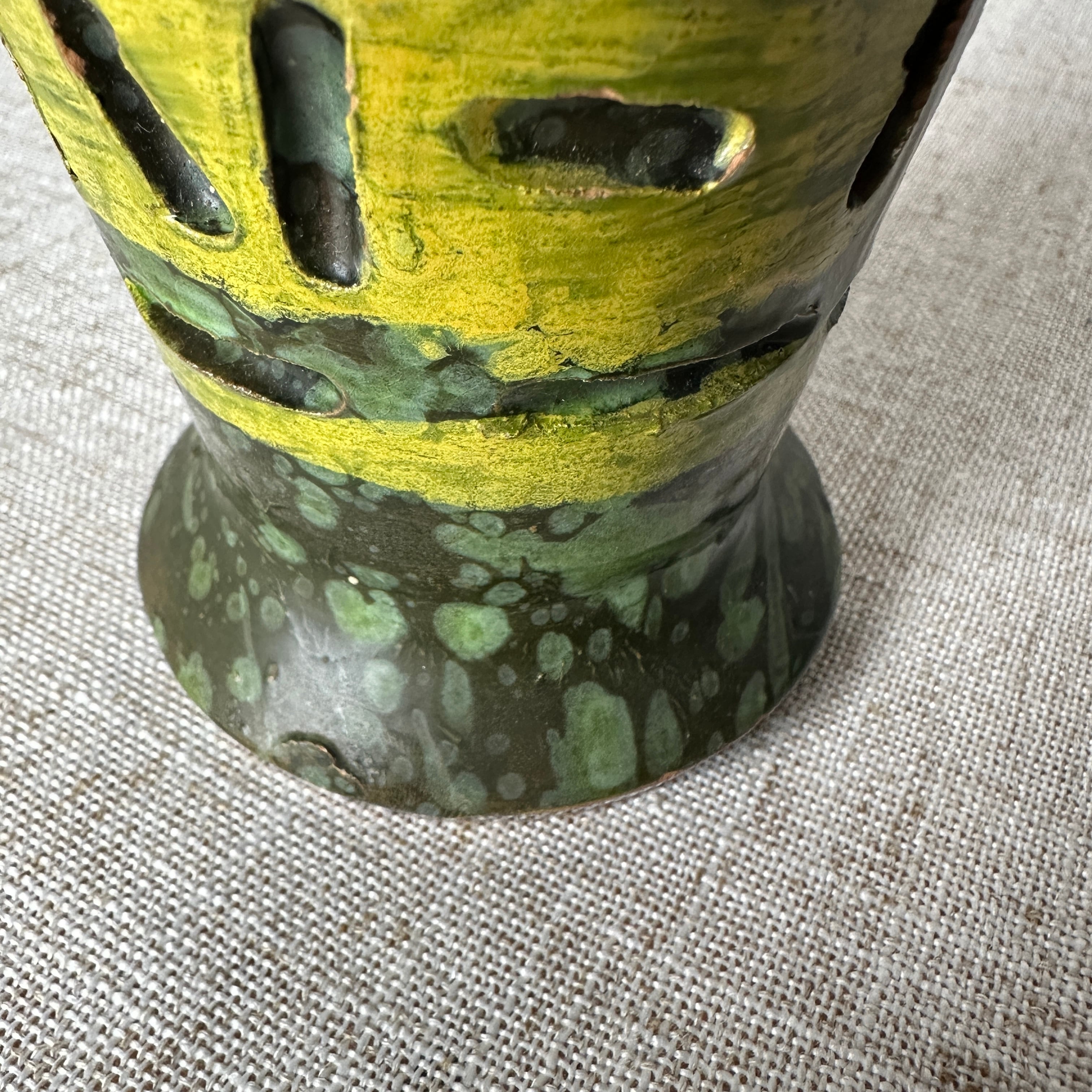 刻みや彫りによる立体的なテクスチャと、マスタードイエローと深みのあるグリーンの配色が印象的な一点。